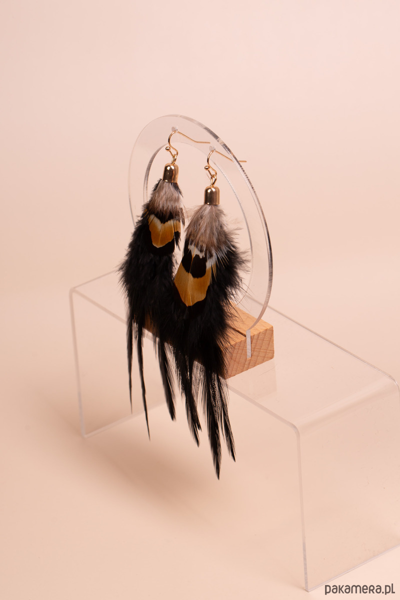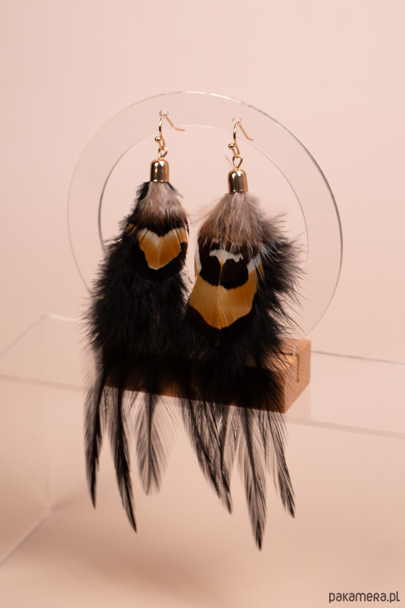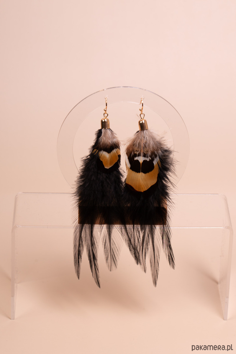Kolczyki o wyrazistym, etnicznym charakterze, wykonane z naturalnych piór w kontrastowych barwach. Czarne, długie pióra nadają całości lekkości i elegancji, a mniejsze pióra w odcieniach brązu i bieli dodają im oryginalnego, dzikiego akcentu. Efektowna forma sprawia, że kolczyki pięknie poruszają się przy każdym ruchu i podkreślają stylizacje w klimacie boho oraz etno.