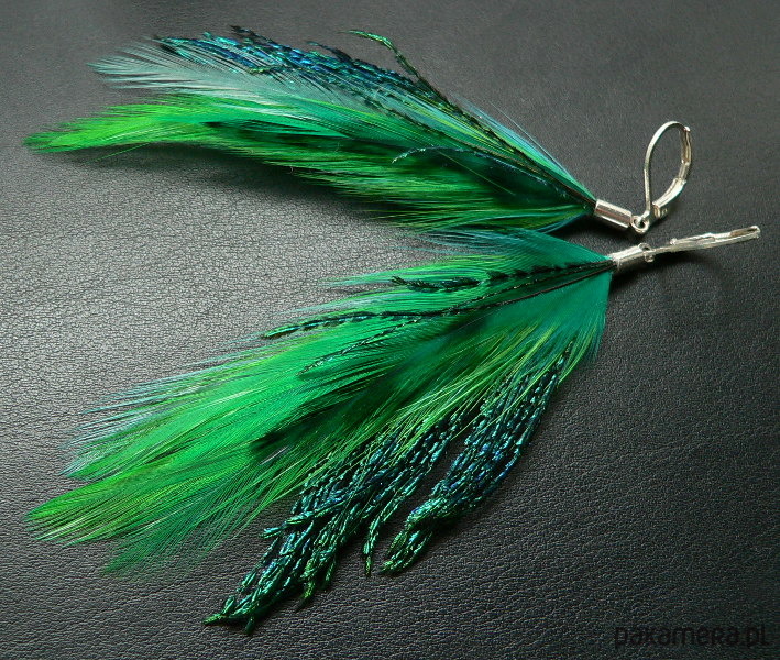 Pióra pawie motyle zielone Stella54,00 zł sprzedane Szczegóły kolczyki wykonane z naturalnych pawich piór mieczowych opalizujących metalicznie, piór w odcieniach zieleni i niebieskiego oraz elementów w kolorze srebra, całkowita długość- 9,5 cm Nr przedmiotu : 2607952 kolczyki z piórami kolczyki damskie