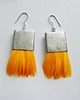 PIÓRKO – stylowy dodatek. Połączenie lekkości piórka i trwałości metalu. Metal niezwykle kontrastuje z naturalnym barwionym puchem. Kolczyki wykonane są z alpaka, naturalnie barwione pióra. Alpaka – zmatowiona. Bigle otwarte – srebro pr.925. Długość z biglami – 6,5 cm. Szerokość – 3 cm.