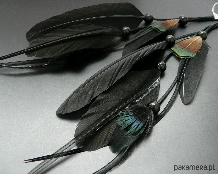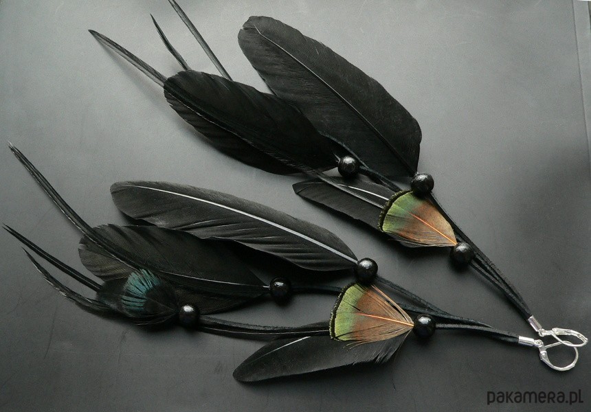 bardzo, bardzo długie kolczyki wykonane z piór, skórzanych rzemieni i elementów w kolorze srebra, w najdłuższym miejscu osiągają 22 cm