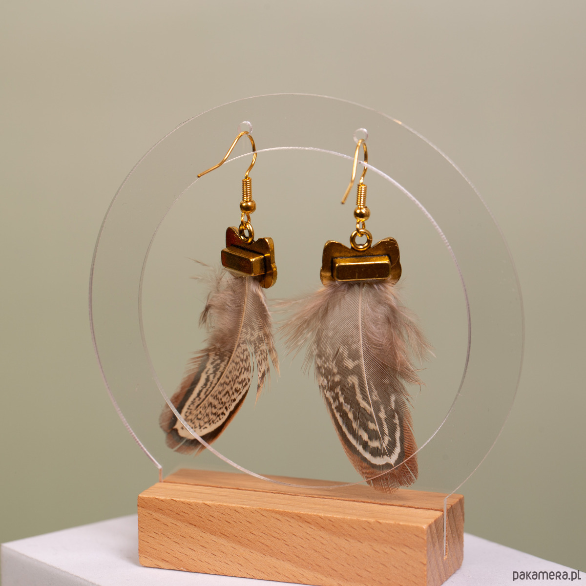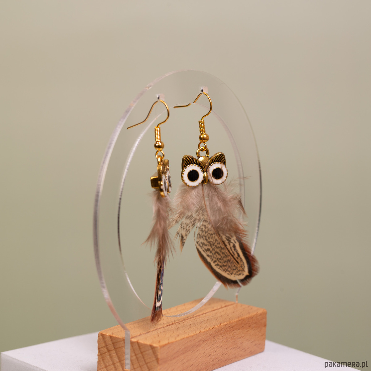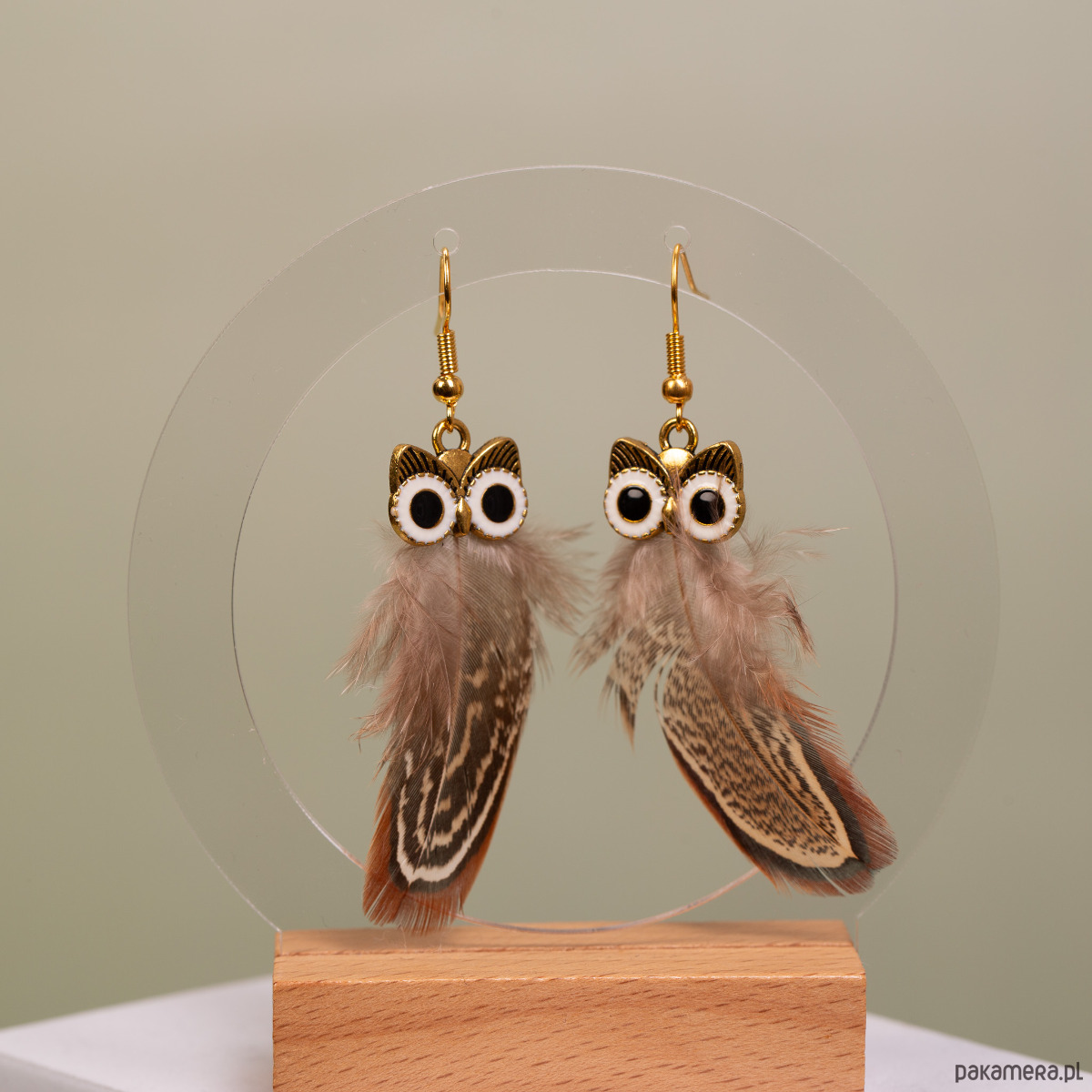 Metal w kolorze złotym · naturalne i barwione pióra (m.in. pawie, bażancie) · zapięcie typu haczyk francuski · motyw: sowa