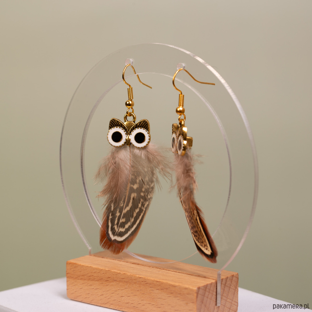 Oryginalne kolczyki z naturalnych i barwionych piór, ozdobione motywem sów. Lekkie i efektowne, stanowią wyrazisty dodatek do wielu stylizacji. Dzięki wykorzystaniu naturalnych piór każda para może nieznacznie różnić się od prezentowanej na zdjęciu.