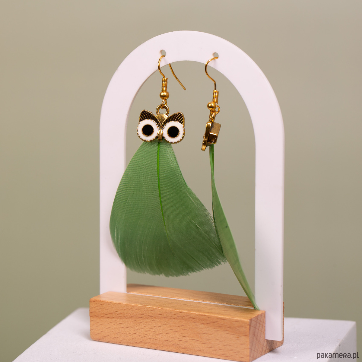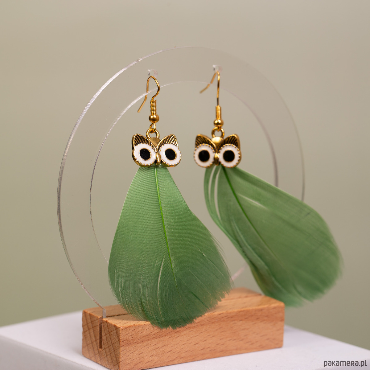 Oryginalne kolczyki z naturalnych i barwionych piór, ozdobione motywem sów. Lekkie i efektowne, stanowią wyrazisty dodatek do wielu stylizacji. Dzięki wykorzystaniu naturalnych piór każda para może nieznacznie różnić się od prezentowanej na zdjęciu.