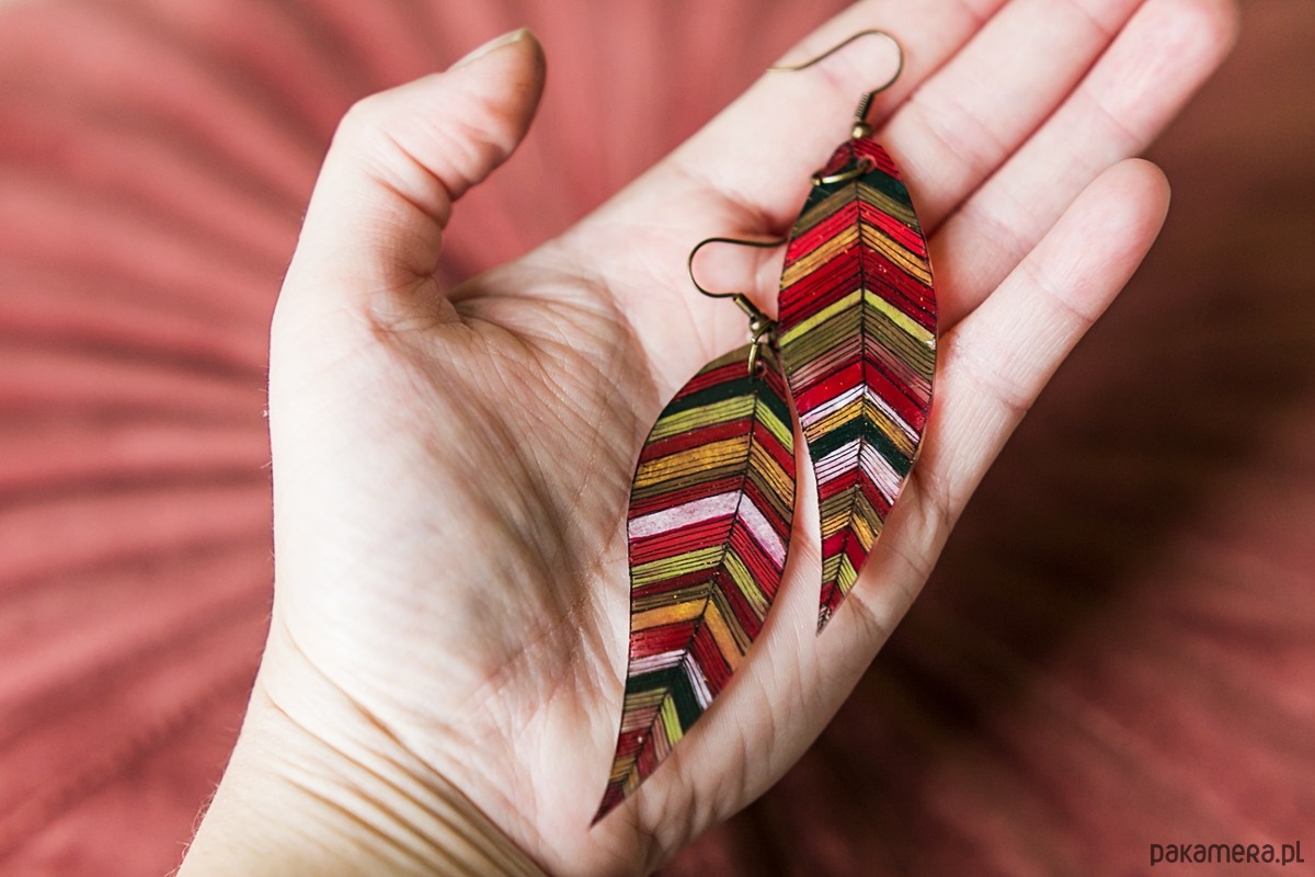 Powierzchnia listków została zabezpieczona kilkoma warstwami błyszczącego lakieru ekologicznego, dzięki czemu kolczyki ładnie mienią się w słońcu.