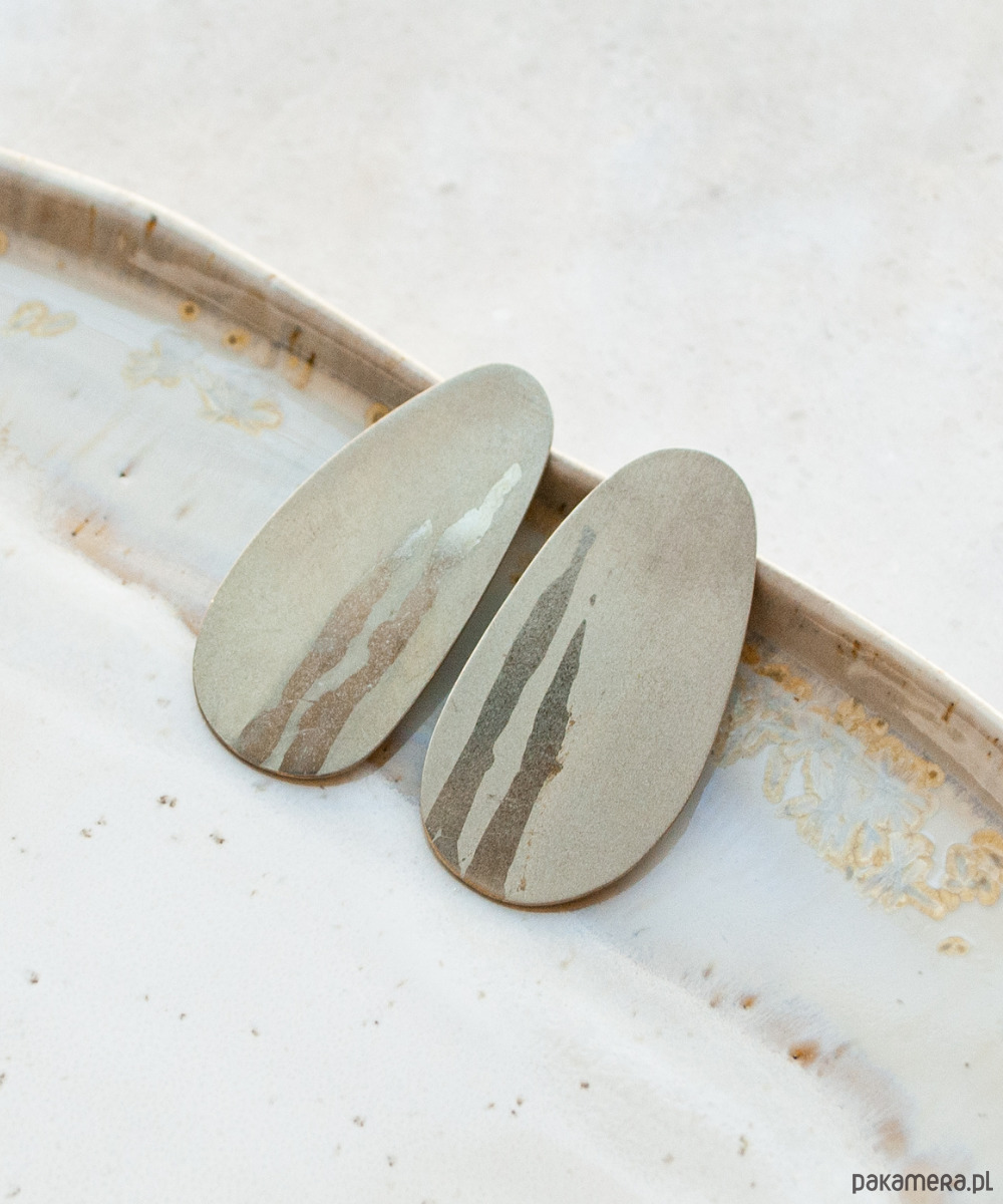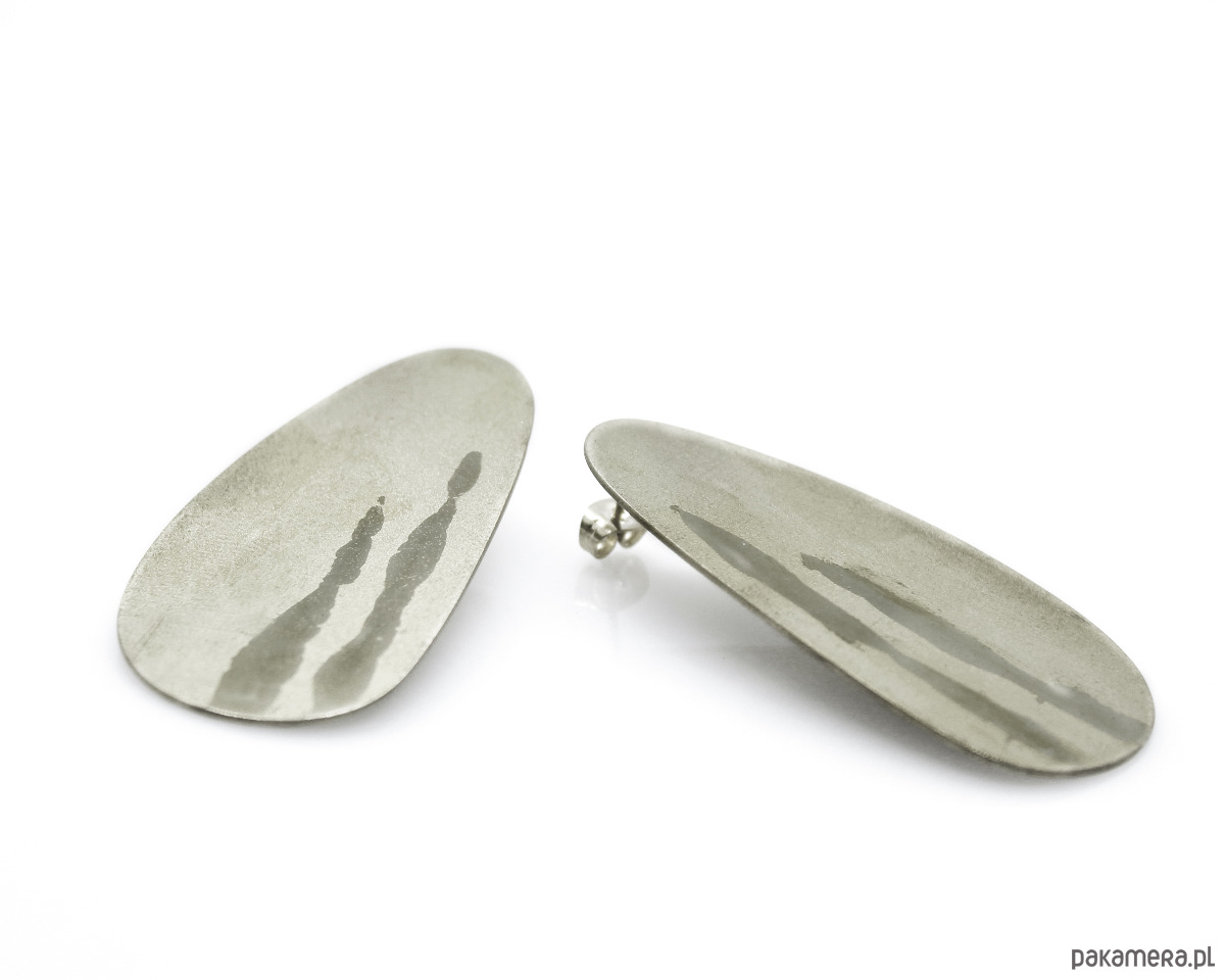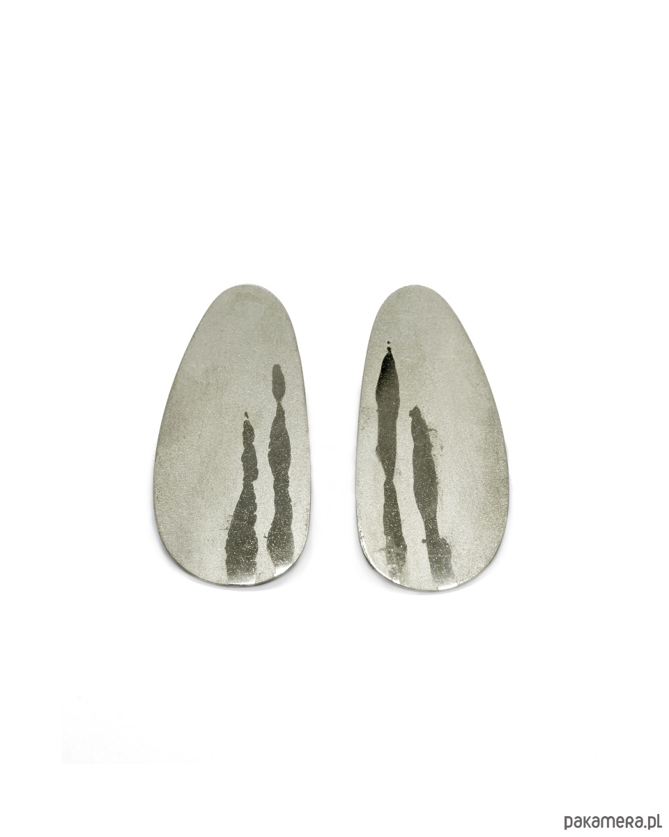 Efektowne kolczyki z serii PLAMA. Wykonane graficzną techniką trawienia. Wzory nadają lekko drapieżny charakter, reszta kolczyka ma delikatnie błyszczące, proszkowe wykończenie. Organiczny kształt pięknie komponuje się z liniami twarzy.