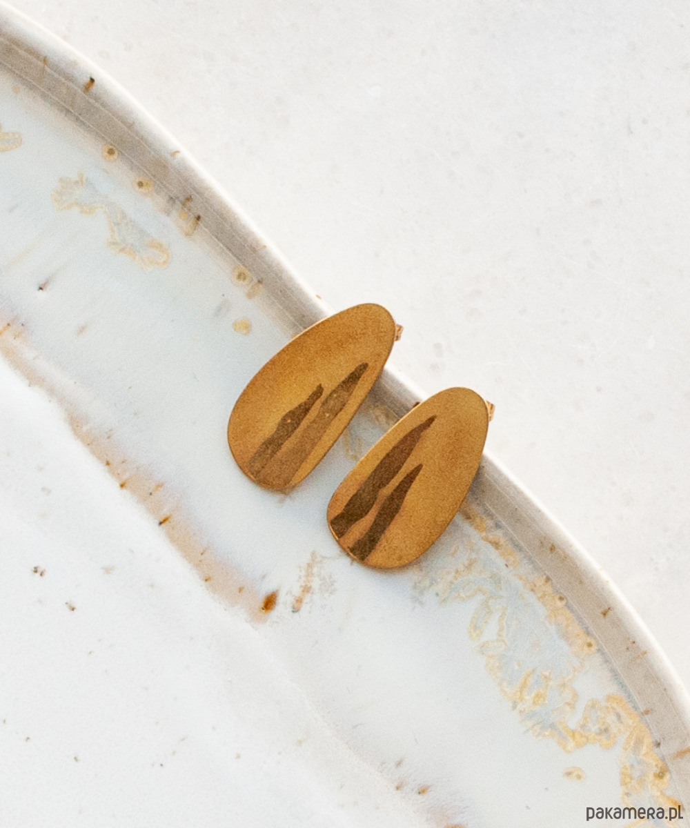 Efektowne kolczyki z serii PLAMA. Wykonane graficzną techniką trawienia. Wzory nadają lekko drapieżny charakter, reszta kolczyka ma delikatnie błyszczące, proszkowe wykończenie. Organiczny kształt pięknie komponuje się z liniami twarzy.
