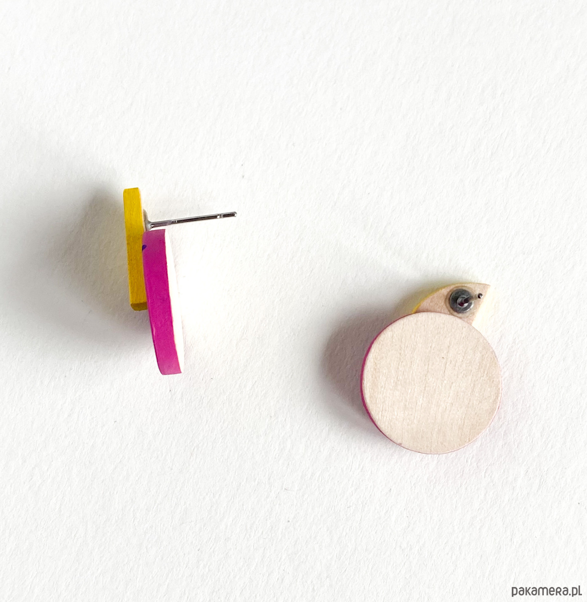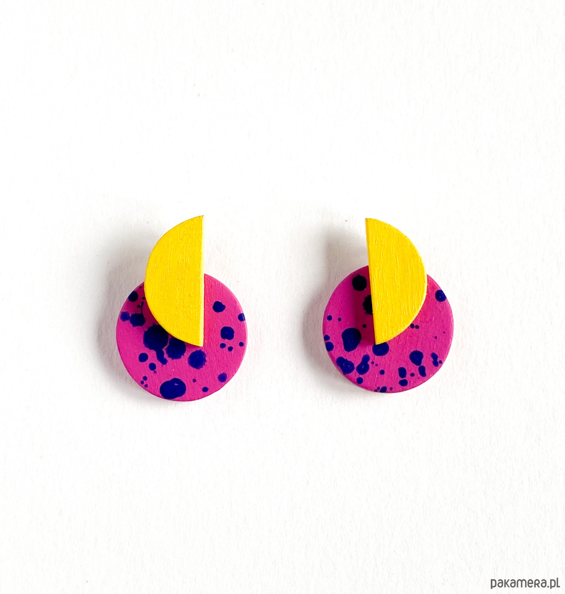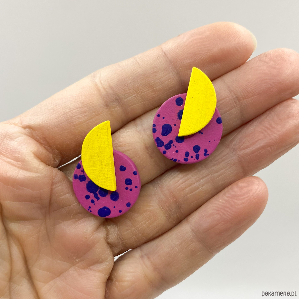 Kolczyki Plamki są bardzo lekkie i delikatne, zostały wykonane ręcznie z drewna brzozowego. Pokryte są farbą akrylową oraz bezbarwnym, matowym lakierem wodnym.