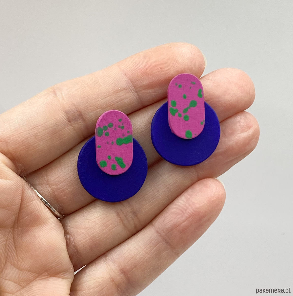 Kolczyki Plamki są bardzo lekkie i delikatne, zostały wykonane ręcznie z drewna brzozowego. Pokryte są farbą akrylową oraz bezbarwnym, matowym lakierem wodnym.