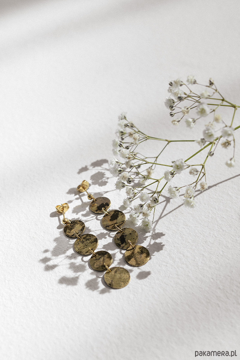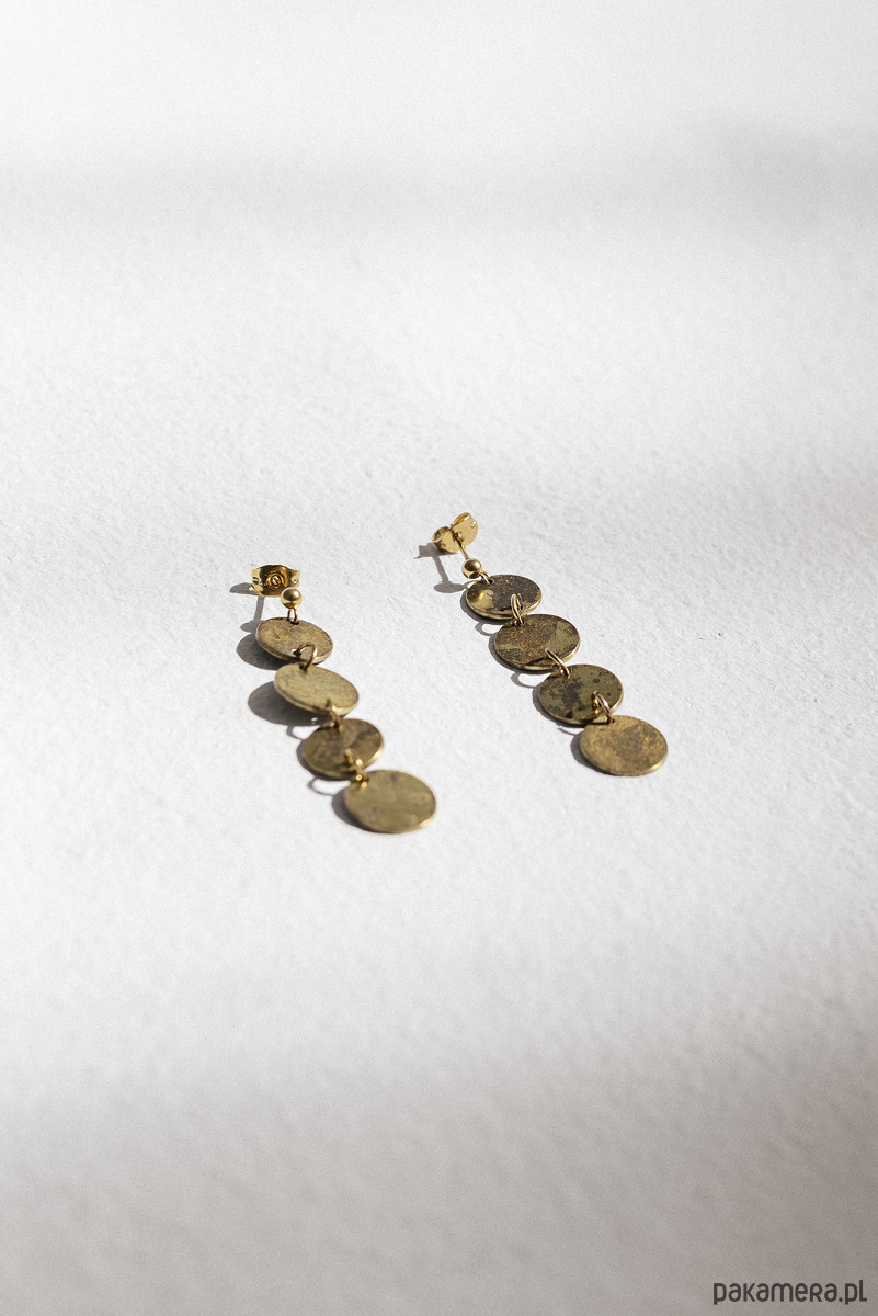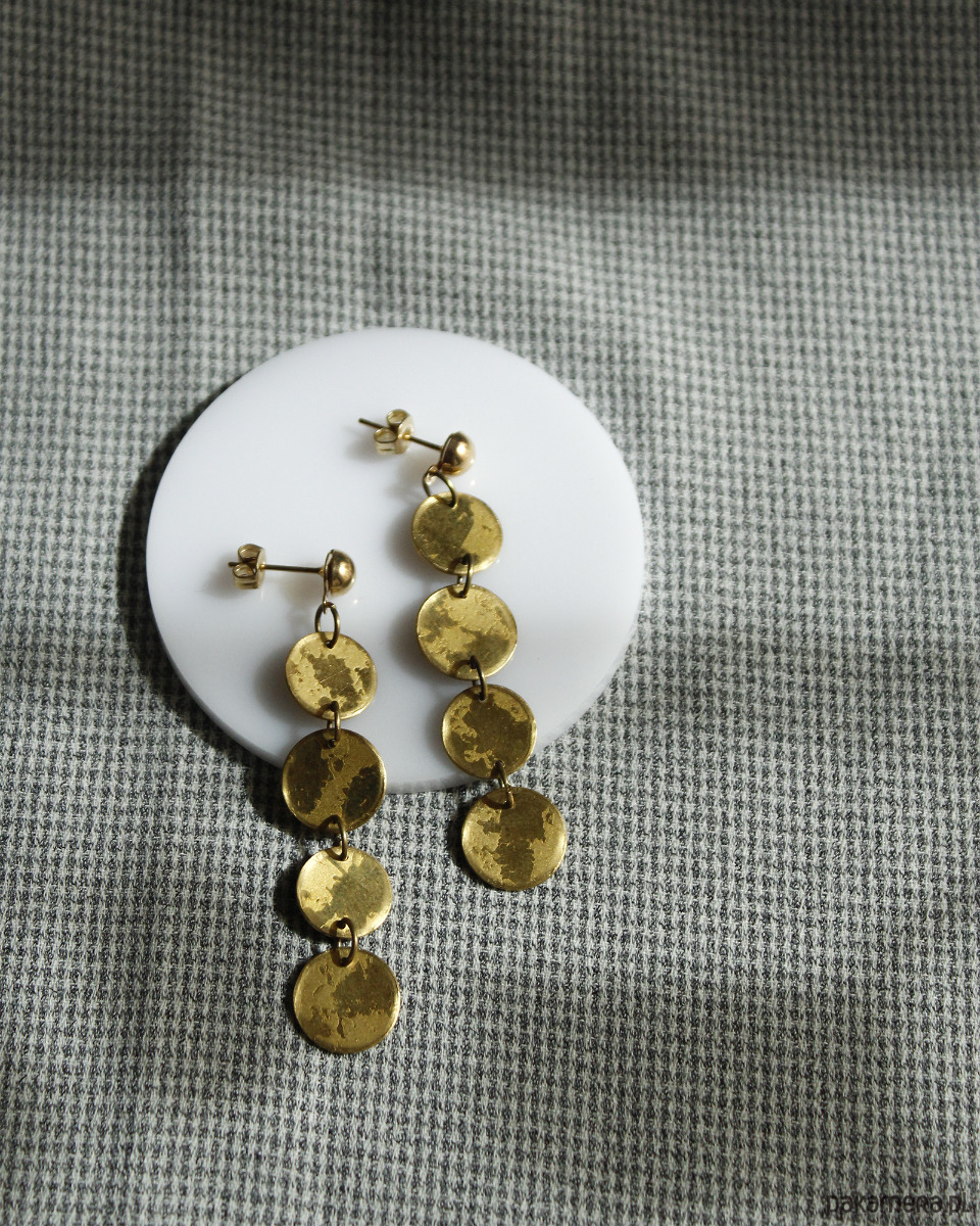 Eleganckie kolczyki o subtelnym, trawionym wzorze. Delikatnie pobłyskują w ruchu. Kolczyki składają się z czterech ruchomych elementów - kółeczek.