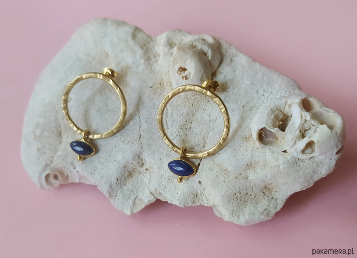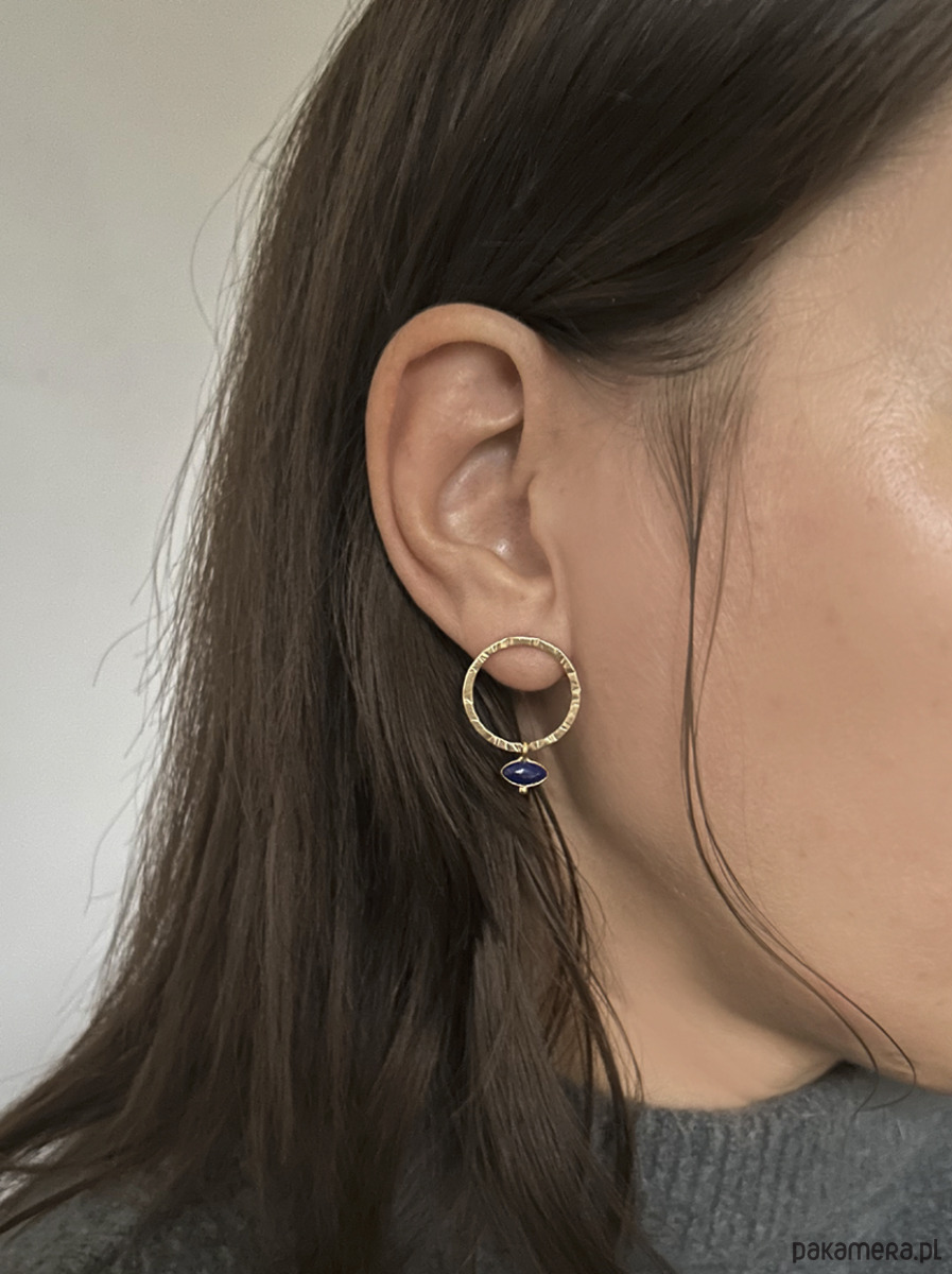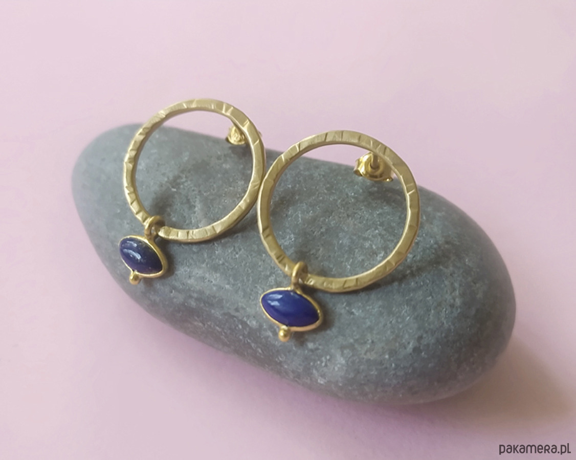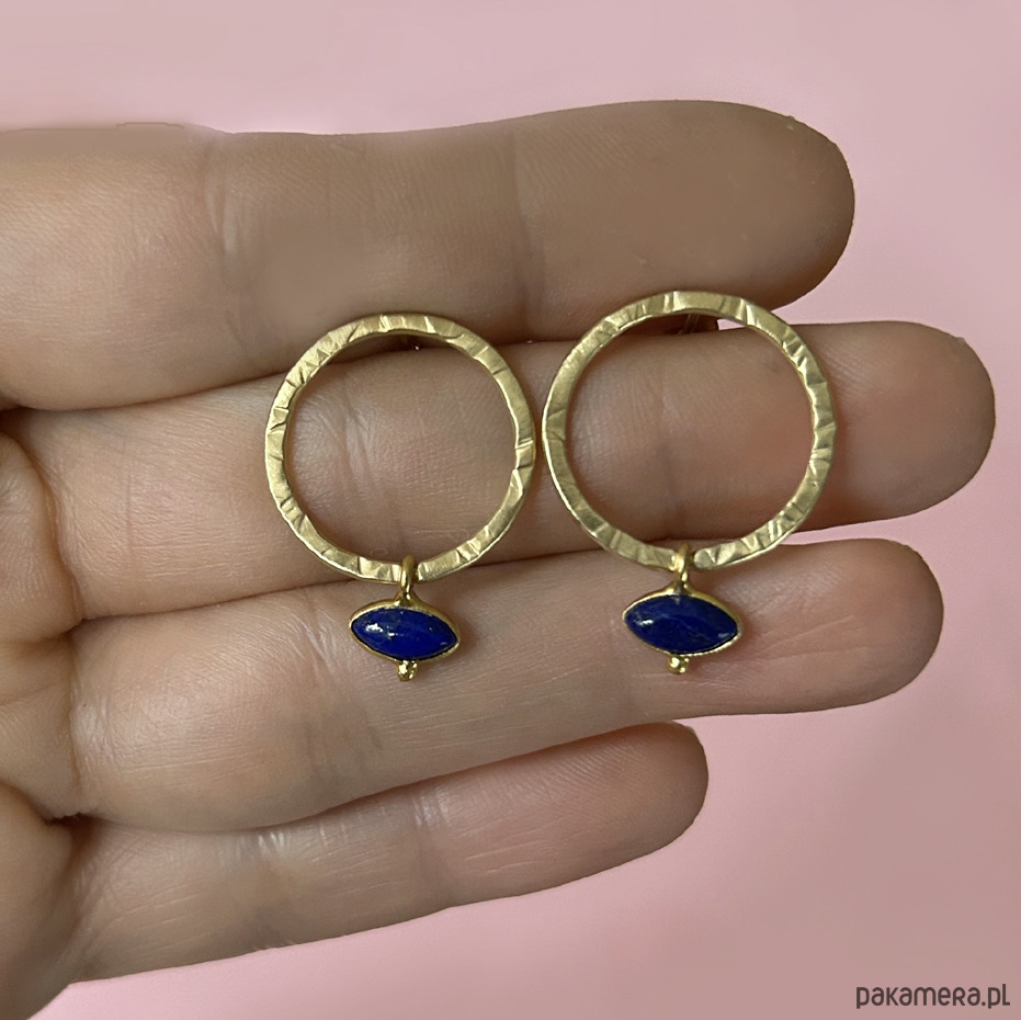 Okrągłe kolczyki wykonane w całości ręcznie ze srebra pr. 925 pokryte 24K złotem oraz naturalnego kamienia Lapis Lazuli w oprawie.