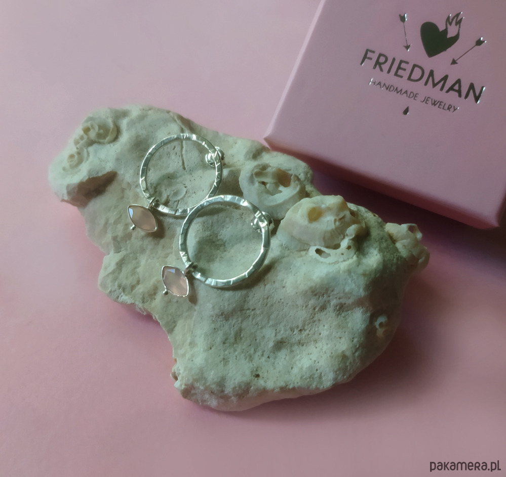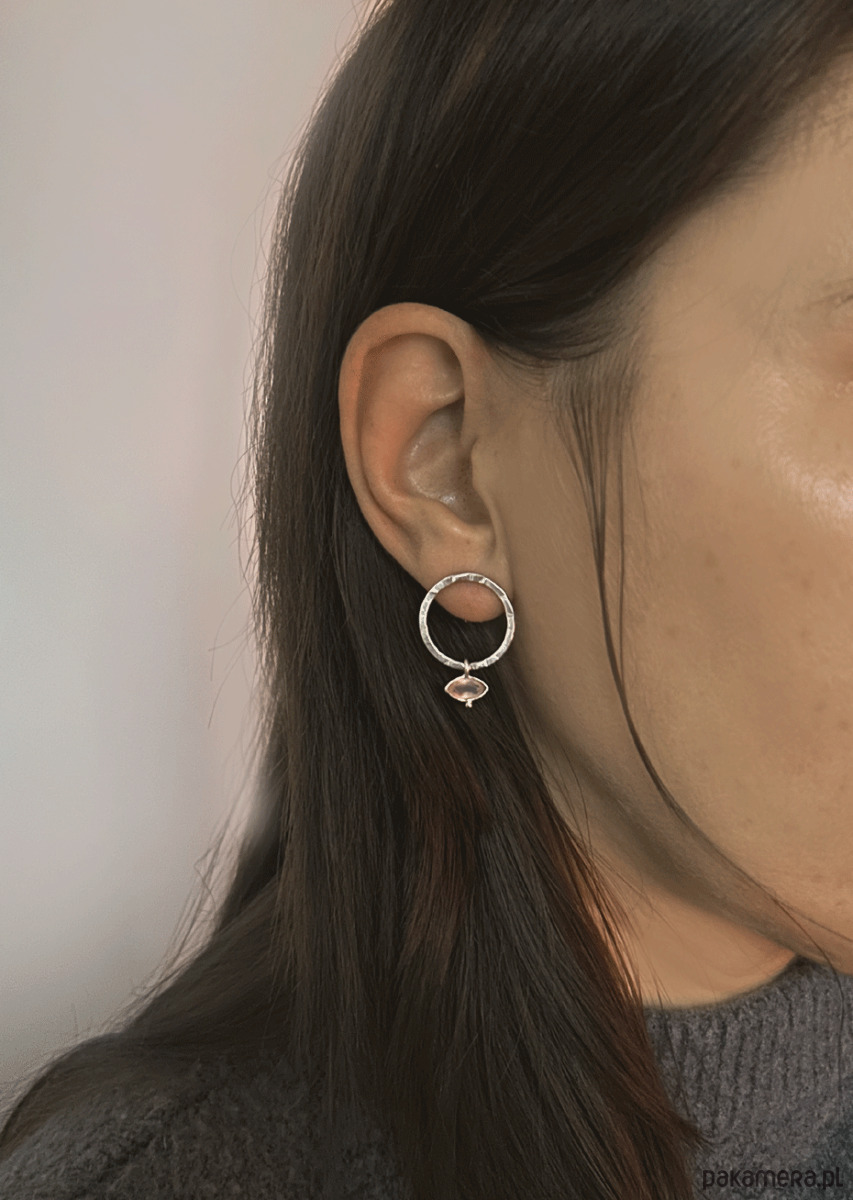 Okrągłe kolczyki wykonane w całości ręcznie ze srebra pr. 925 oraz naturalnego kamienia w oprawie - różowy kryształ górski.