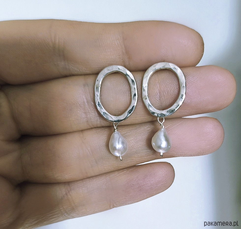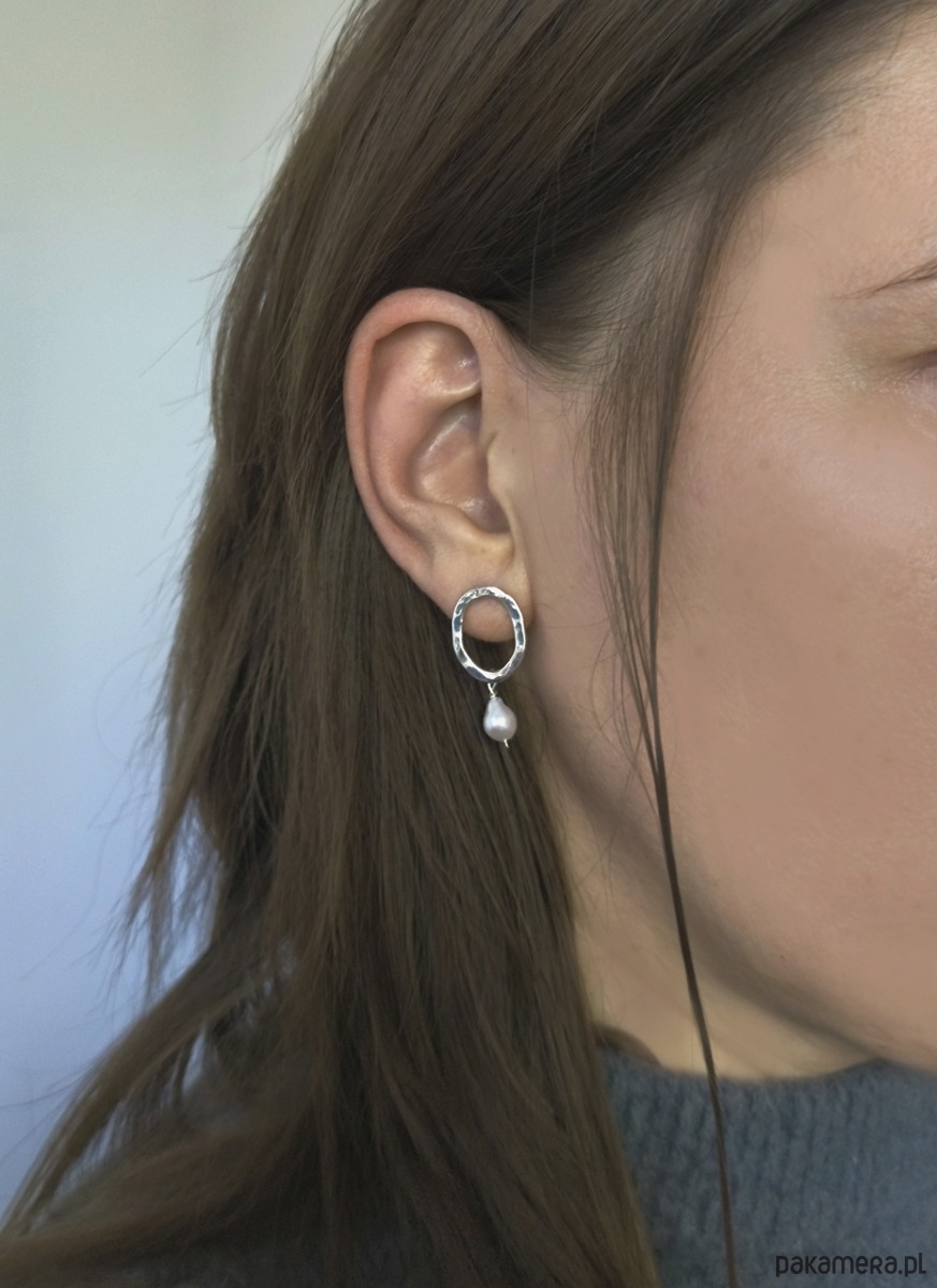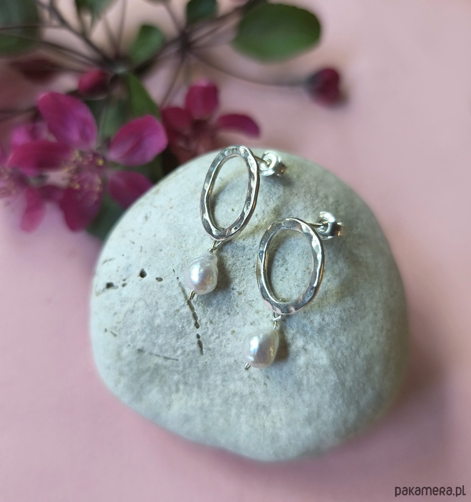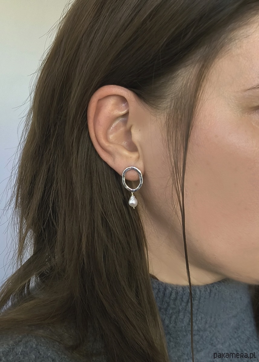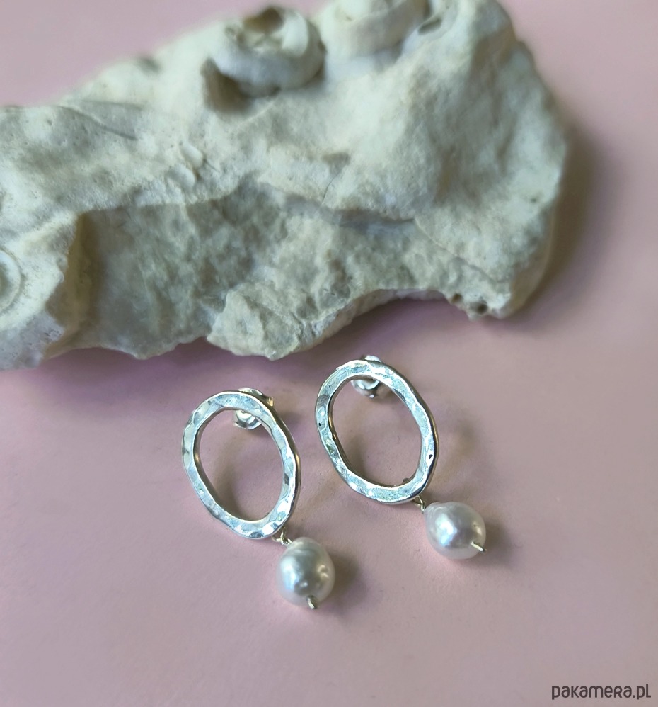 Okrągłe kolczyki, w całości wykonane ręcznie ze srebra próby 925 i ozdobione naturalnymi perłami. Młotkowana powierzchnia nadaje im fakturę, która pięknie odbija światło i podkreśla ich niepowtarzalny charakter.