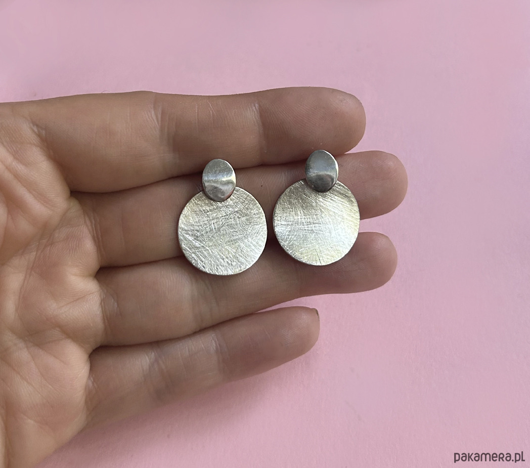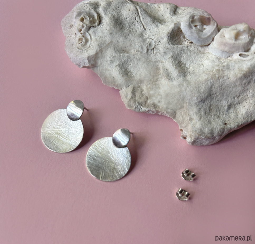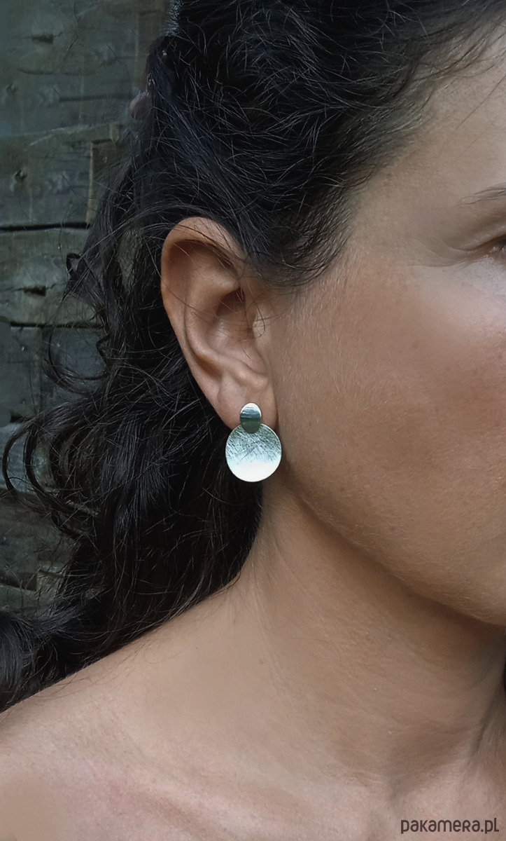 Okrągłe kolczyki w całości wykonane ręcznie ze srebra próby 925. Składają się z dwóch ruchomo połączonych elementów — górna część została wypolerowana na wysoki połysk, natomiast dolna jest matowa i ozdobiona subtelną fakturą, która pięknie odbija światło i nadaje kolczykom wyjątkowego charakteru.