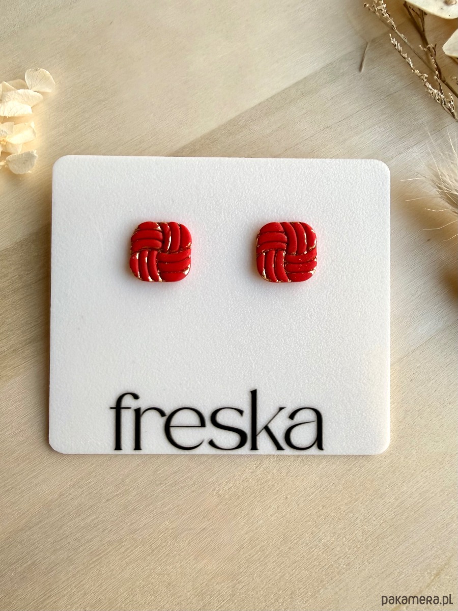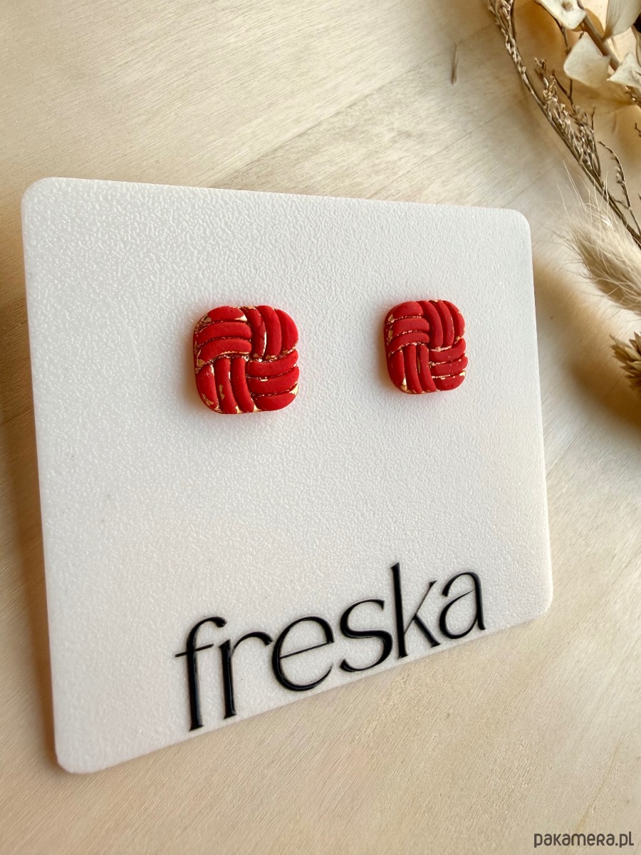 Geometryczna klasyka w energetycznym wydaniu – czerwone, plecione kwadraty pięknie ożywią zarówno codzienne, jak i bardziej eleganckie stylizacje. Wypukła struktura przeplatanych paseczków gliny polimerowej podkreślona jest złotymi akcentami na brzegach, a całość osadzono na bazie ze stali chirurgicznej, przyjaznej także dla wrażliwych uszu.