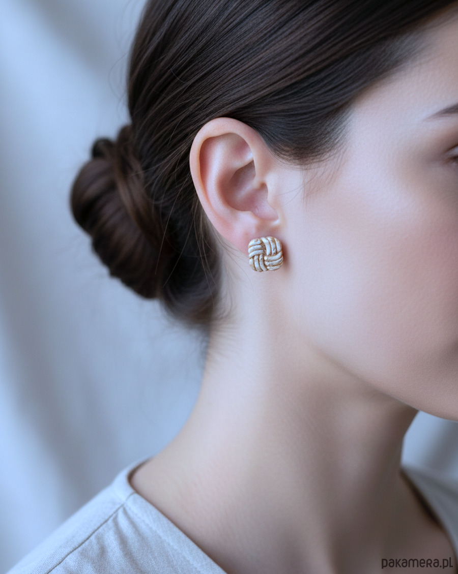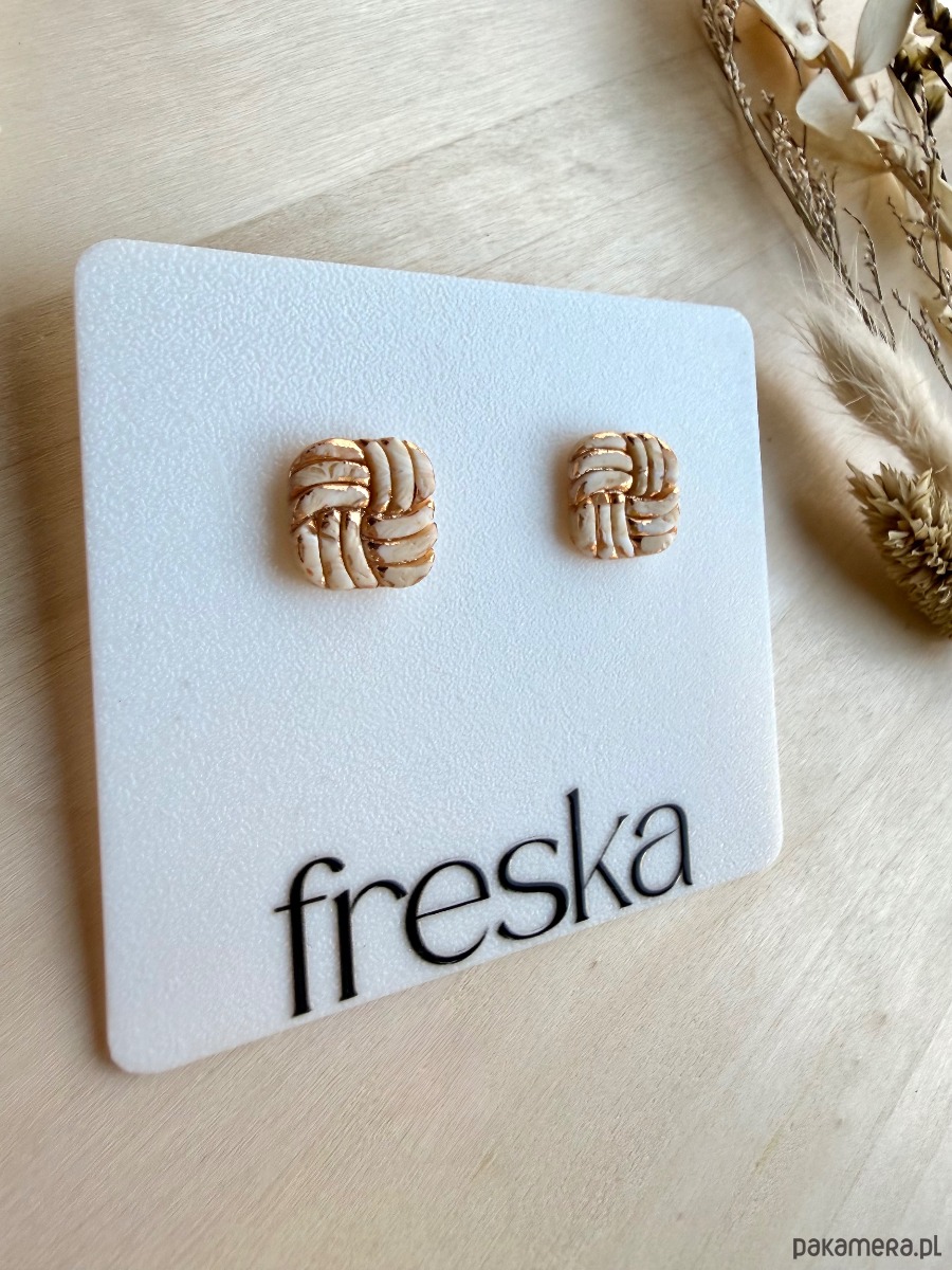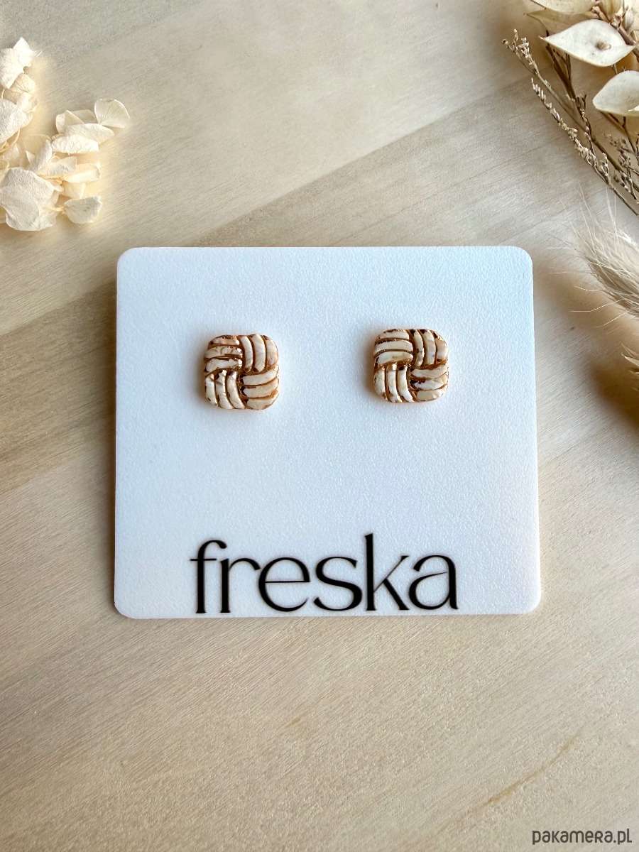 Subtelnie eleganckie, plecione kwadraty w piaskowym odcieniu to idealny wybór dla fanek stonowanej, ale nietuzinkowej biżuterii. Delikatna struktura przeplatanych paseczków gliny polimerowej została muśnięta złotem, co nadaje całości szlachetnego charakteru, a baza ze stali chirurgicznej zapewnia komfort noszenia przez cały dzień.