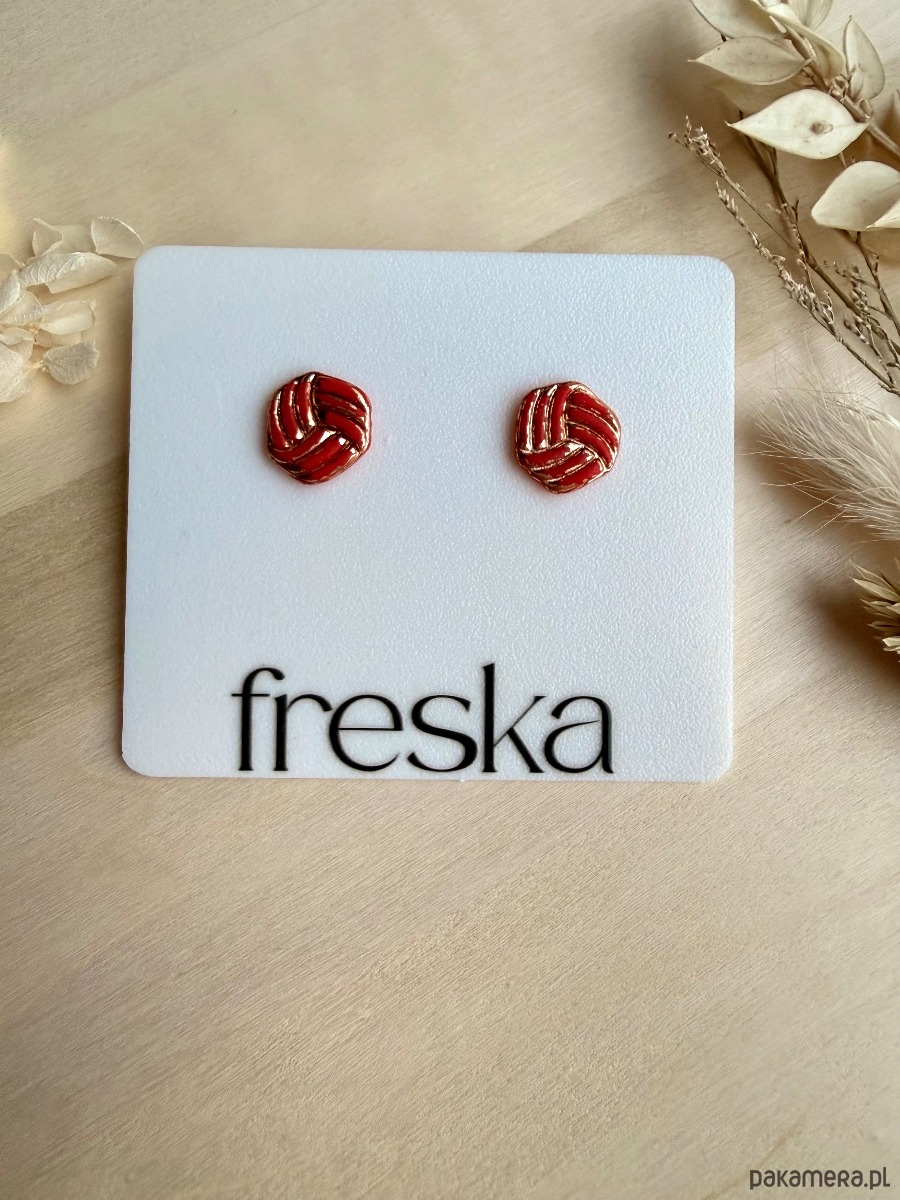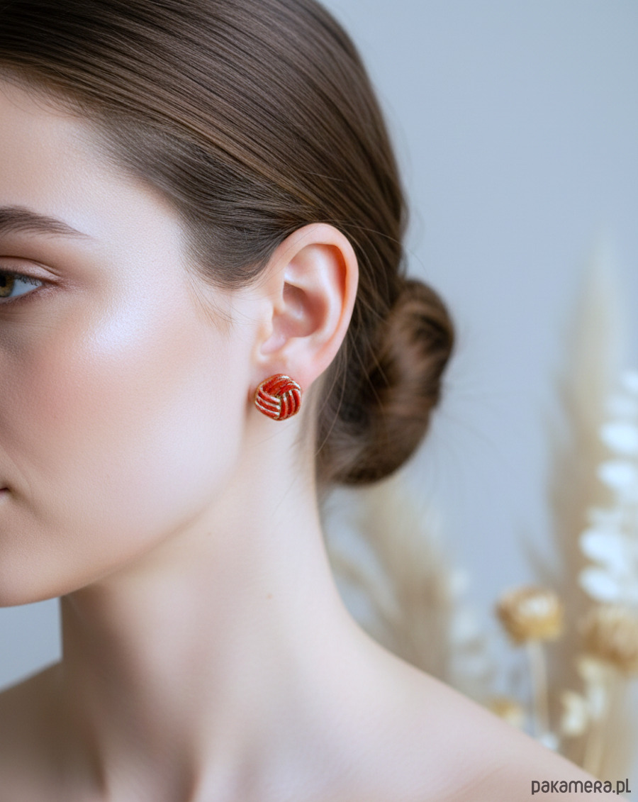 Dodaj energiczny, nieco retro akcent do swoich stylizacji z ręcznie wykonanymi kolczykami w odcieniu głębokiej czerwieni! Geometryczny kształt z przeplatanym wzorem i złotymi liniami pięknie odbija światło i świetnie uzupełni zarówno codzienne, jak i wieczorowe zestawy.