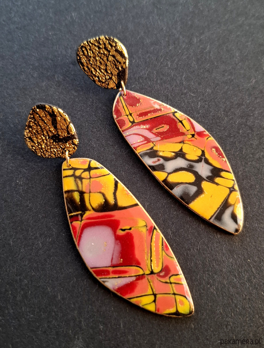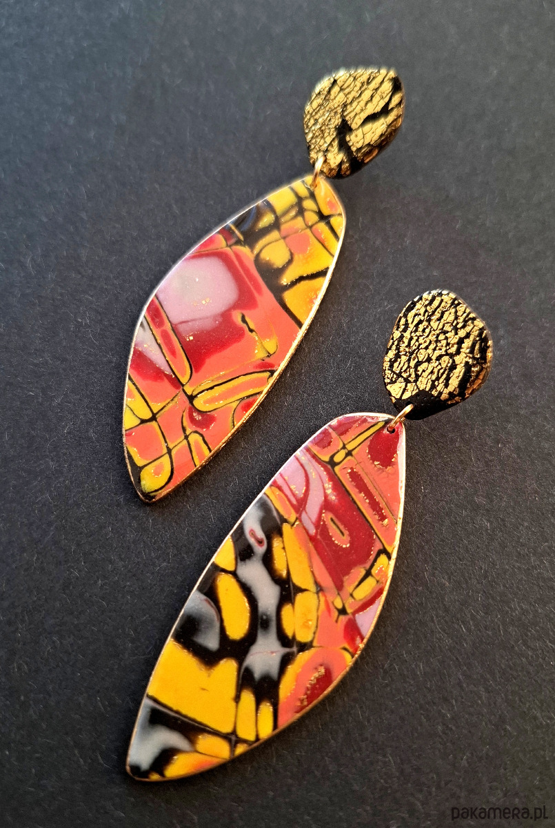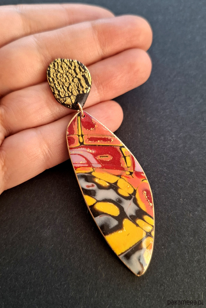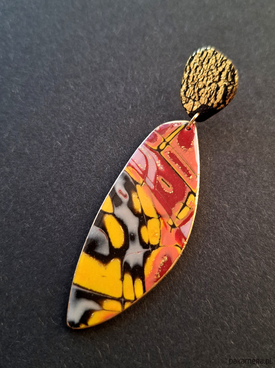 Wyraziste kolczyki na sztyfty wykonane z wysokiej jakości glinki polimerowej. Jednostronne z pozłacanymi, nieuczulającymi sztyftami. Wymiary: długość wraz z zapięciem: 8 cm; szerokość max. 2,3 cm. Wykonane w jedynym egzemplarzu.