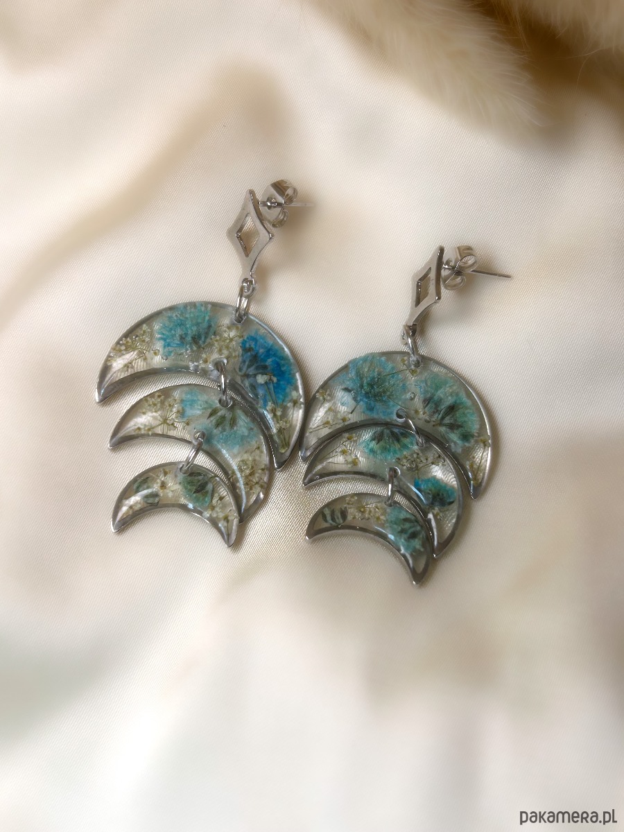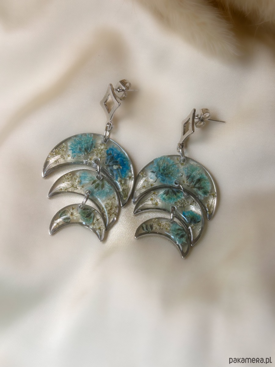 Te kolczyki to subtelne połączenie natury i symboliki księżyca — pełen delikatności, kobiecej energii i ukrytej mocy. W trzech srebrzystych półksiężycach zatopiłam maleńkie kwiaty gipsówki i dzikiej marchwi – roślin, które od wieków symbolizują czystość, ochronę i wewnętrzną harmonię.