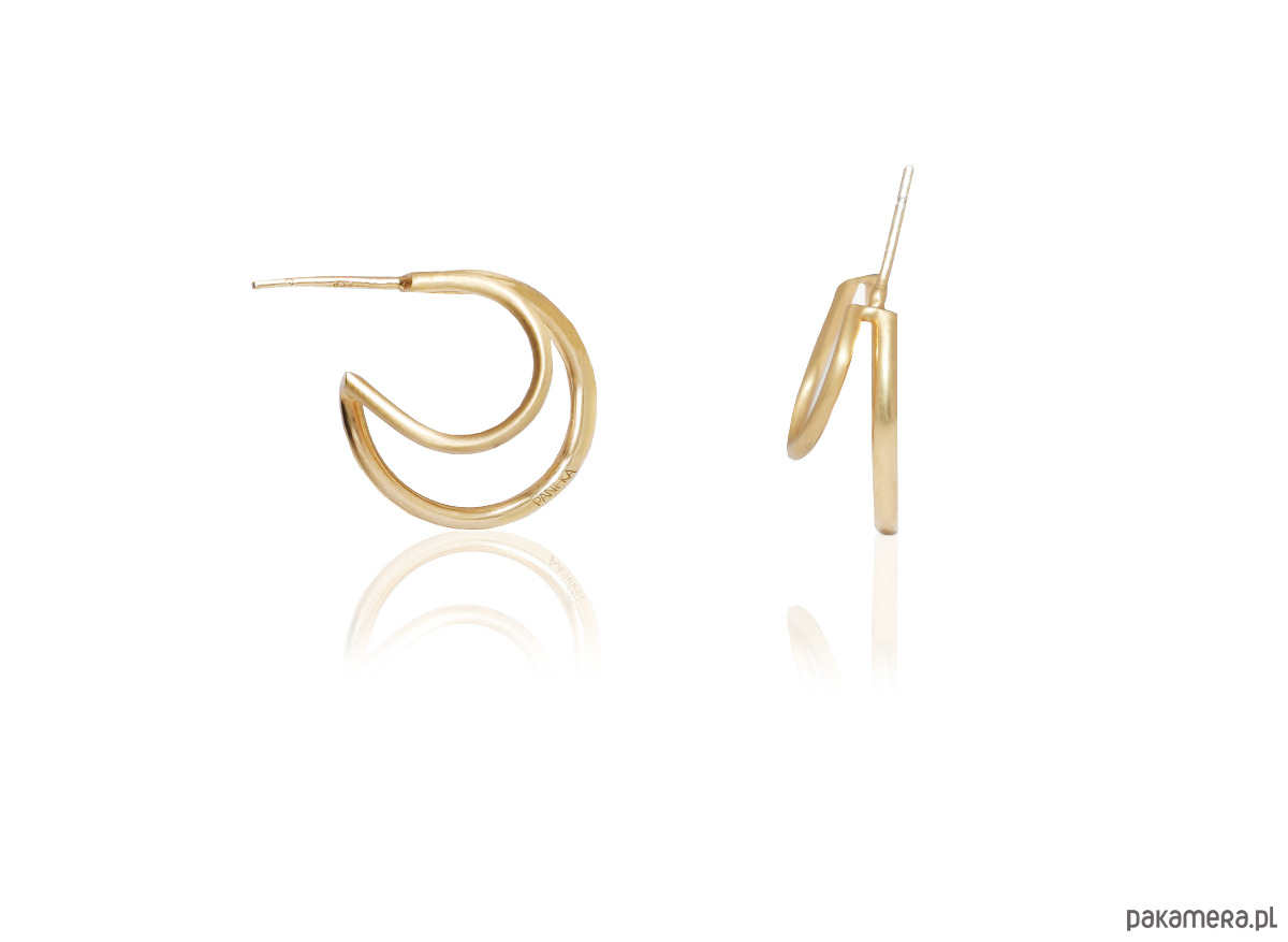 Podwójne kolczyki zapinane na sztyft. Z profilu forma nawiązuje do księżyca. Wykonane ręcznie ze złoconego srebra w Polsce i zapakowane w firmowe pudełko.