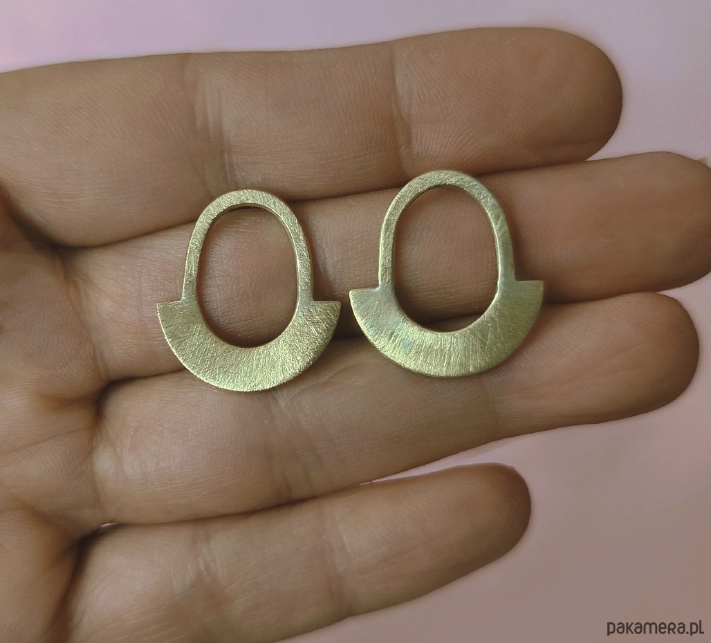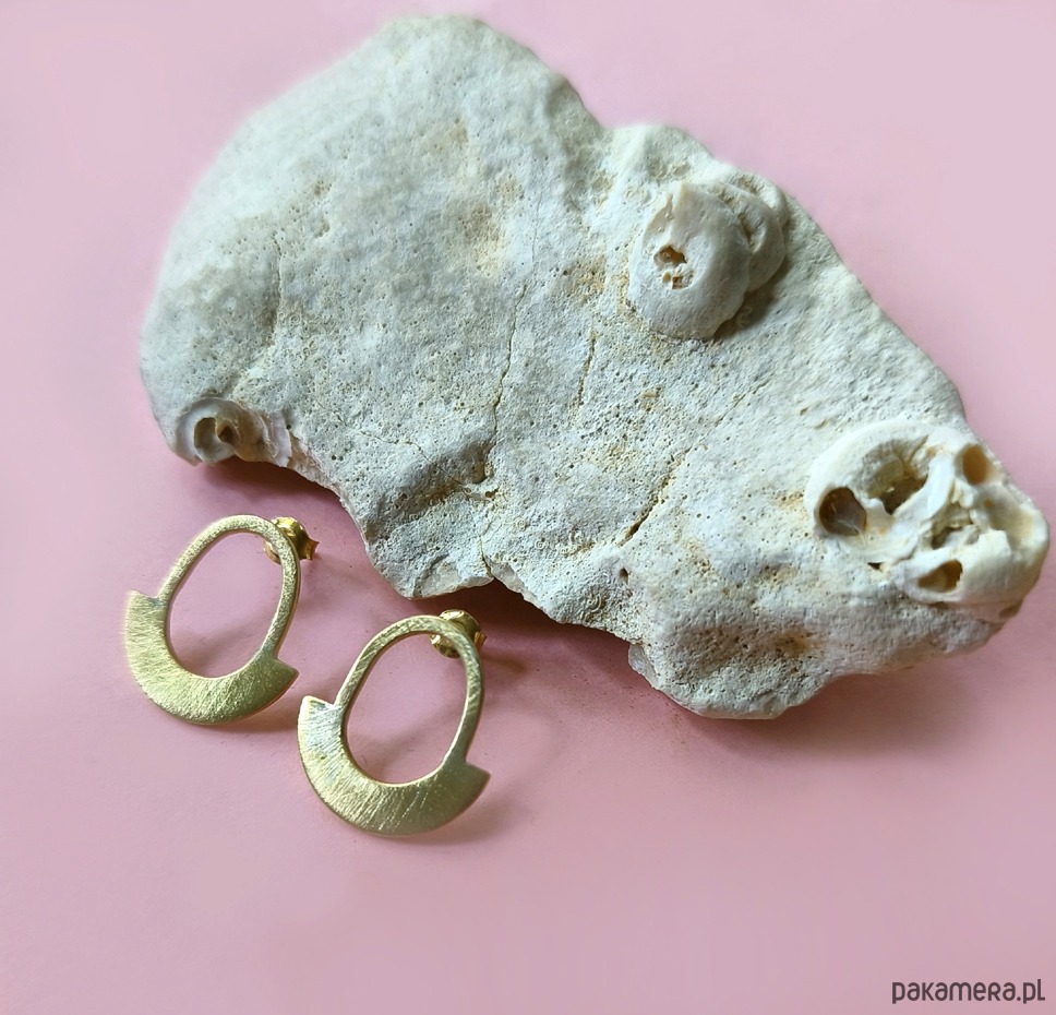 Kolczyki wykonane w całości ręcznie zze srebra próby 925 oraz mosiądzu, pokrytego wysokiej jakości 24-karatowym złotem. Ich matowa powierzchnia o wyraźnej fakturze sprawia, że pięknie odbijają światło, nadając całości wyjątkowy, oryginalny charakter.