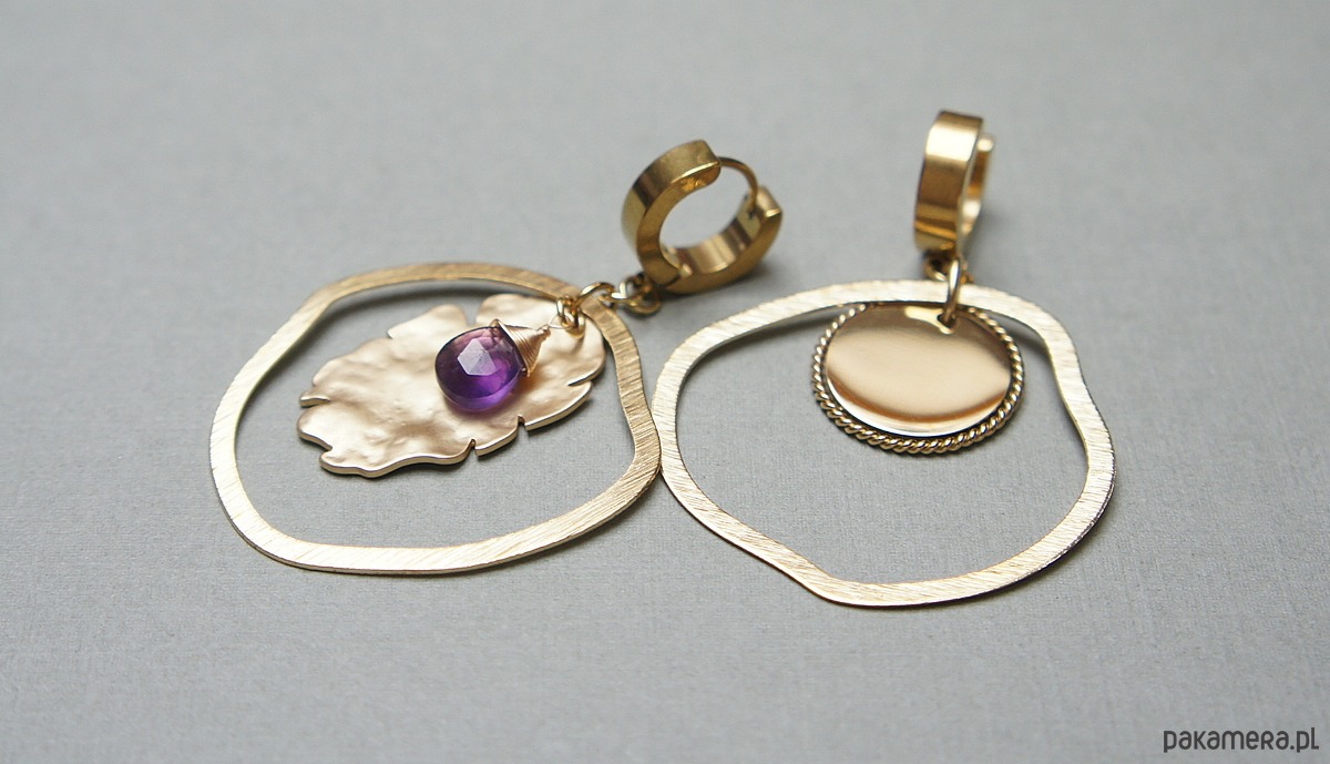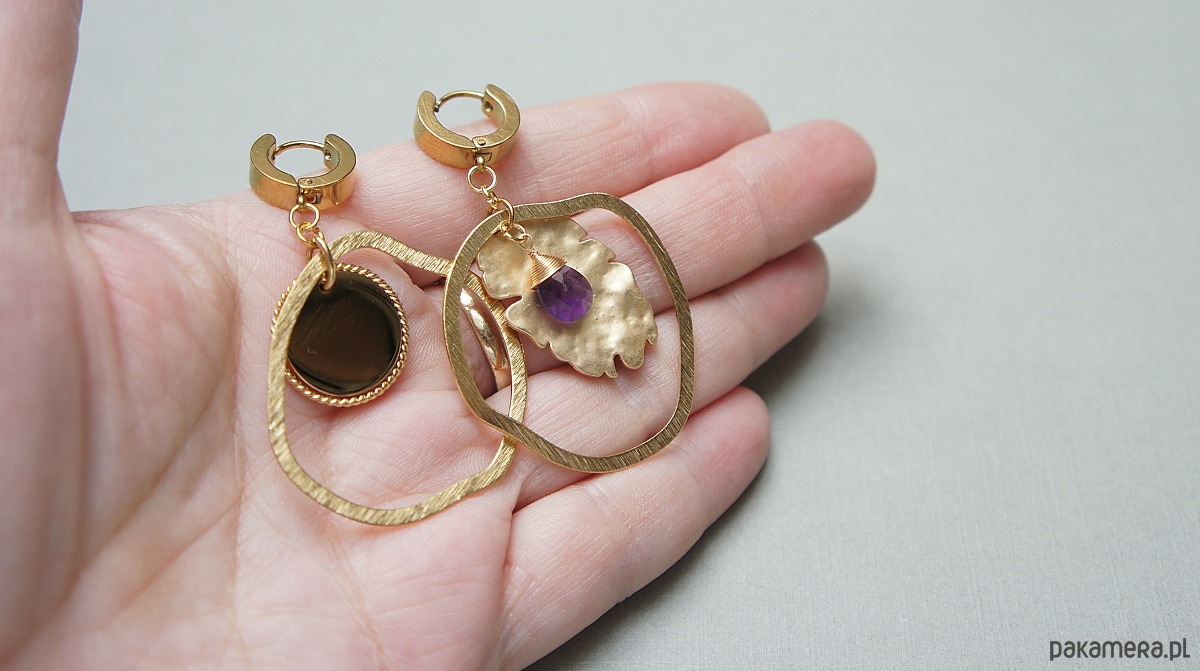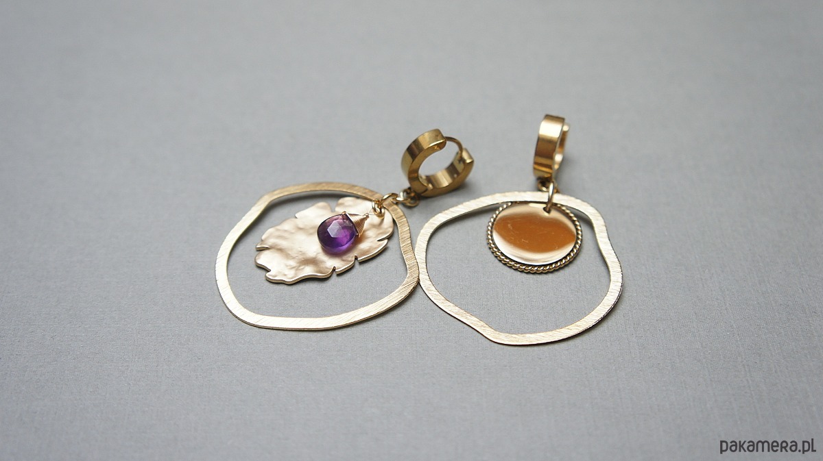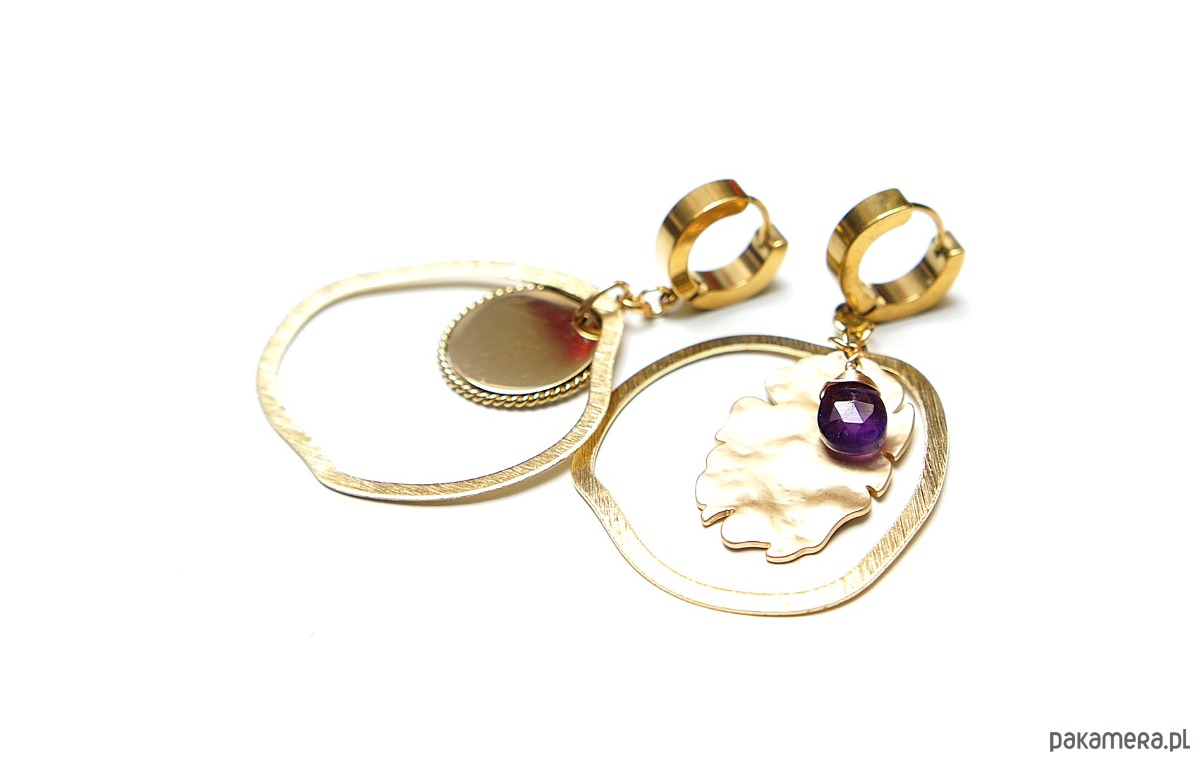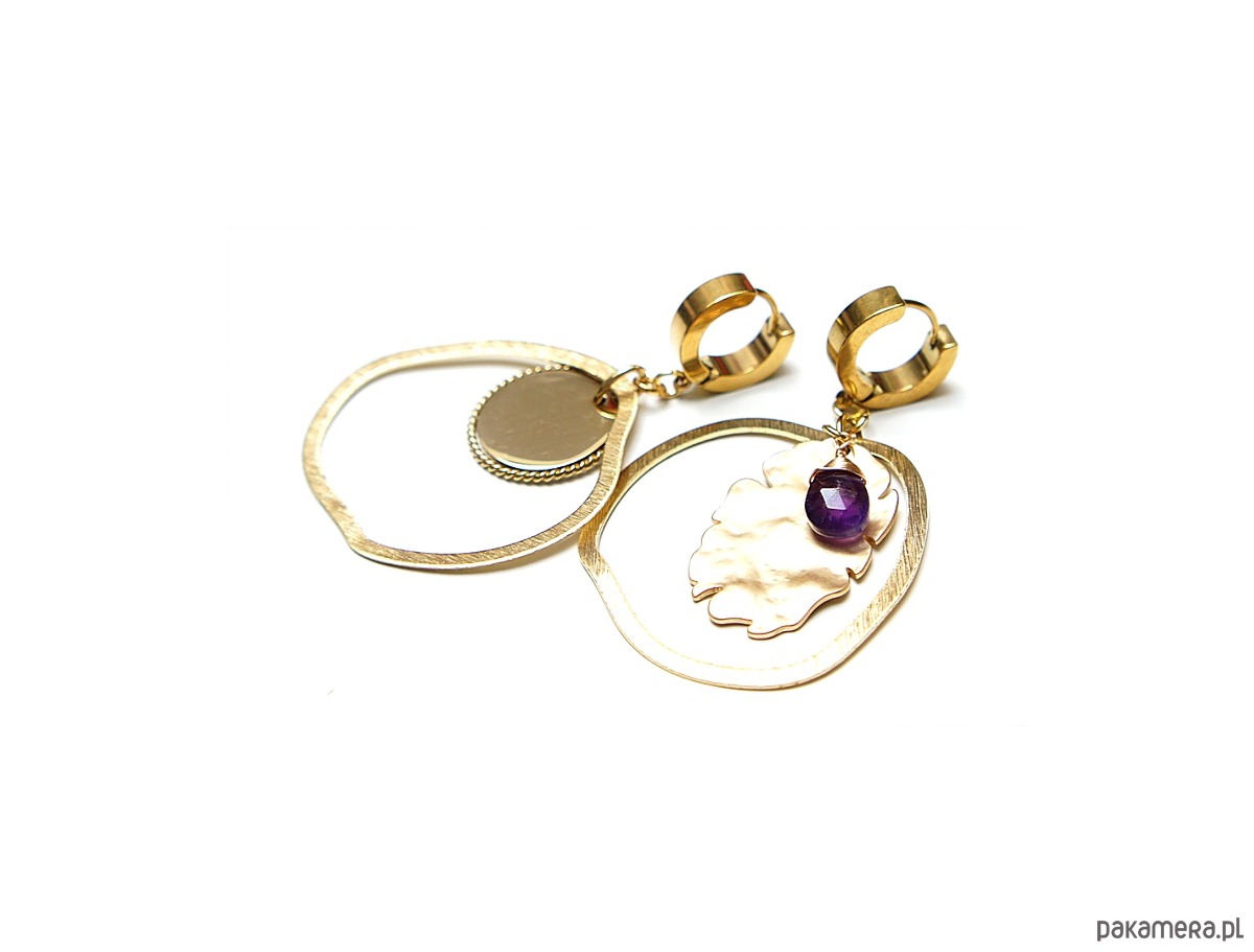 Duże, asymetryczne kolczyki wykonane z pozłacanej stali szlachetnej, nieregularnej zawieszki z mosiądzu platerowanego oraz naturalnej brioletki ametystu oplecionego mosiądzem. Długość kolczyków: ok. 5cm. Zapięcie - kajdanki ze stali szlachetnej.
