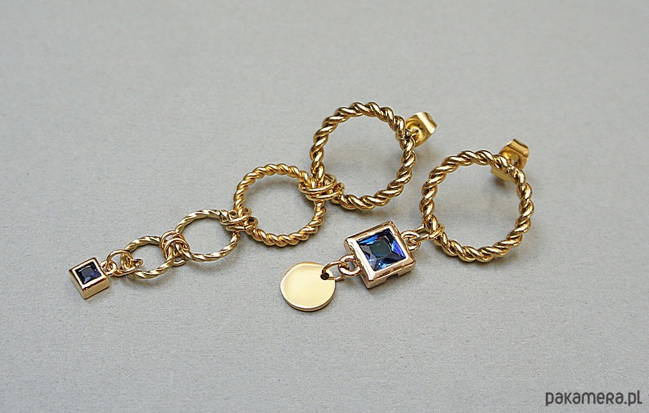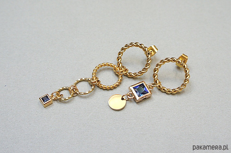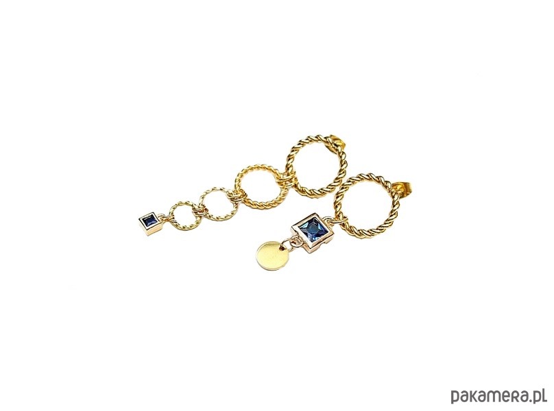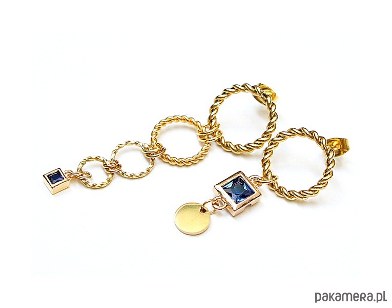 Asymetryczne kolczyki wykonane z pozłacanej stali szlachetnej i mosiądzu. Cyrkonie w okuciu. Długość kolczyków: ok. 3cm i 5cm. Biżuteria ozdobnie zapakowana. Cyrkonie w kolorze niebieskim.