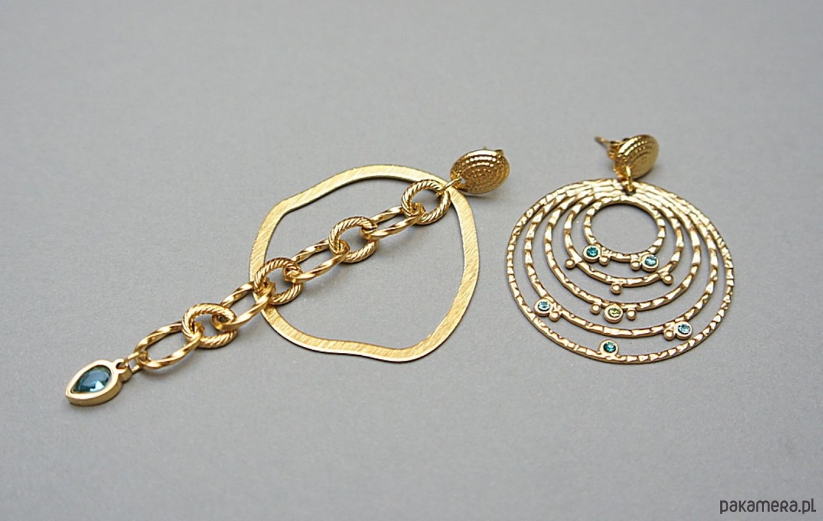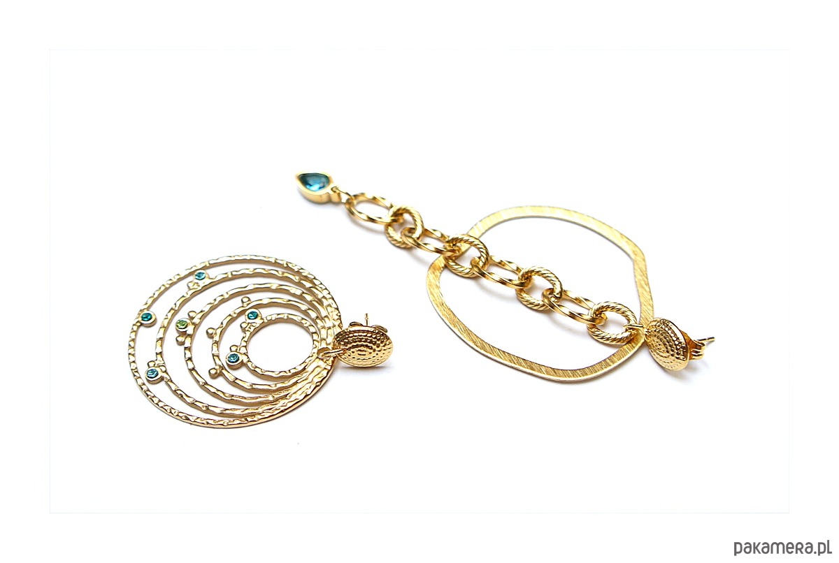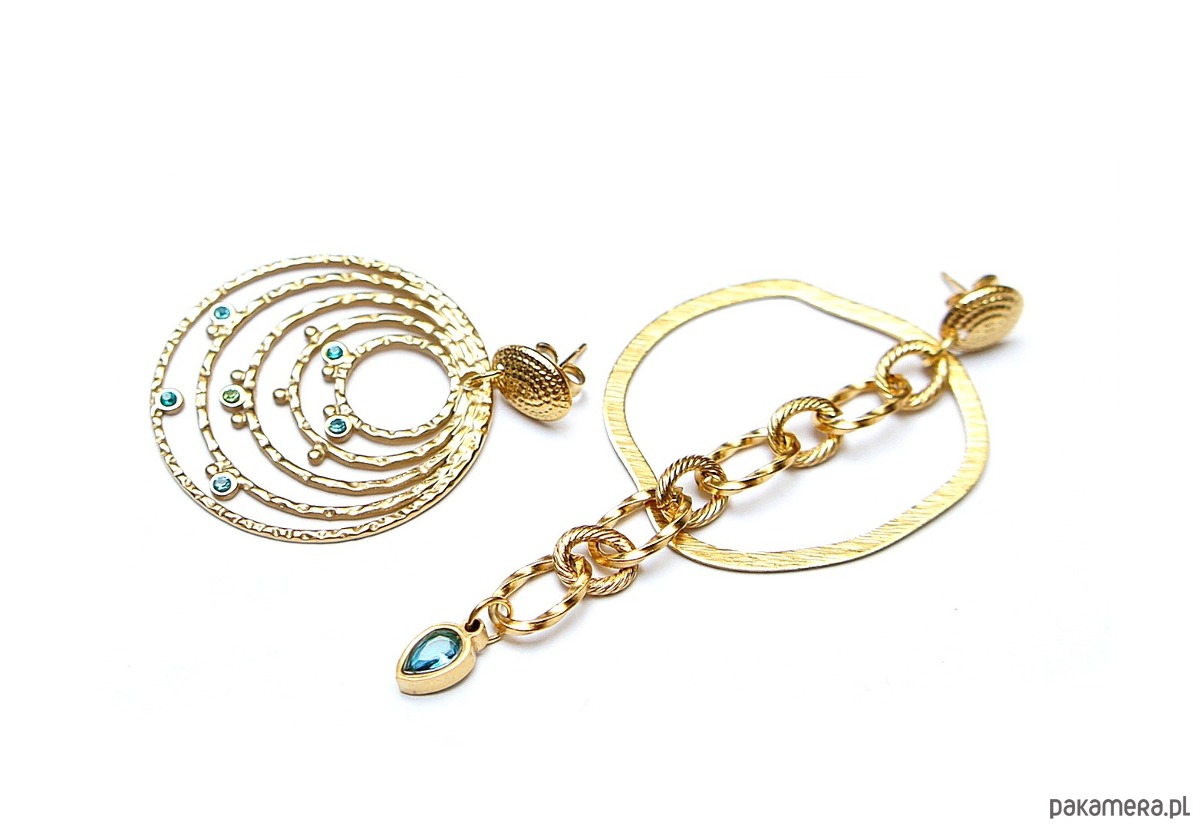 Duże, asymetryczne kolczyki wykonane z pozłacanej stali szlachetnej i mosiądzu platerowanego. Cyrkonie w okuciu. Długość kolczyków: ok. 8,2cm i 4,5cm. Średnica kół ok. 3,5cm.