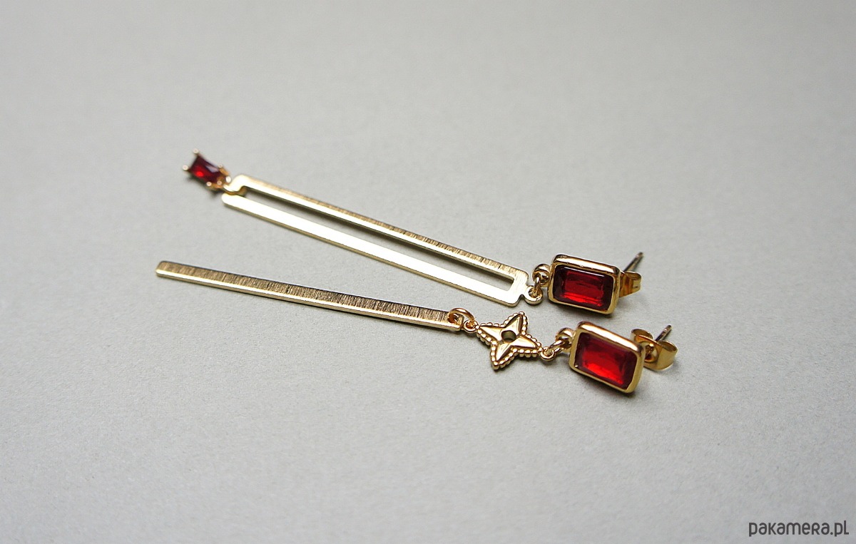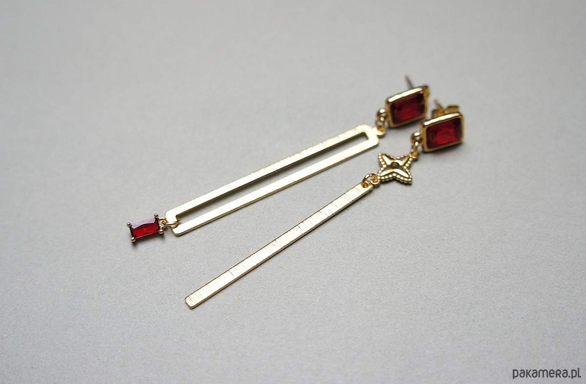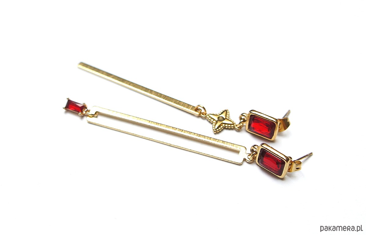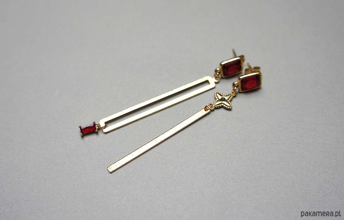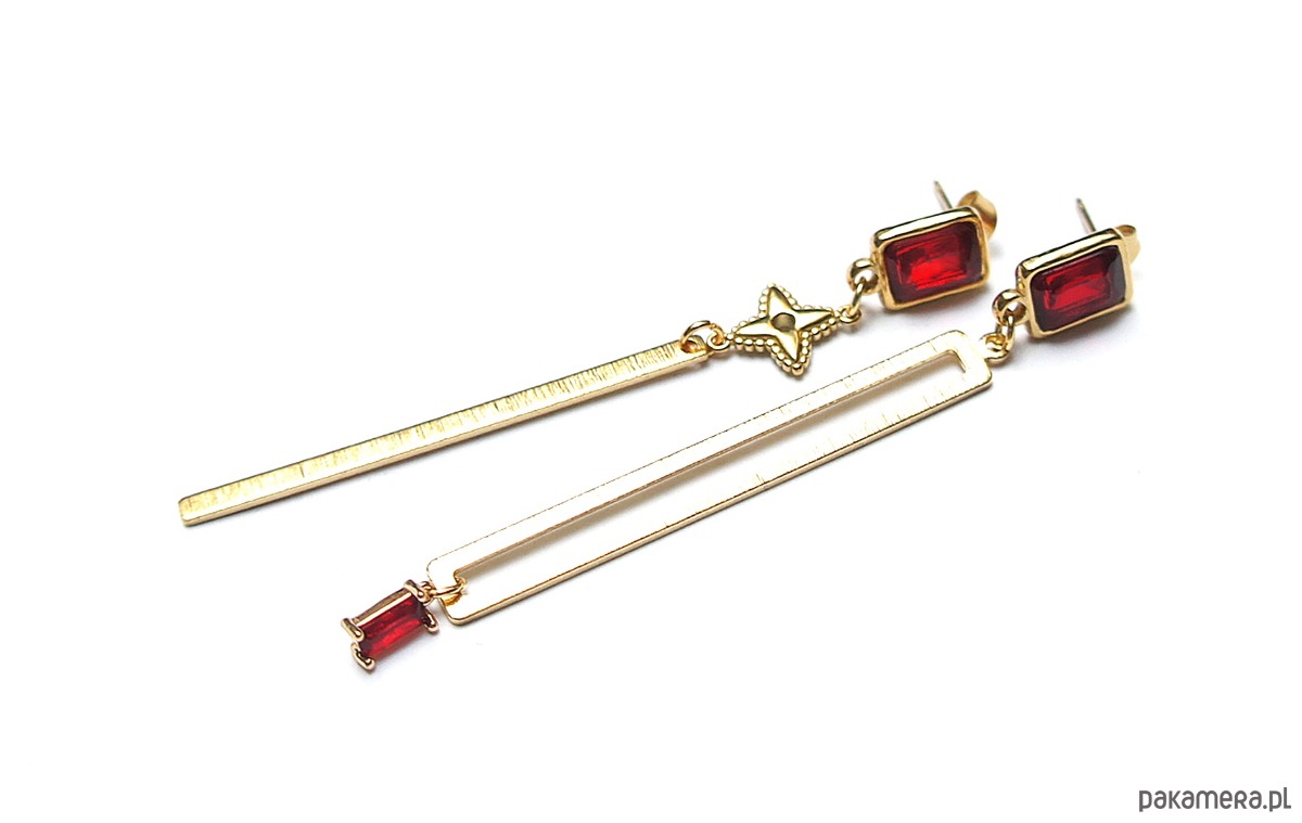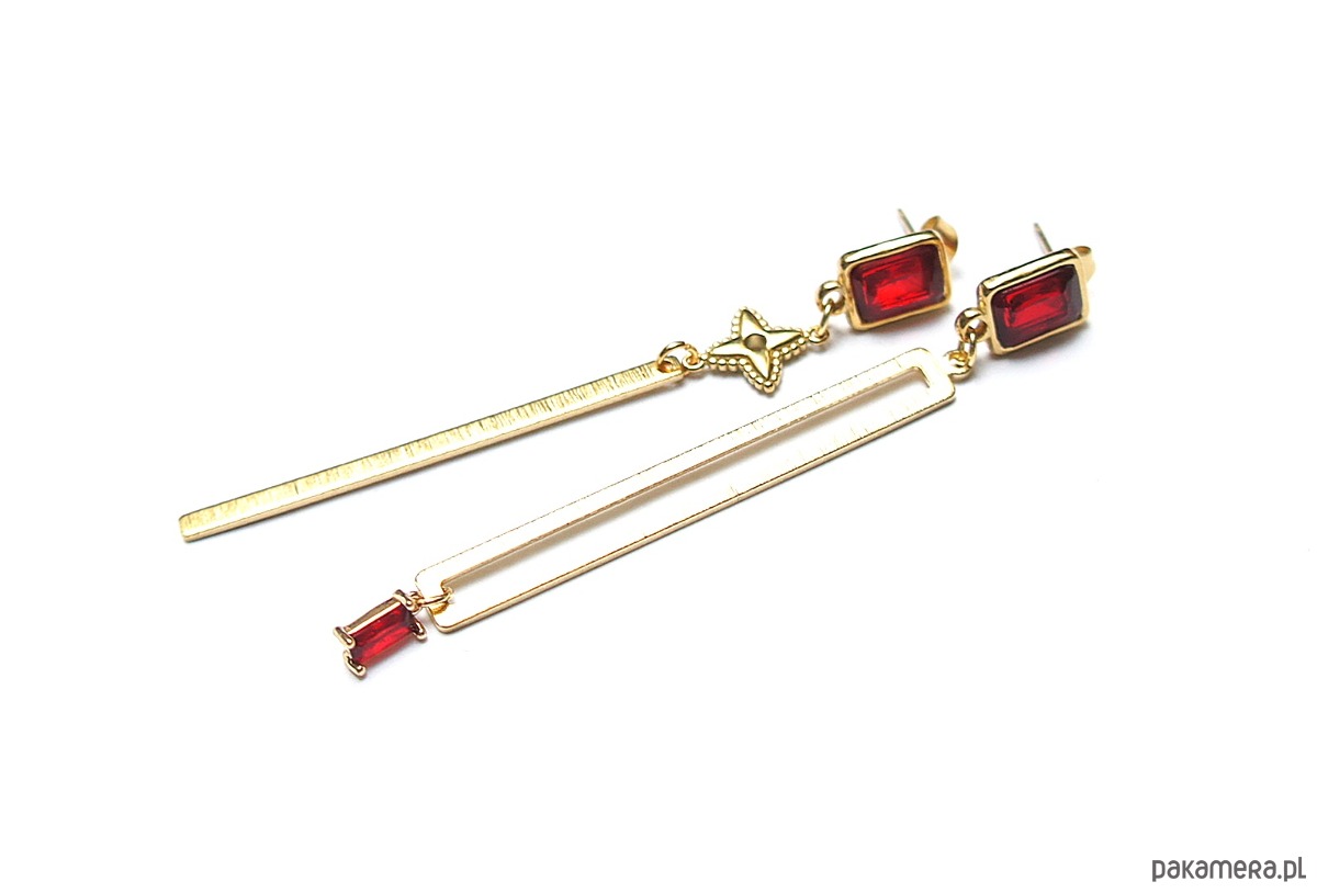 Długie, asymetryczne kolczyki wykonane z pozłacanej stali szlachetnej, mosiądzu, bigli z kryształkami w okuciu oraz zawieszki z cyrkonią w okuciu. Długość kolczyków: ok. 8cm.