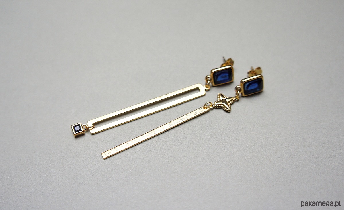 Długie, asymetryczne kolczyki wykonane z pozłacanej stali szlachetnej, mosiądzu, bigli z kryształkami w okuciu oraz zawieszki z cyrkonią w okuciu. Długość kolczyków: ok. 8cm.