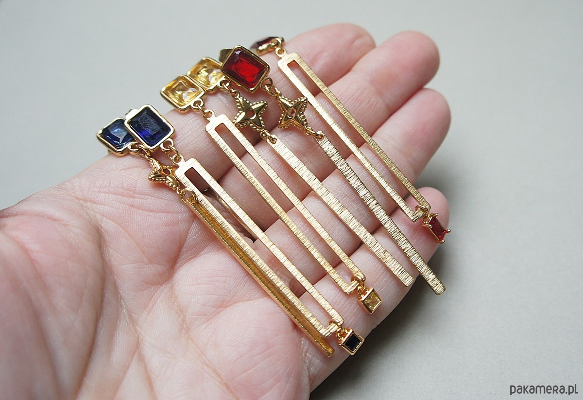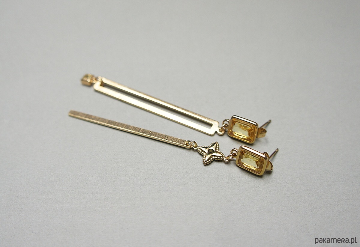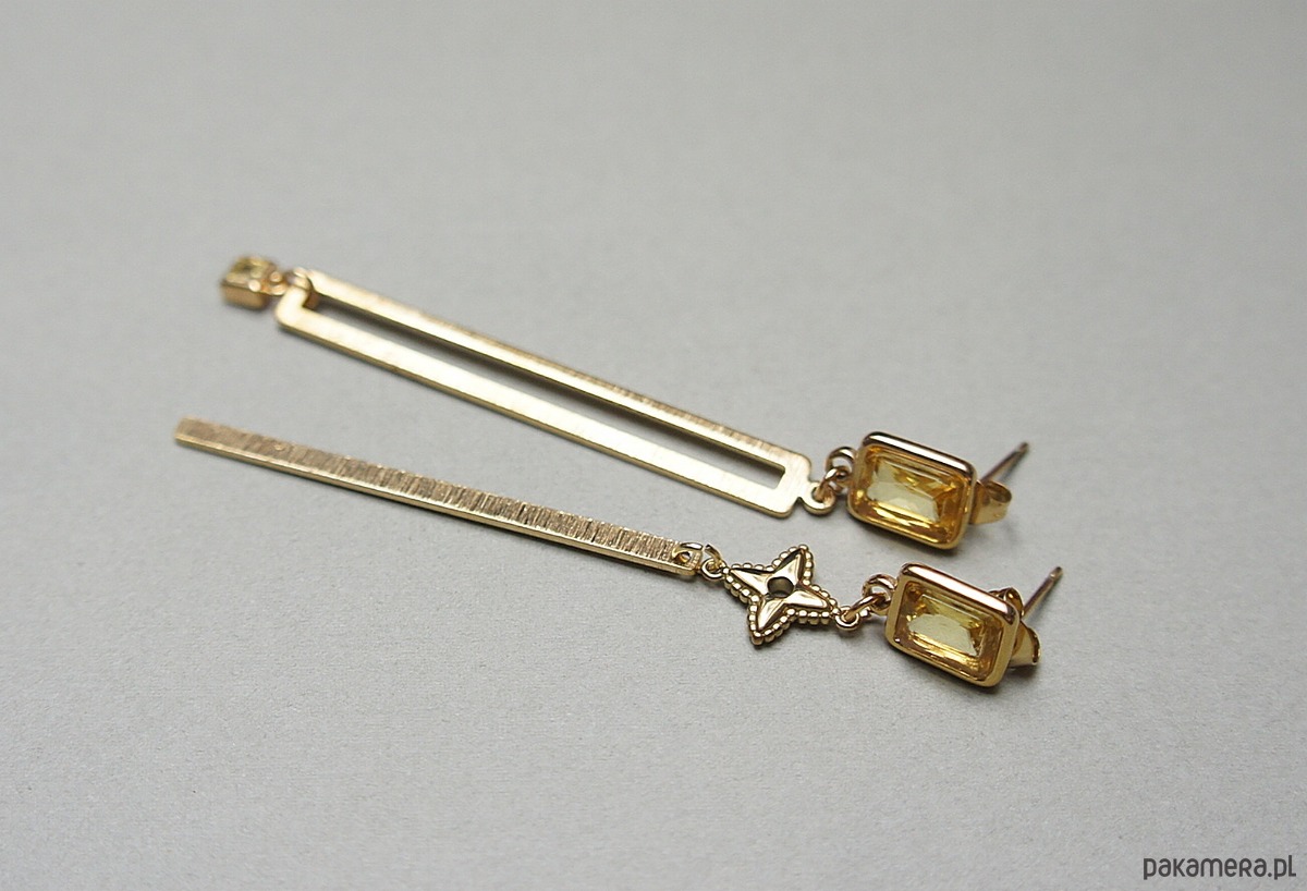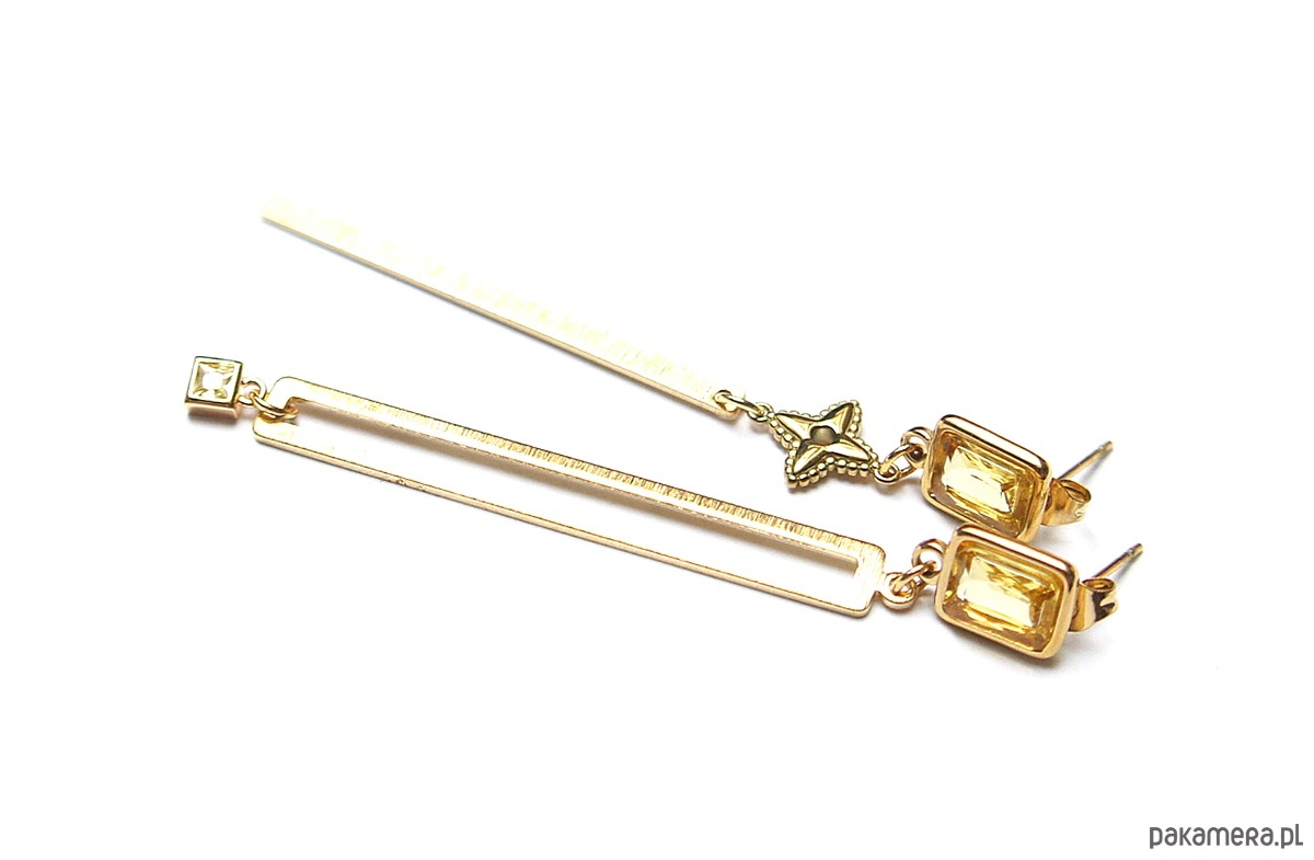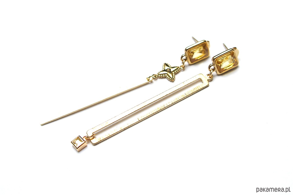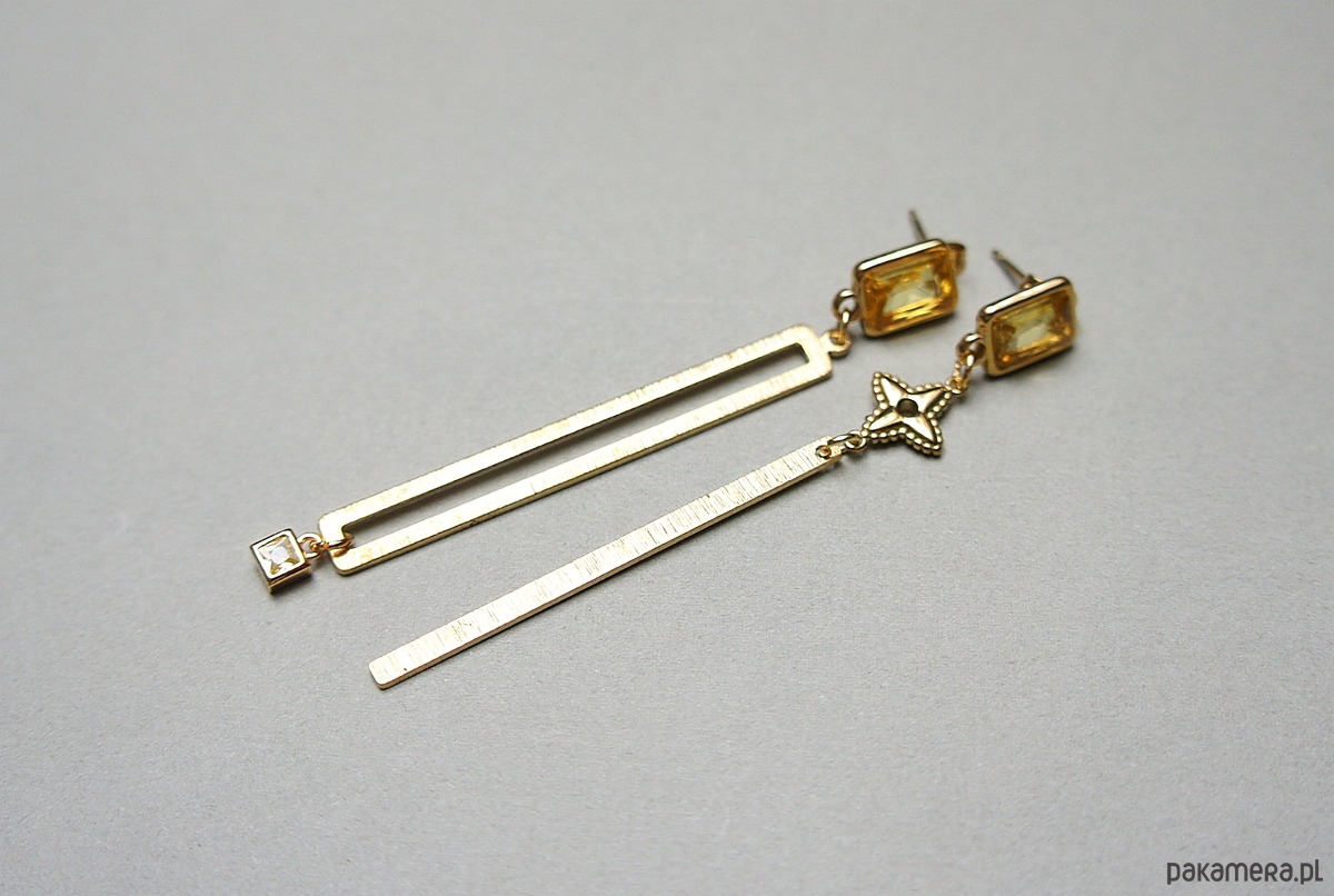 Długie, asymetryczne kolczyki wykonane z pozłacanej stali szlachetnej, mosiądzu, bigli z kryształkami w okuciu oraz zawieszki z cyrkonią w okuciu. Długość kolczyków: ok. 8cm.