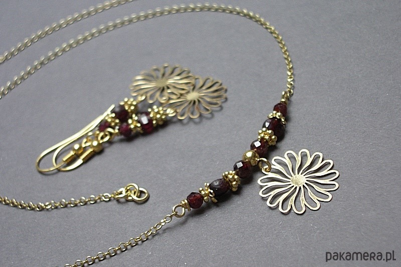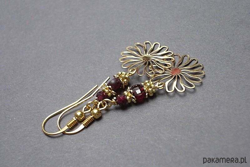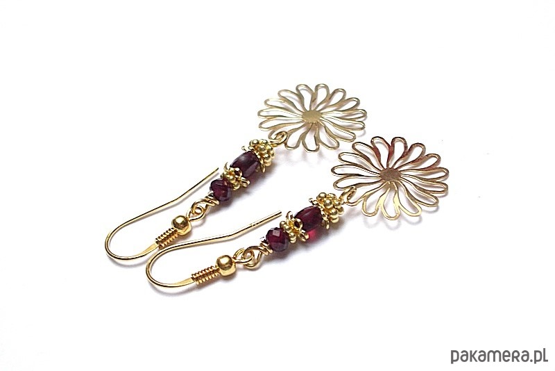 Kolczyki wykonane ze srebra pokrytego 24k złotem pr. 925 w połączeniu z fasetowanymi granatami [5mm i 3mm] oraz ażurowymi kwiatkami. Całkowita długość kolczyków: 5cm. Biżuteria ozdobnie zapakowana.