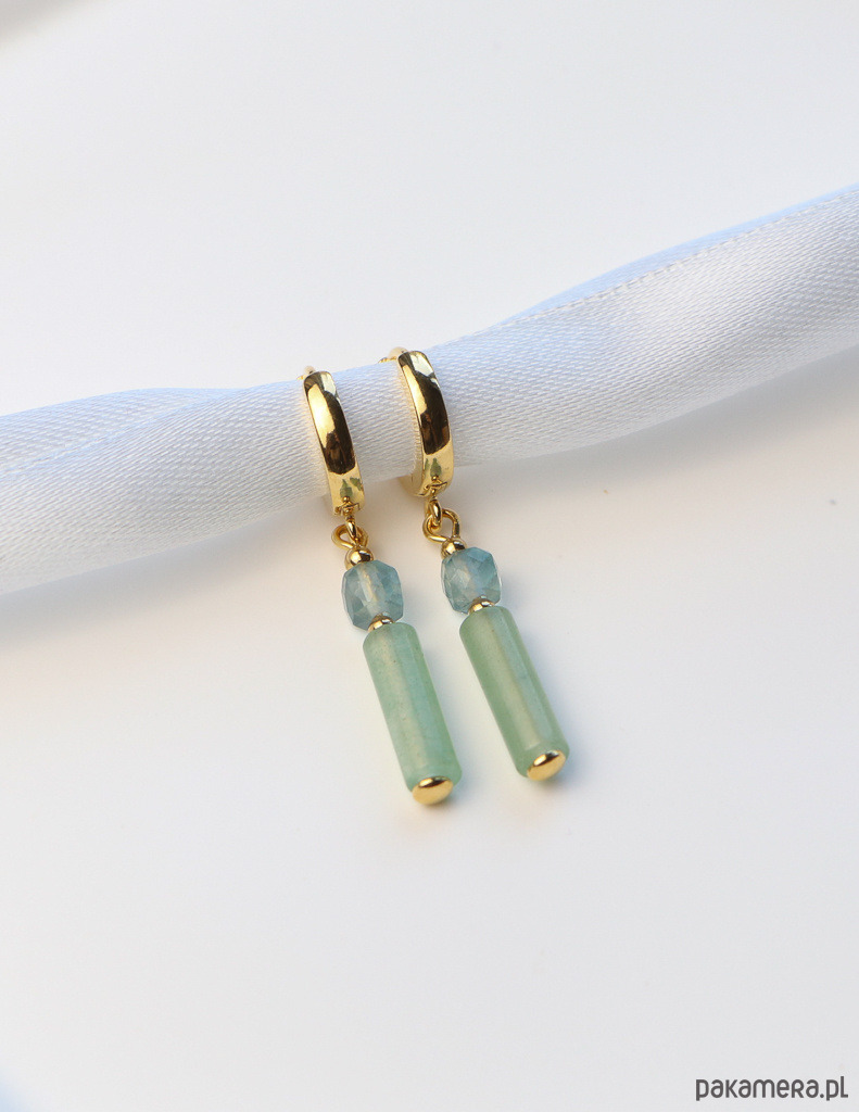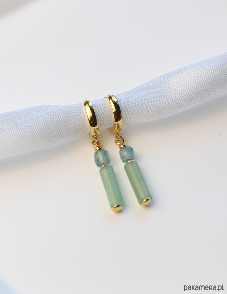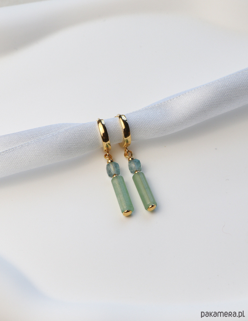 Kolczyki zostały wykonane ze srebra próby 925, pokrytego 24-karatowym złotem, co gwarantuje ich trwałość i piękny wygląd. Na pozłacanym, nowoczesnym zapięciu kajdanki zawieszono kompozycję z gładkiej belki awenturynu (ok. 4 x 13 mm) w odcieniu głębokiej zieleni, fasetowanej kostki fluorytu (ok. 4 mm) w delikatnym niebieskim kolorze oraz drobnych, złotych kuleczek hematytu (ok. 2,5 mm), które dodają im subtelnej elegancji.
