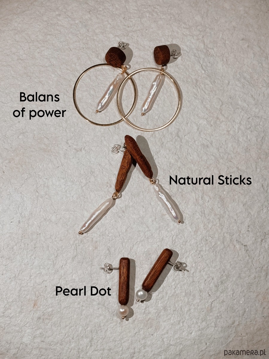 Materiały: naturalne perły słodkowodne, drewno sapeli