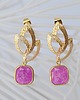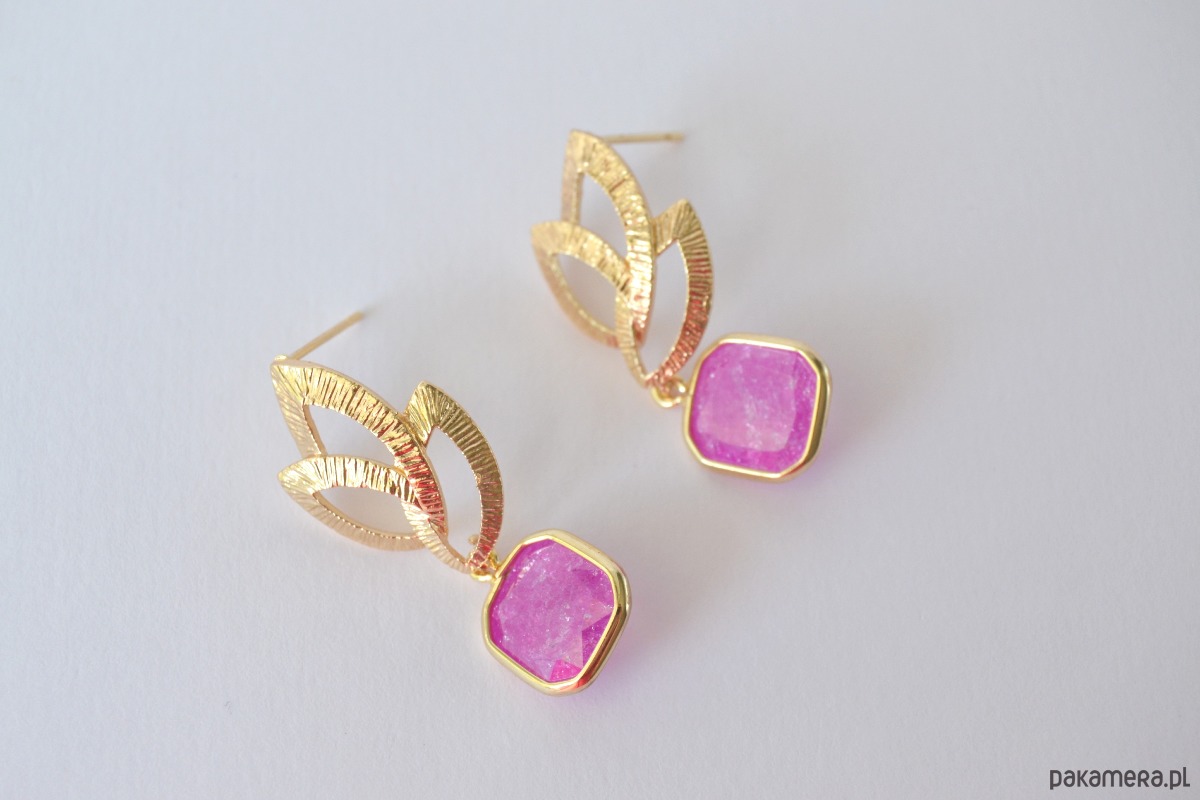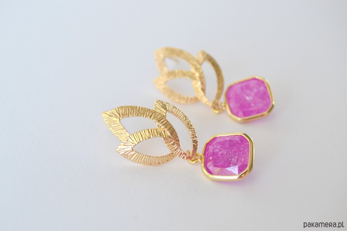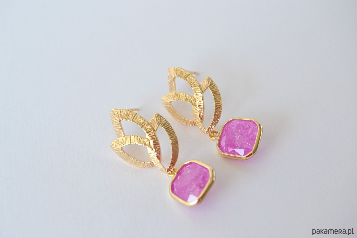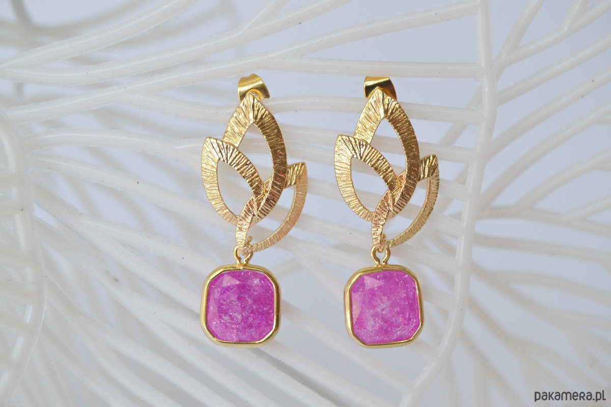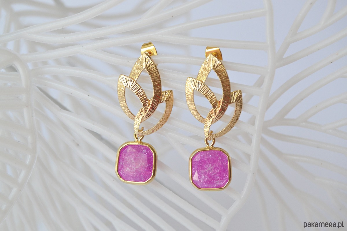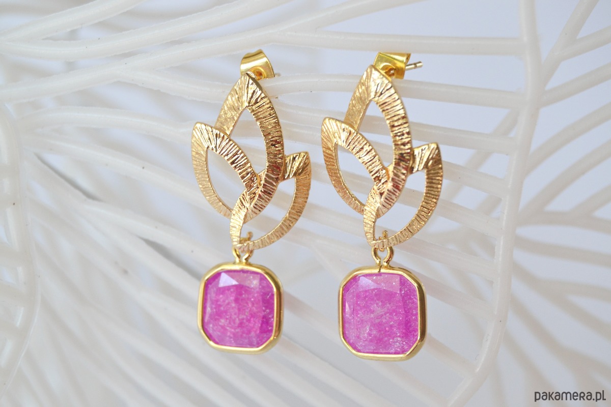 Kolczyki listki pozłacane 24k złotem z zawieszką w przepięknym fuksjowym kolorze.