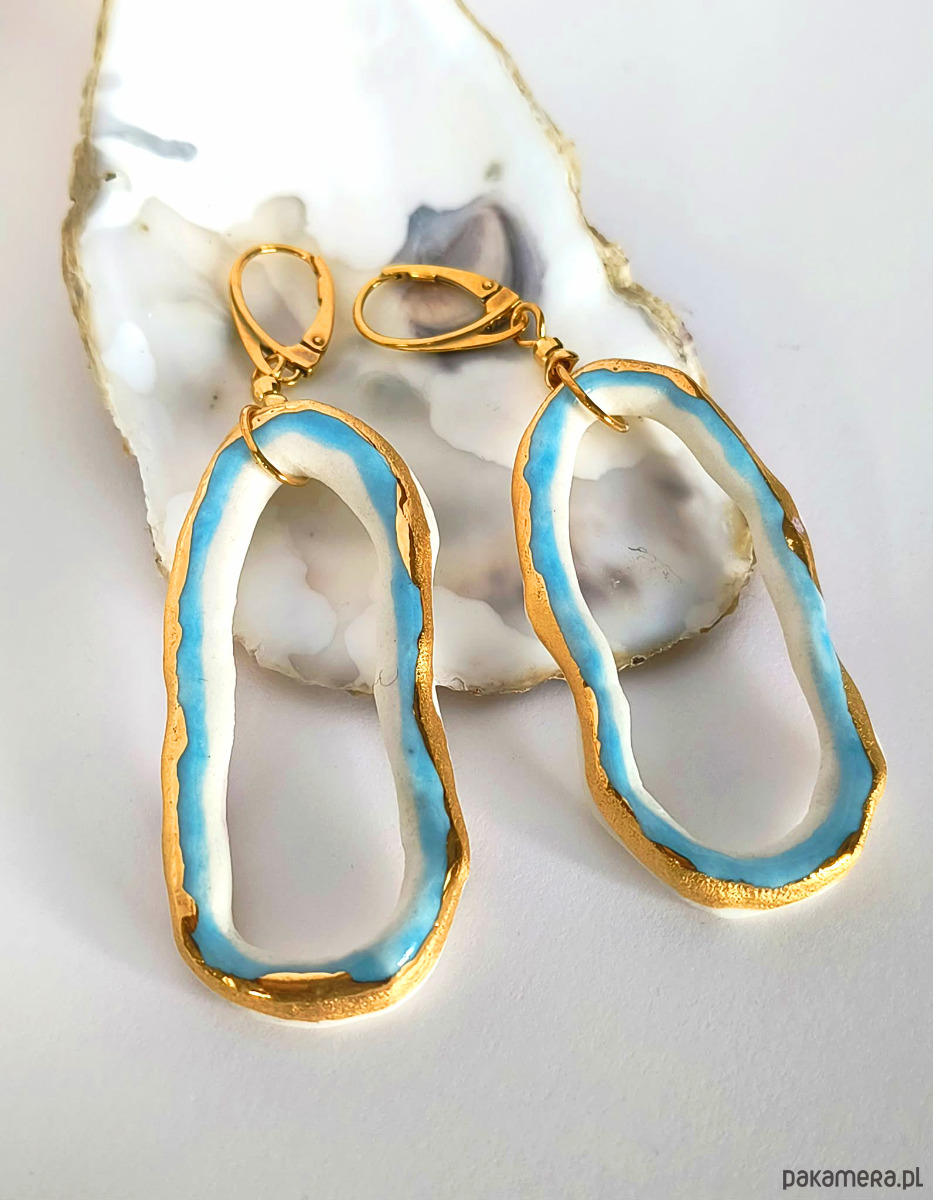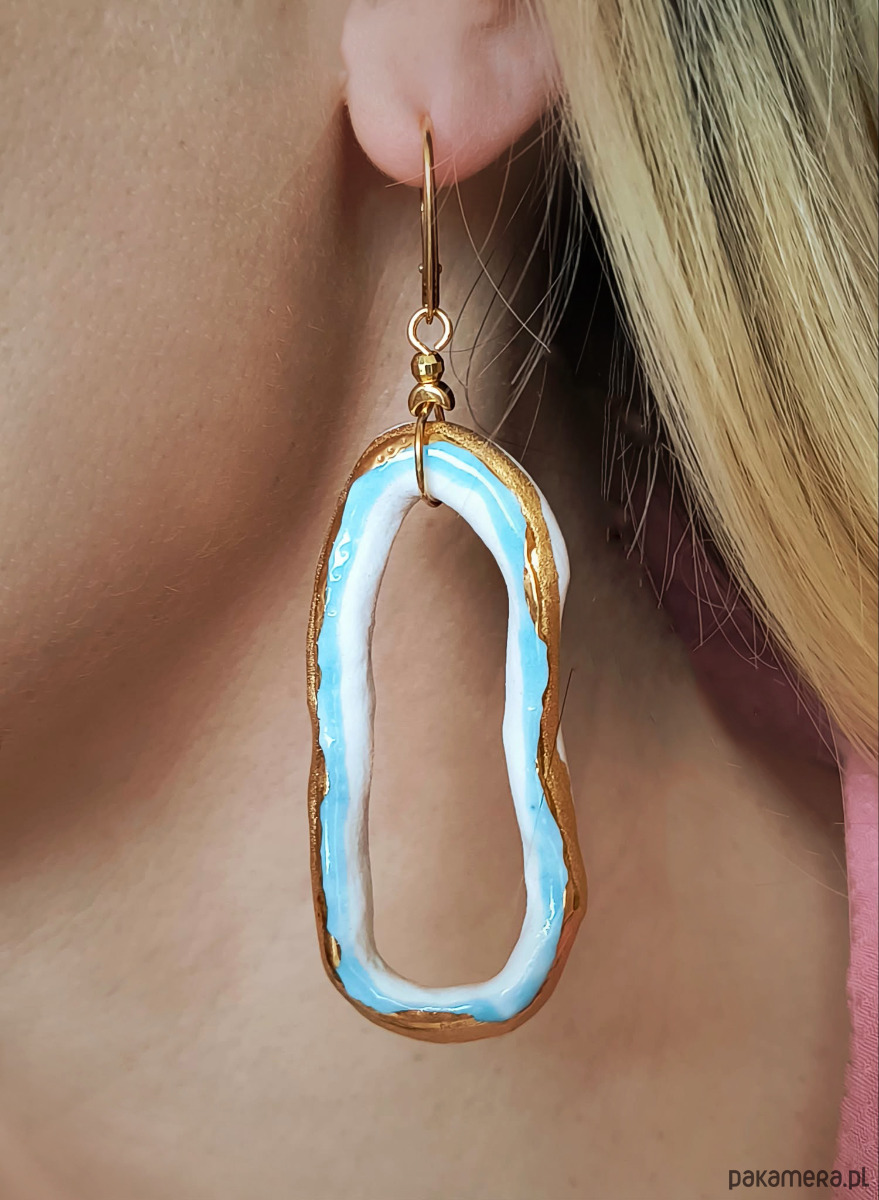 Kolczyki wykonałam własnoręcznie ze szlachetnej porcelany, zdobiłam szkliwem oraz 24-karatowym złotem.