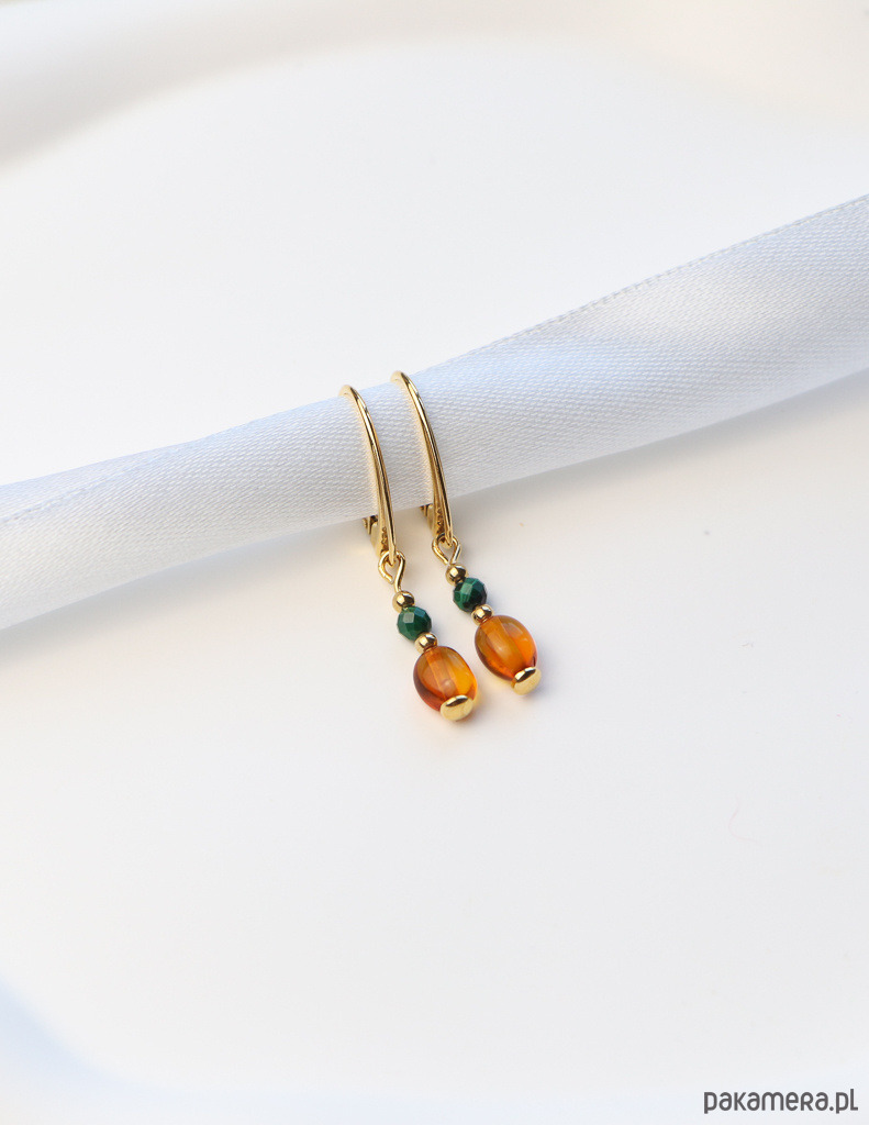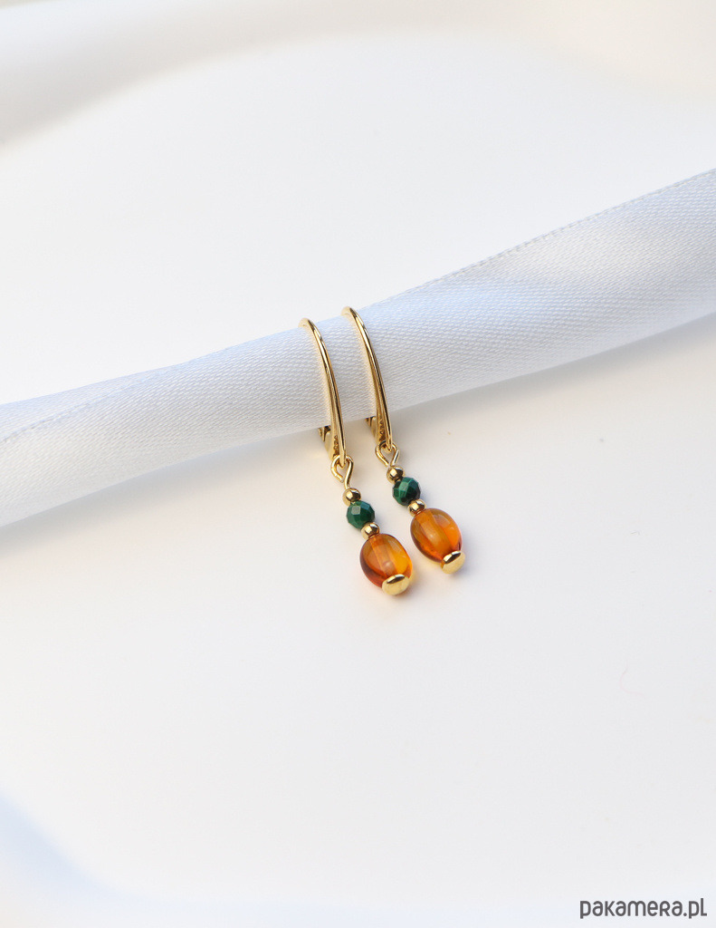 Kolczyki pozłacane - Bursztyn Koniak, Malachit