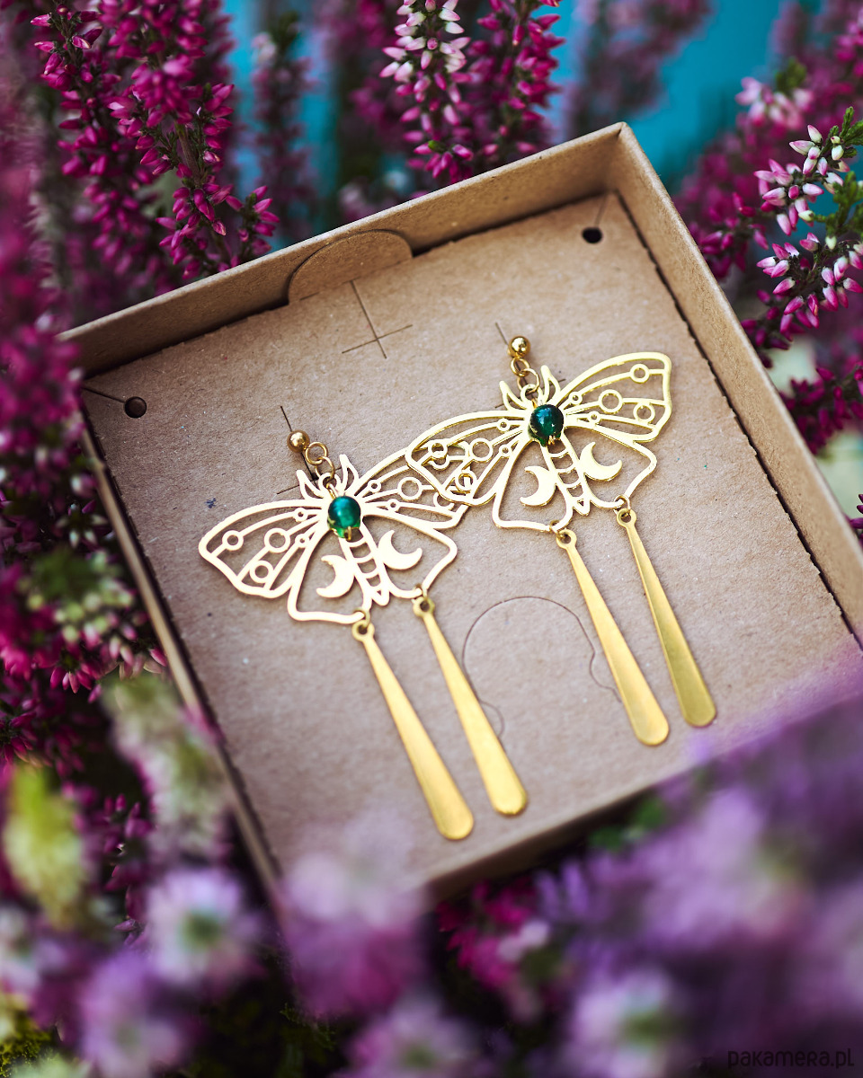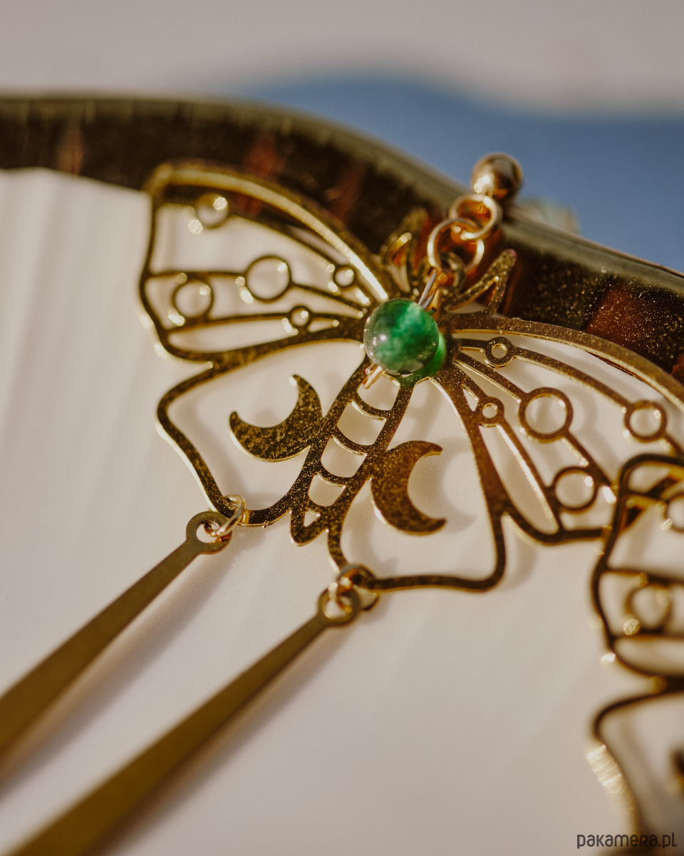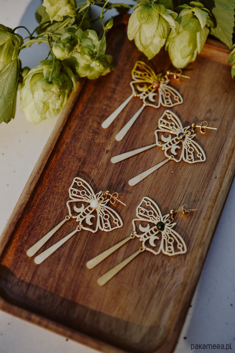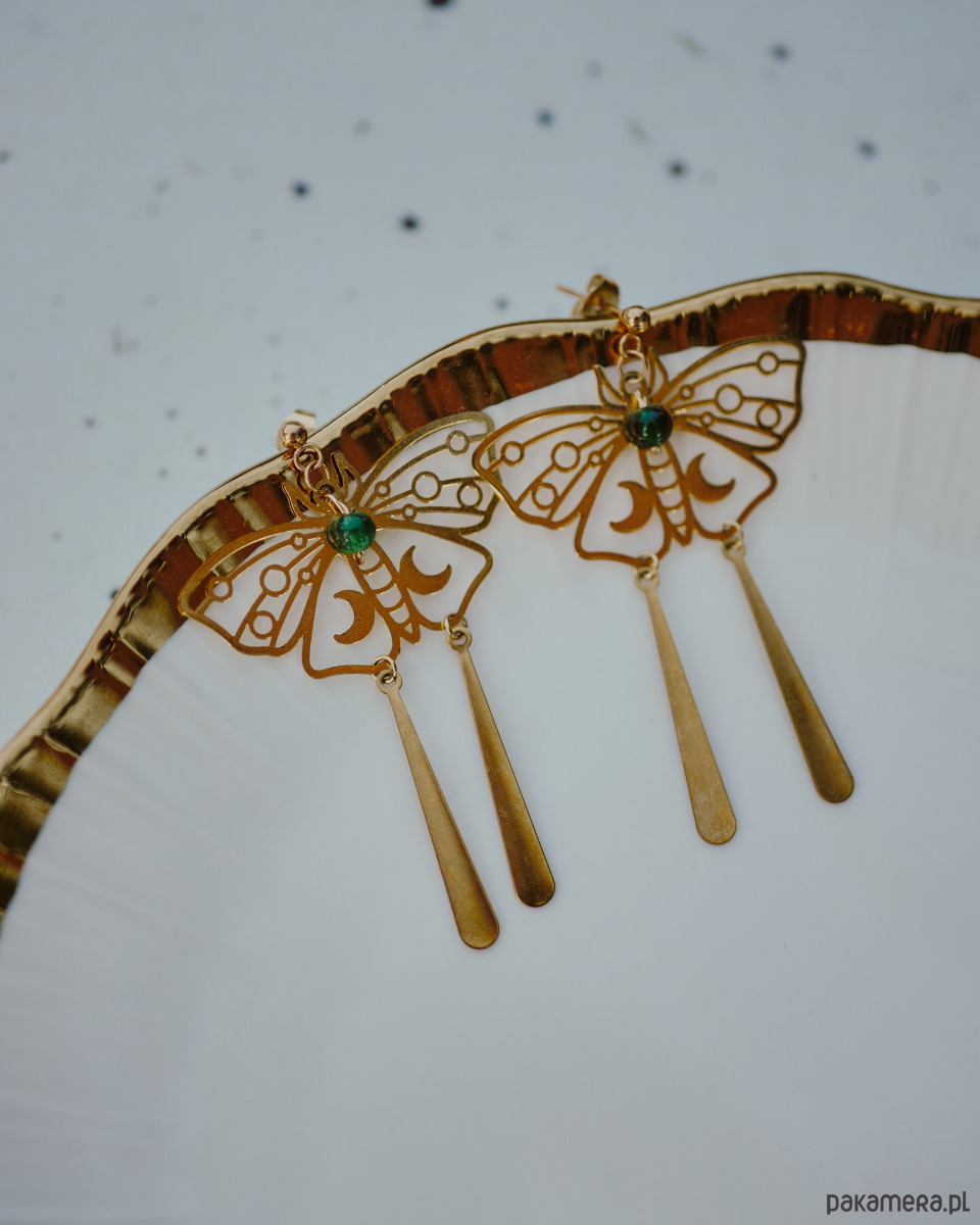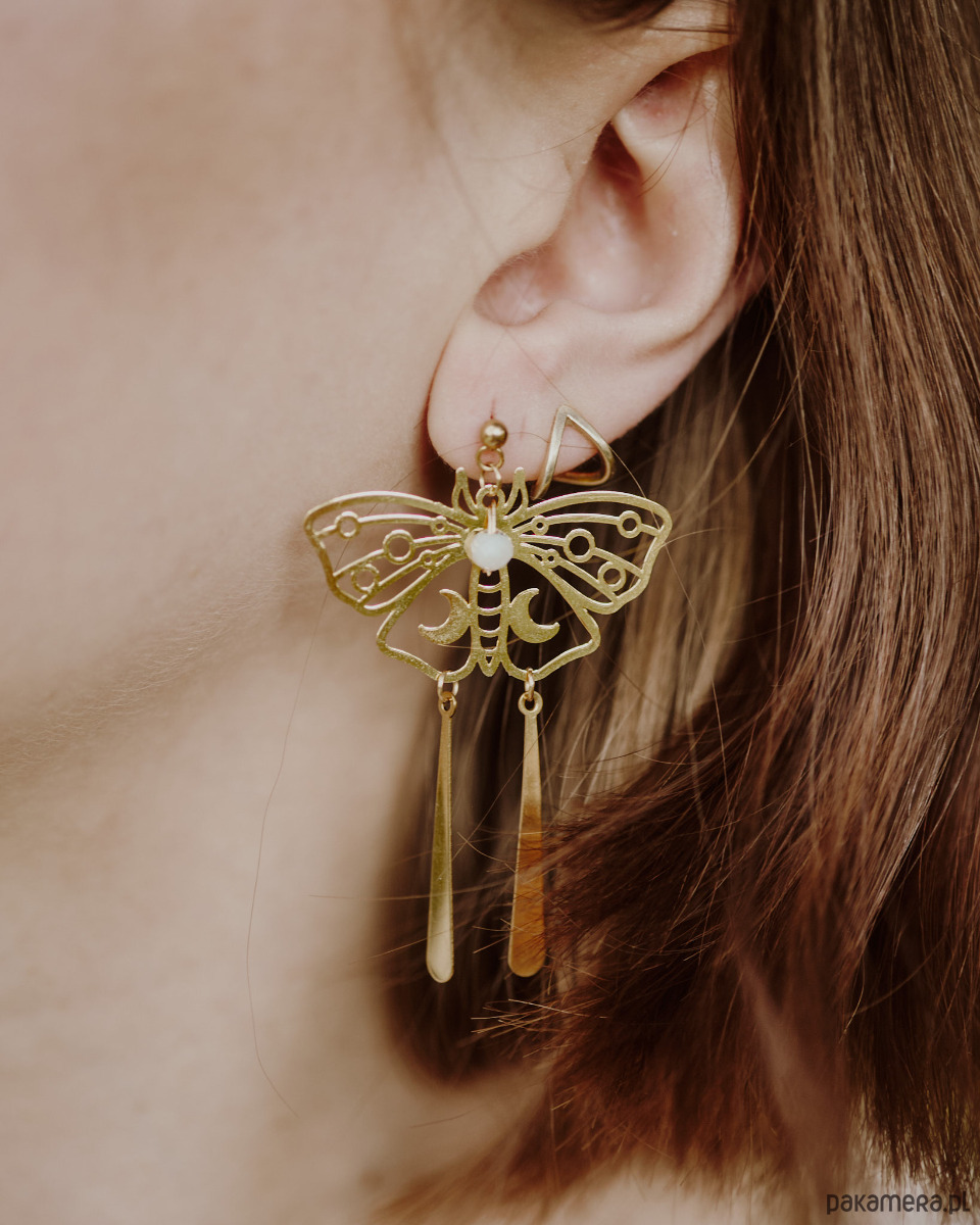 Bardzo efektowne ale lekkie kolczyki w kształcie ciem. Przyciągają wzrok swoimi długimi pędzelkami, które delikatnie bujają się w rytm ruchów.