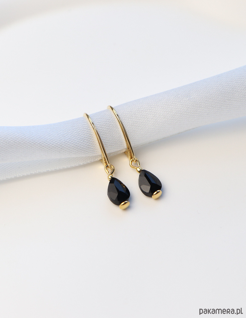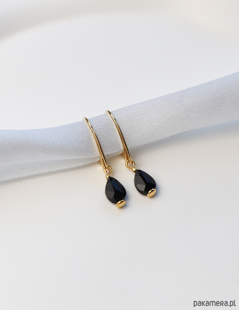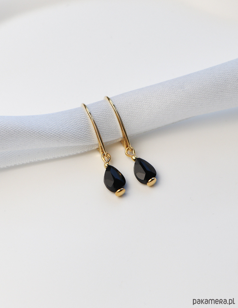 Kolczyki zostały wykonane ze srebra próby 925, pokrytego 24-karatowym złotem, co gwarantuje ich trwałość i piękny wygląd. Na pozłacanym, angielskim zapięciu zawieszono gładką łezkę czarnego obsydianu (ok. 6 x 8 mm). Całości dopełniają drobne, złote kuleczki hematytu (ok. 2,5 mm), które dodają im eleganckiego akcentu.