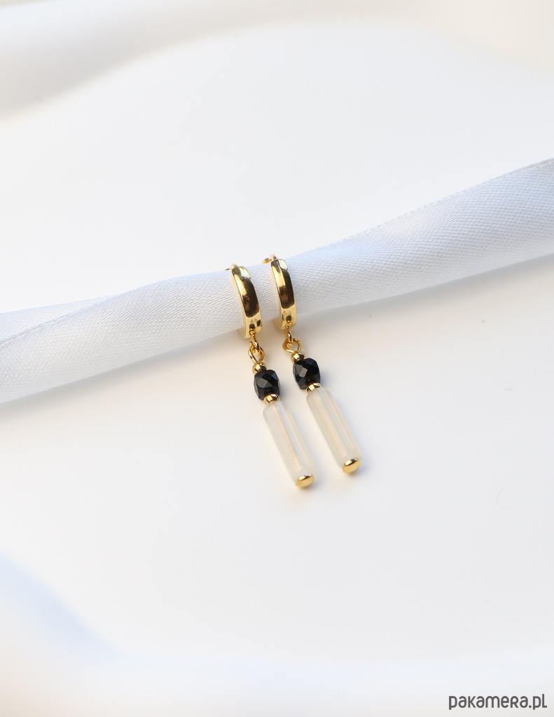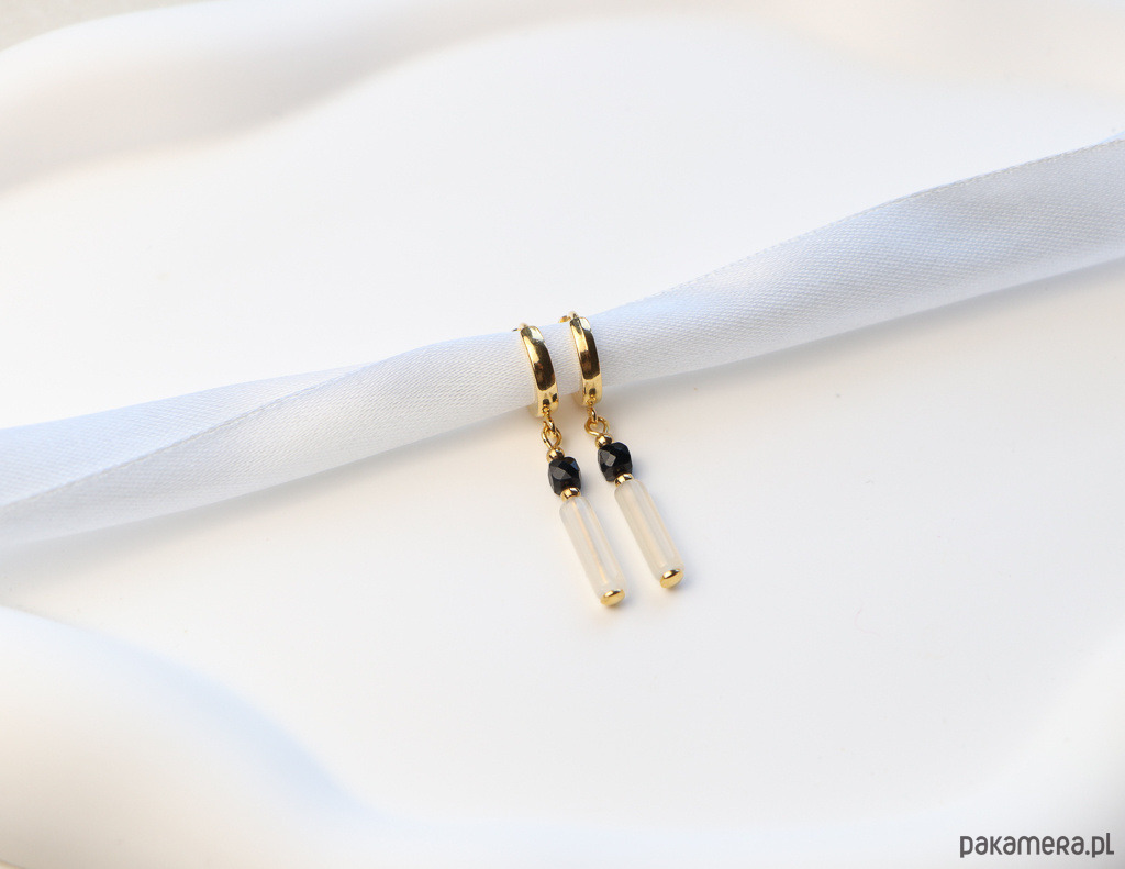 Te kolczyki to idealne połączenie klasycznych, podstawowych kolorów z nutą elegancji. Kompozycja kamieni w odcieniach bieli i czerni ze lśniącym złotem idealnie podkreśli Twój styl. Mają długość około 3,8 cm, dzięki czemu są bardzo subtelne.