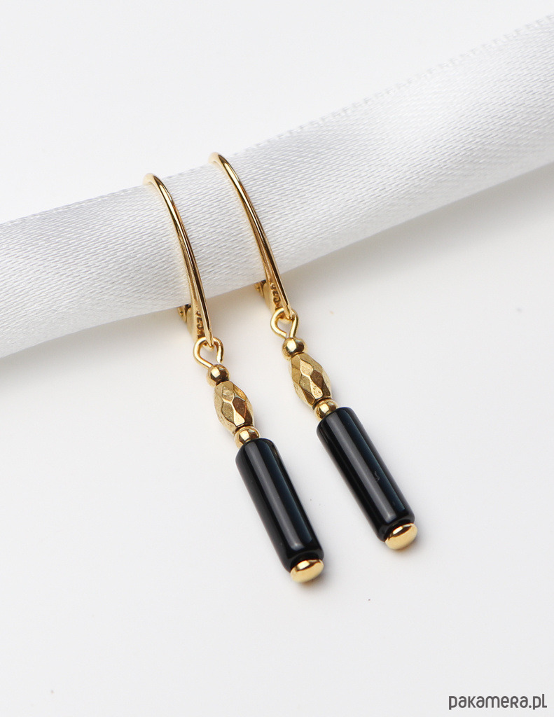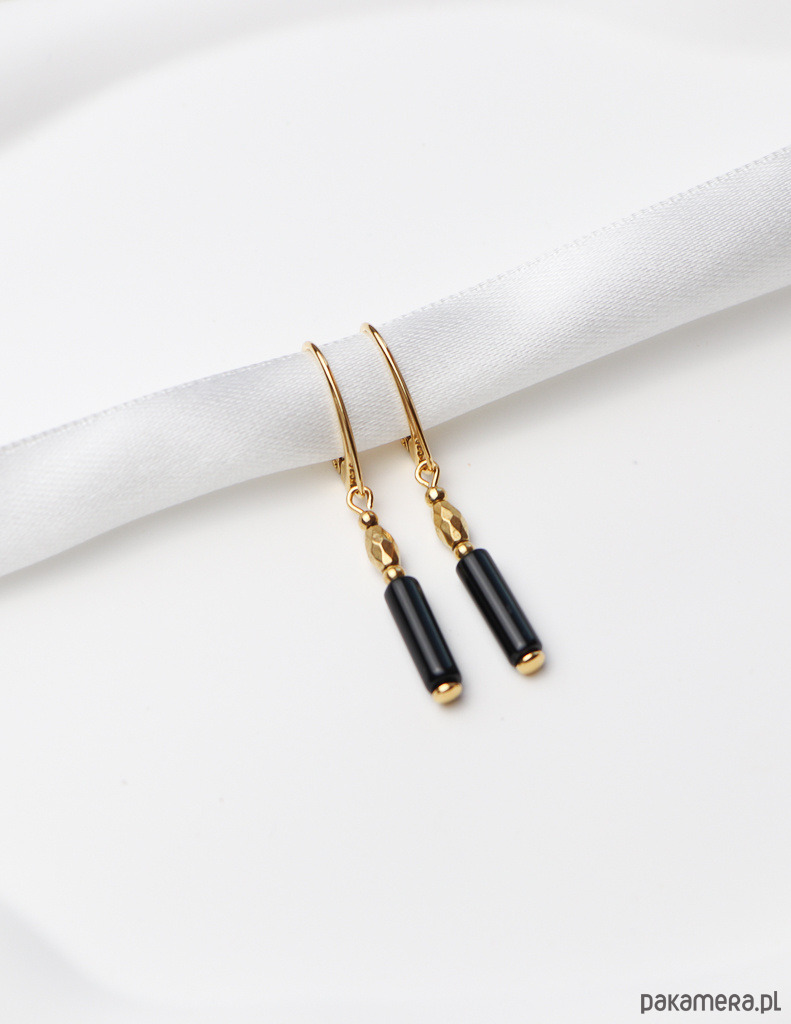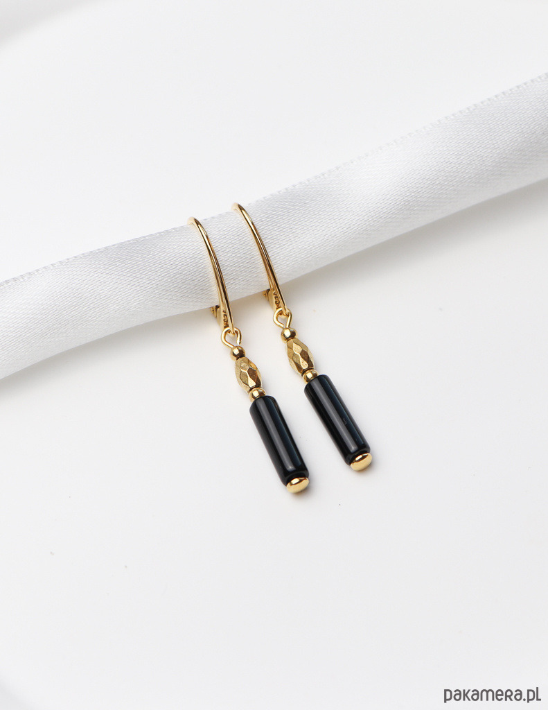 Kolczyki zostały wykonane ze srebra próby 925, pokrytego 24-karatowym złotem, co gwarantuje ich trwałość i piękny wygląd. Na pozłacanym, angielskim zapięciu zawieszono gładką belkę czarnego turmalinu (ok. 4 x 13 mm), która nadaje im minimalistyczny i surowy charakter. Całości dopełnia fasetowane wrzeciono hematytu (ok. 2 x 5 mm) oraz drobne, złote kulki hematytu (ok. 2,5 mm), które dodają kompozycji subtelnej elegancji.