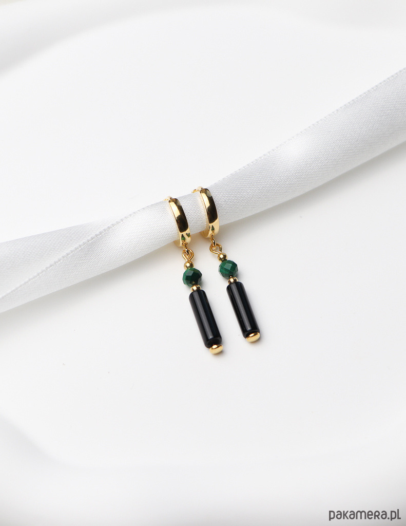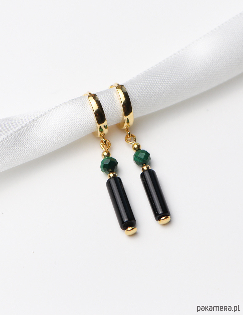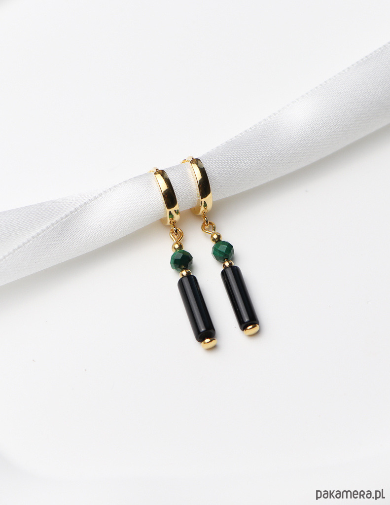 Kolczyki zostały wykonane ze srebra próby 925, pokrytego 24-karatowym złotem, co gwarantuje ich trwałość i piękny wygląd. Na pozłacanym, nowoczesnym zapięciu kajdanki zawieszono kompozycję z gładkiej belki czarnego turmalinu (ok. 4 x 13 mm) oraz fasetowanej kulki malachitu (ok. 4 mm) w charakterystyczne zielone wzory. Całości dopełniają drobne, złote kuleczki hematytu (ok. 2,5 mm), które dodają im subtelnej elegancji.