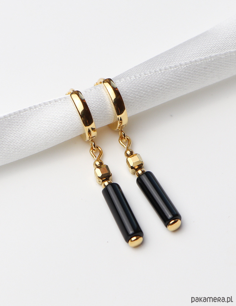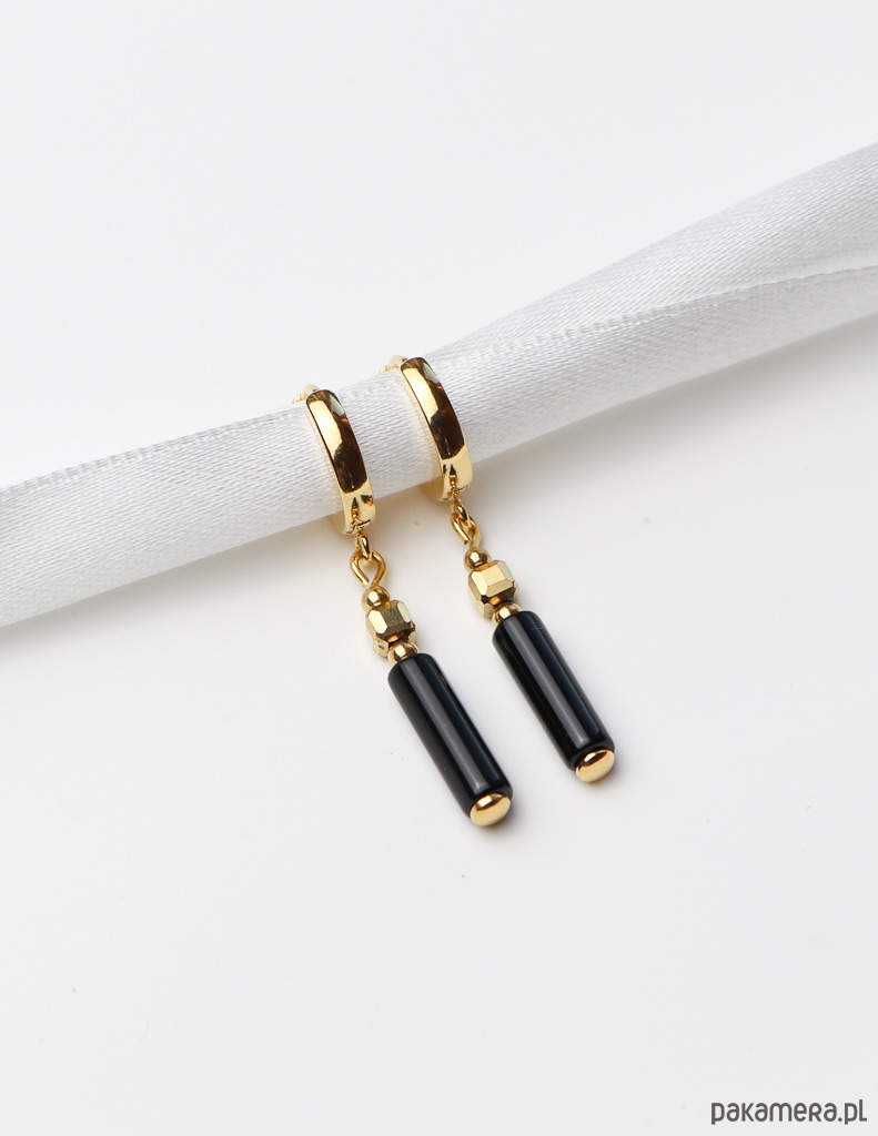 Kolczyki zostały wykonane ze srebra próby 925, pokrytego 24-karatowym złotem, co gwarantuje ich trwałość i piękny wygląd. Na pozłacanym, nowoczesnym zapięciu kajdanki zawieszono gładką belkę czarnego turmalinu (ok. 4 x 13 mm), która nadaje im minimalistyczny i surowy charakter, a także lśniąca złotem kostka hematytu (ok. 3 x 3 mm). Całości dopełniają drobne, złote kulki hematytu (ok. 2,5 mm), które dodają im subtelnej elegancji.