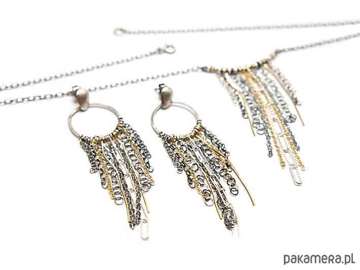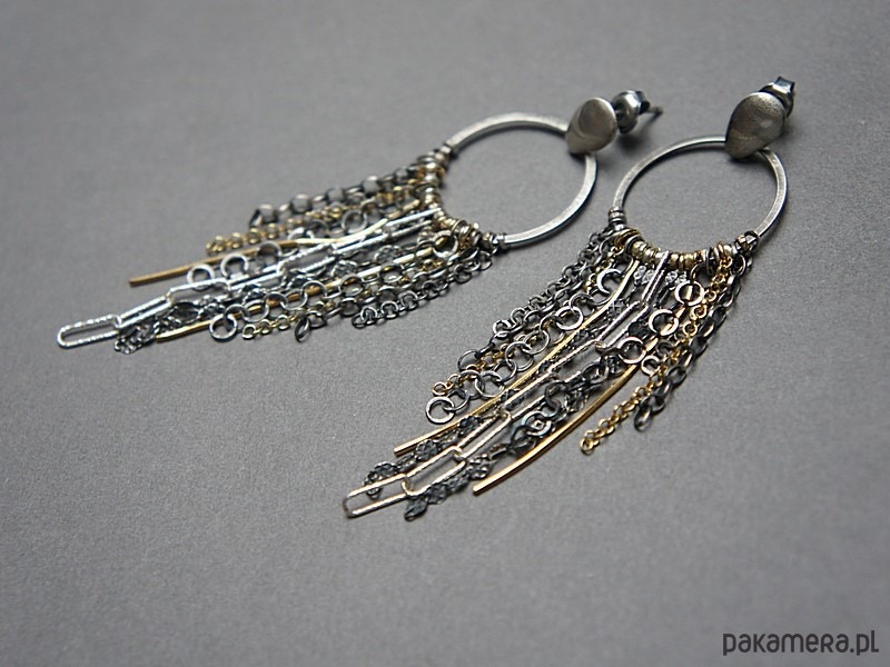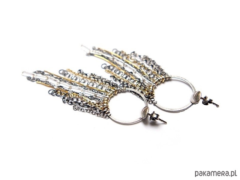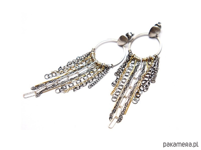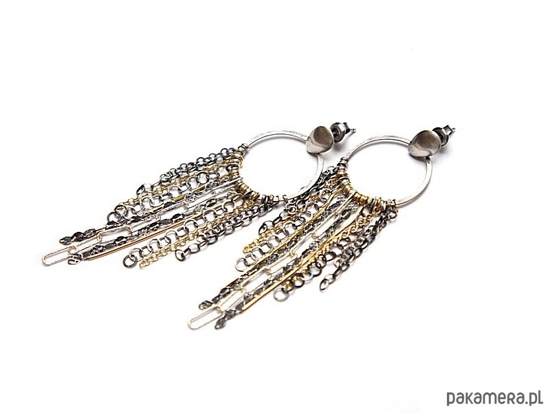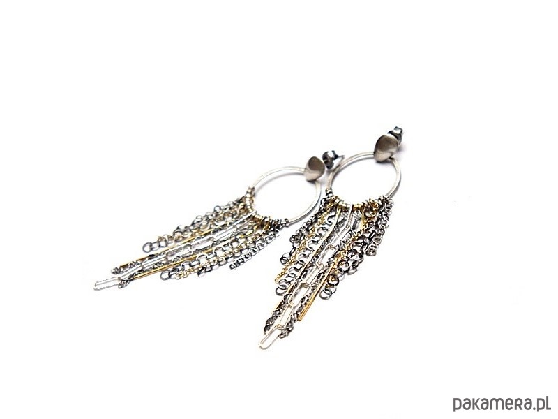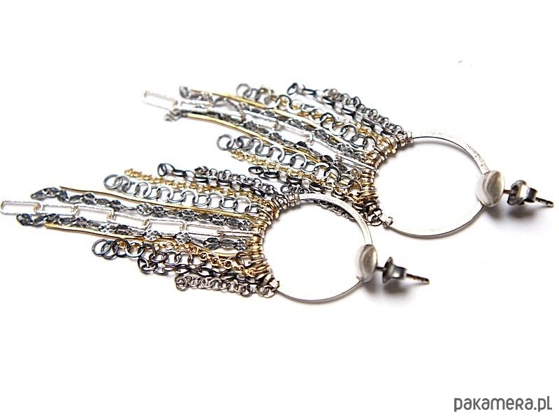 Kolczyki wykonane ze srebra i srebra pokrytego 24k złotem [pr. 925] w kolorze grafitowym, złotym i srebrnym w połączeniu z różnej długości łańcuszkami o różnych wielkościach ogniw. Srebro częściowo oksydowane i przetarte. Średnica kół [20mm]. Całkowita długość kolczyków 8 ,3cm. Biżuteria ozdobnie zapakowana. Do kompletu można dokupić naszyjnik dostępny w naszej galerii - przedstawiony na zdjęciach.
