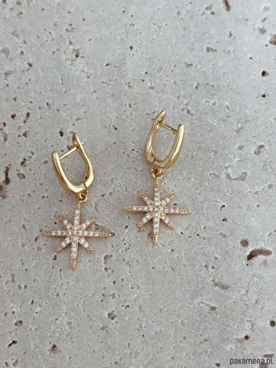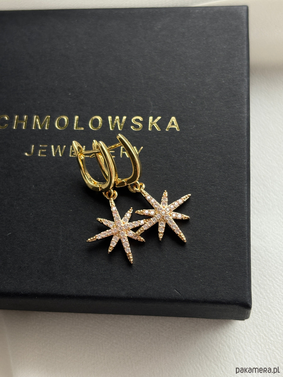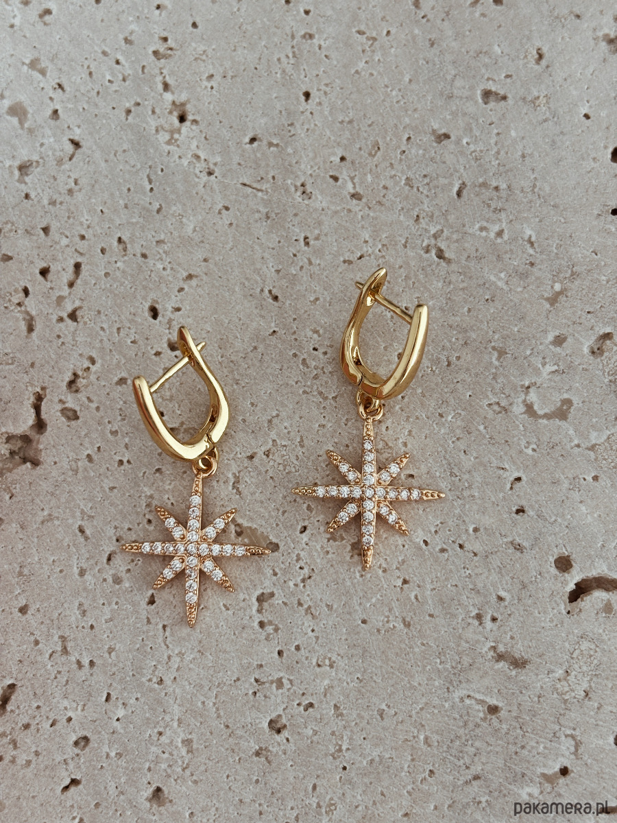 Kolczyki z motywem gwiazdki, ozdobione drobnymi cyrkoniami, które pięknie odbijają światło. Lekka, elegancka forma sprawia, że pasują zarówno na co dzień, jak i na wyjątkowe okazje. Bigle wykonane są z mosiądzu rodowanego złotem.