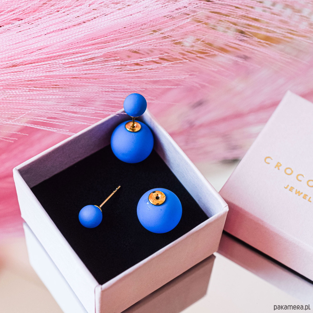Wykonane ze stali szlachetnej, pozłacanej oraz efektownych, niebieskich korali.