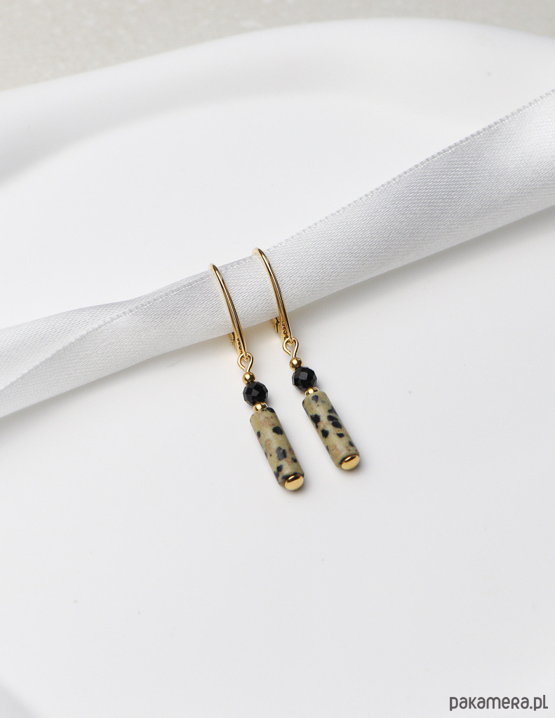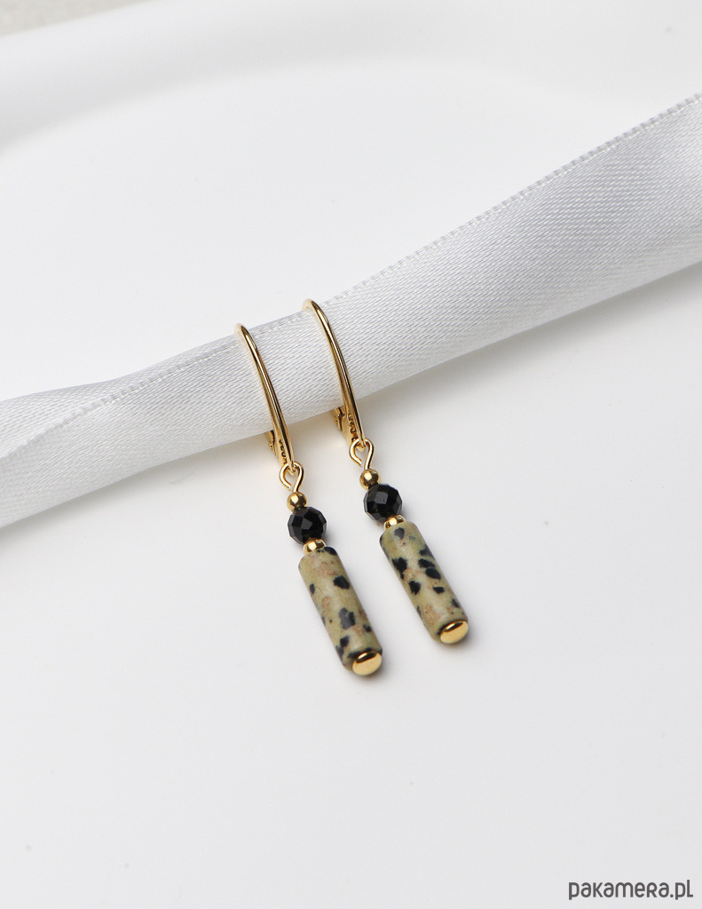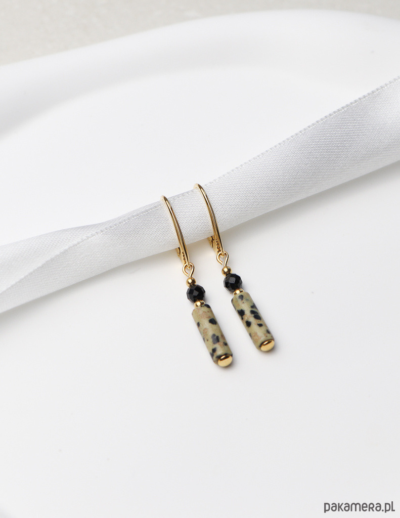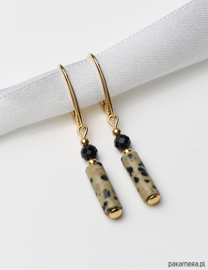 Kolczyki zostały wykonane ze srebra próby 925, pokrytego 24-karatowym złotem, co gwarantuje ich trwałość i piękny wygląd. Na pozłacanym, angielskim zapięciu zawieszono kompozycję z gładkiej belki jaspisu dalmatyńskiego (ok. 4 x 13 mm) oraz fasetowanej kulki czarnego turmalinu (ok. 4 mm). Całości dopełniają drobne, złote kuleczki hematytu (ok. 2,5 mm), które dodają im subtelnej elegancji.