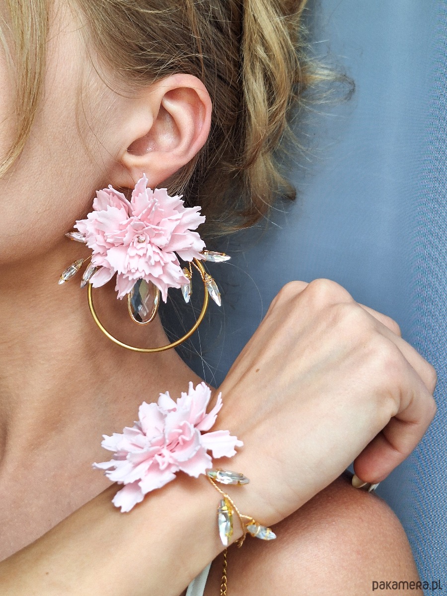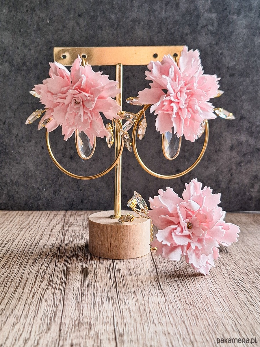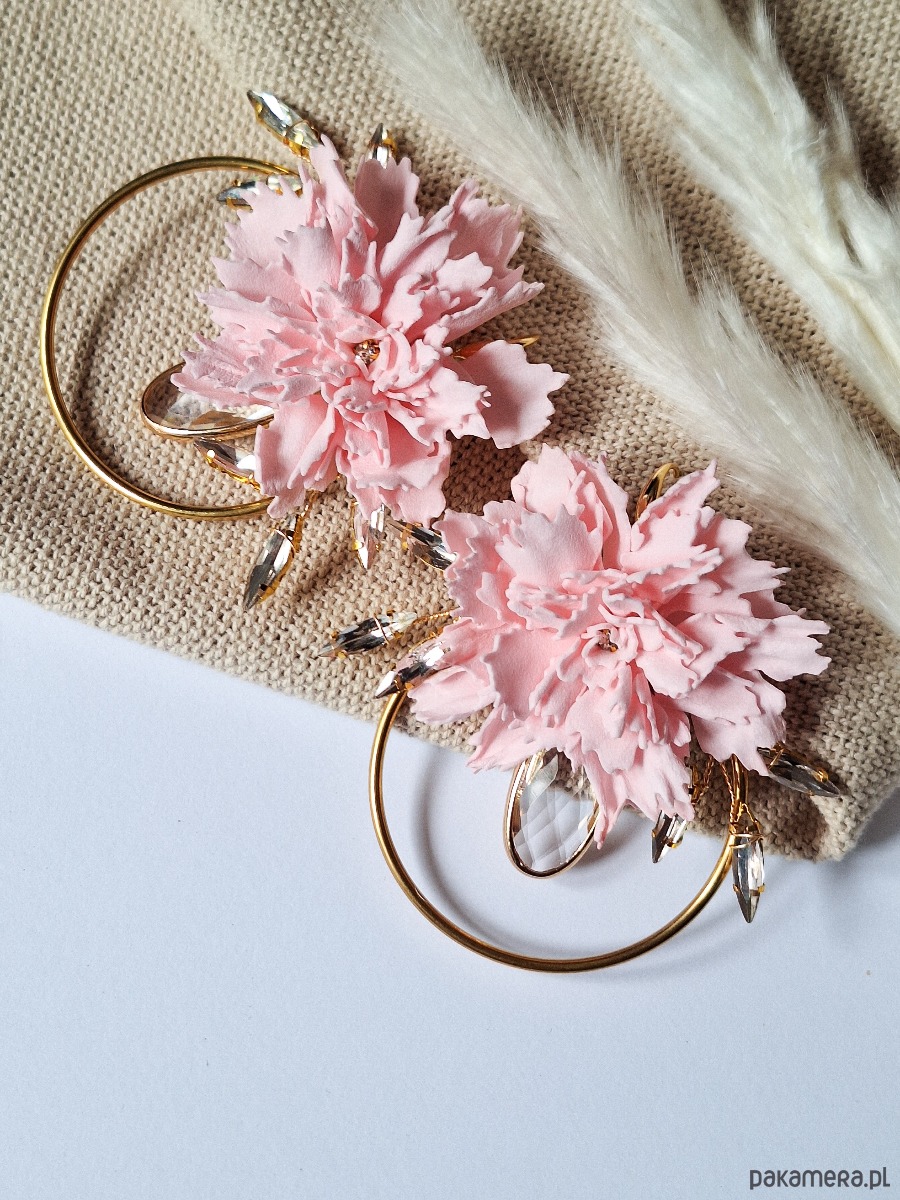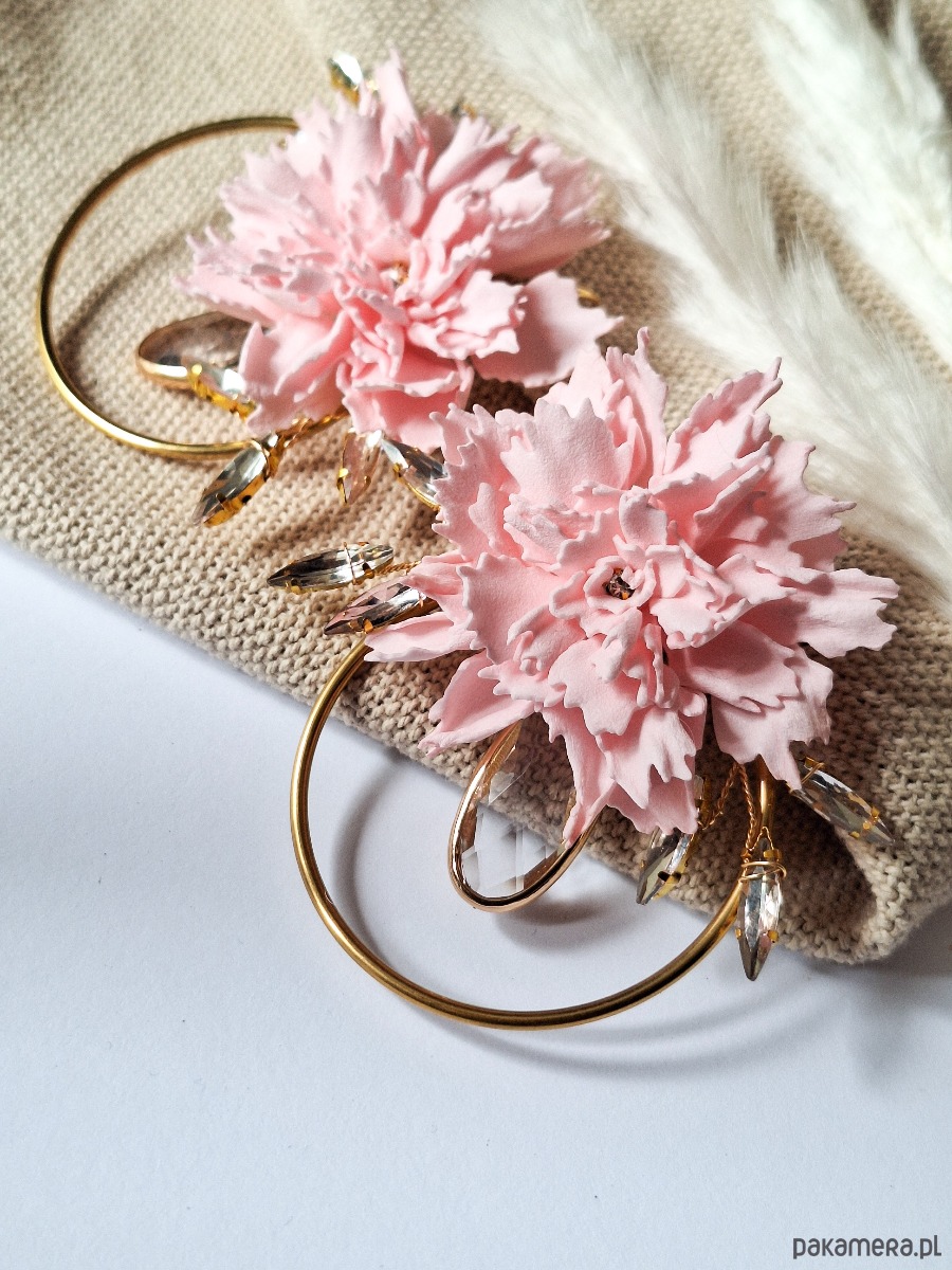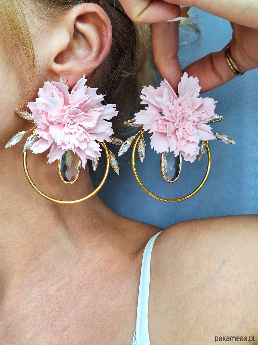 Wyjątkowe kolczyki w formie dużych, ręcznie wykonanych kwiatów goździków w pastelowym różu. Umieszczone na złotych kołach, ozdobione kryształkami o pięknym szlifie, tworzą spektakularny i romantyczny dodatek.