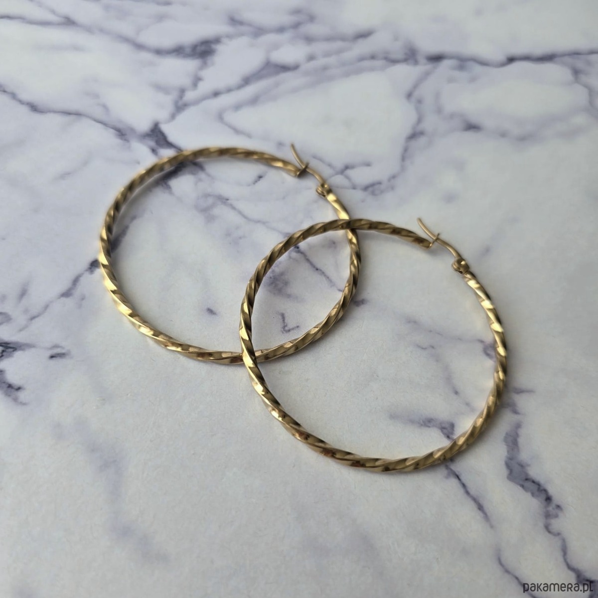Kolczyki koła o wzorze falistym, wykonane w całości ze stali szlachetnej pozłacanej. Biżuteria prezentuje się klasycznie i elegancko.
