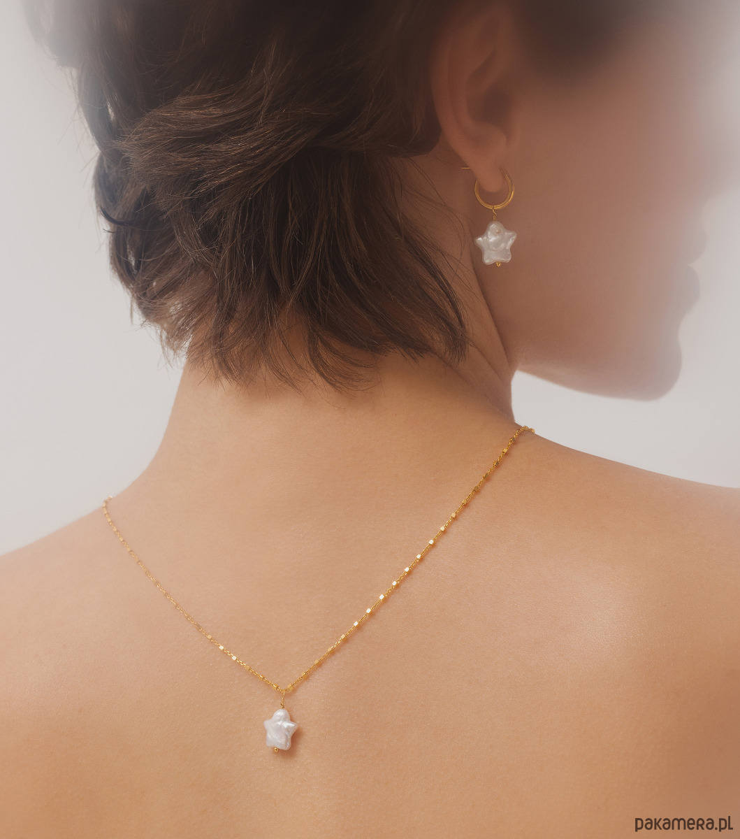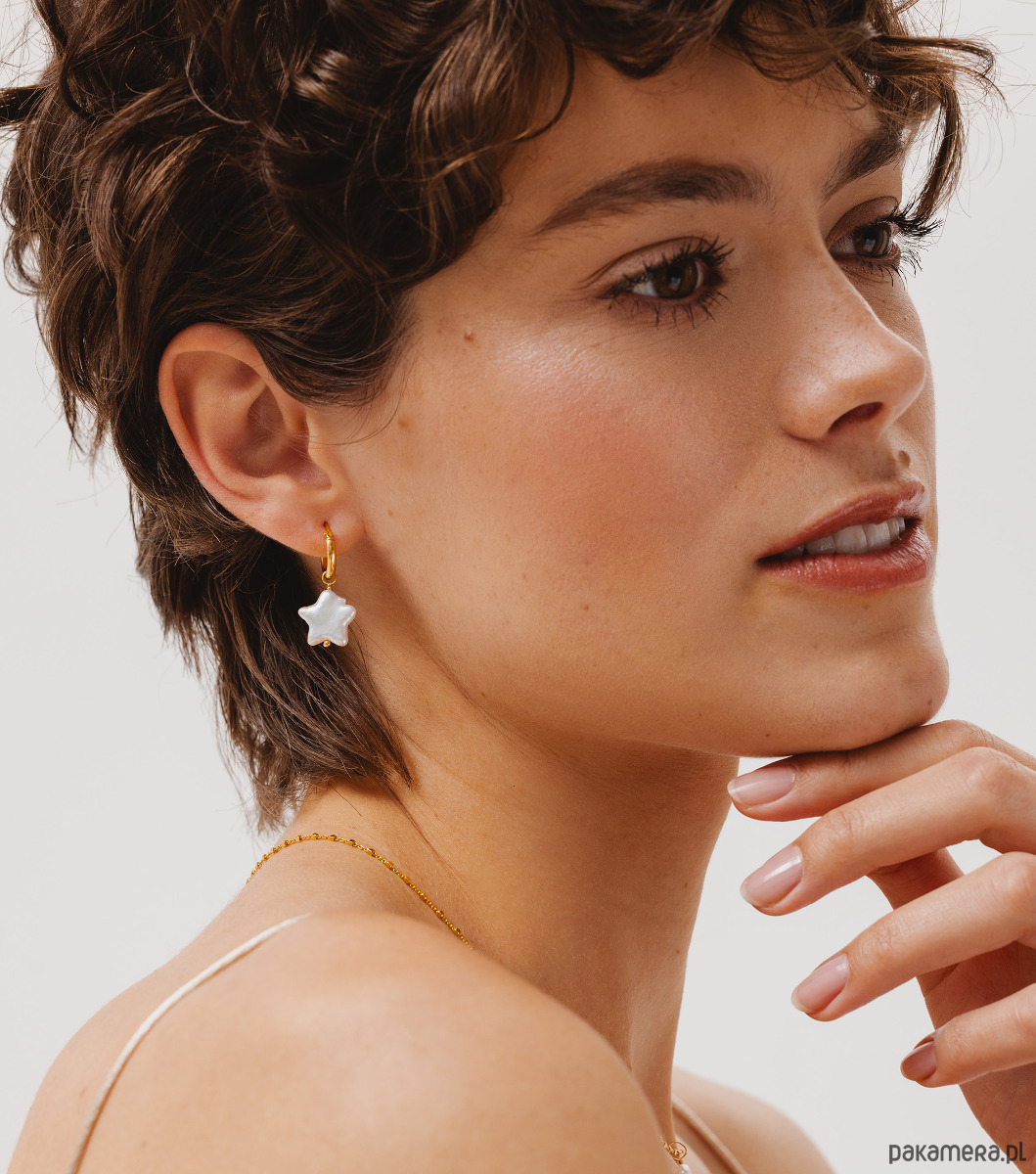 Kobiece i ponadczasowe kolczyki koła, zestawione z unikatowymi perłami w kształcie gwiazdki, wprowadzają odrobinę magii do codzienności. Gwiazdka to symbol nadziei i spełnionych marzeń — subtelny talizman, który warto mieć zawsze blisko. Delikatne i lekkie, doskonale sprawdzą się na co dzień, szczególnie w duecie z miękkim, otulającym swetrem.