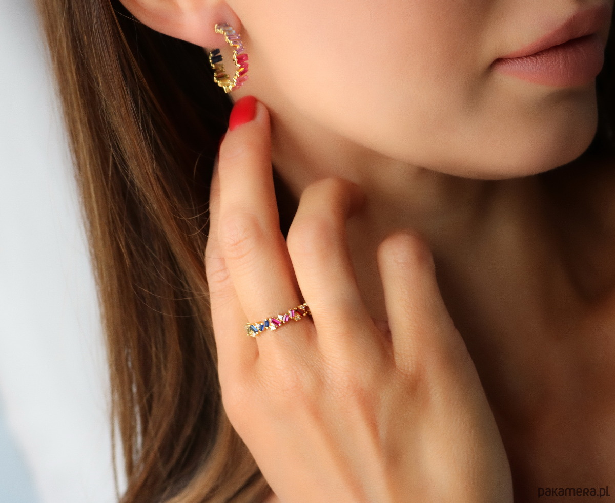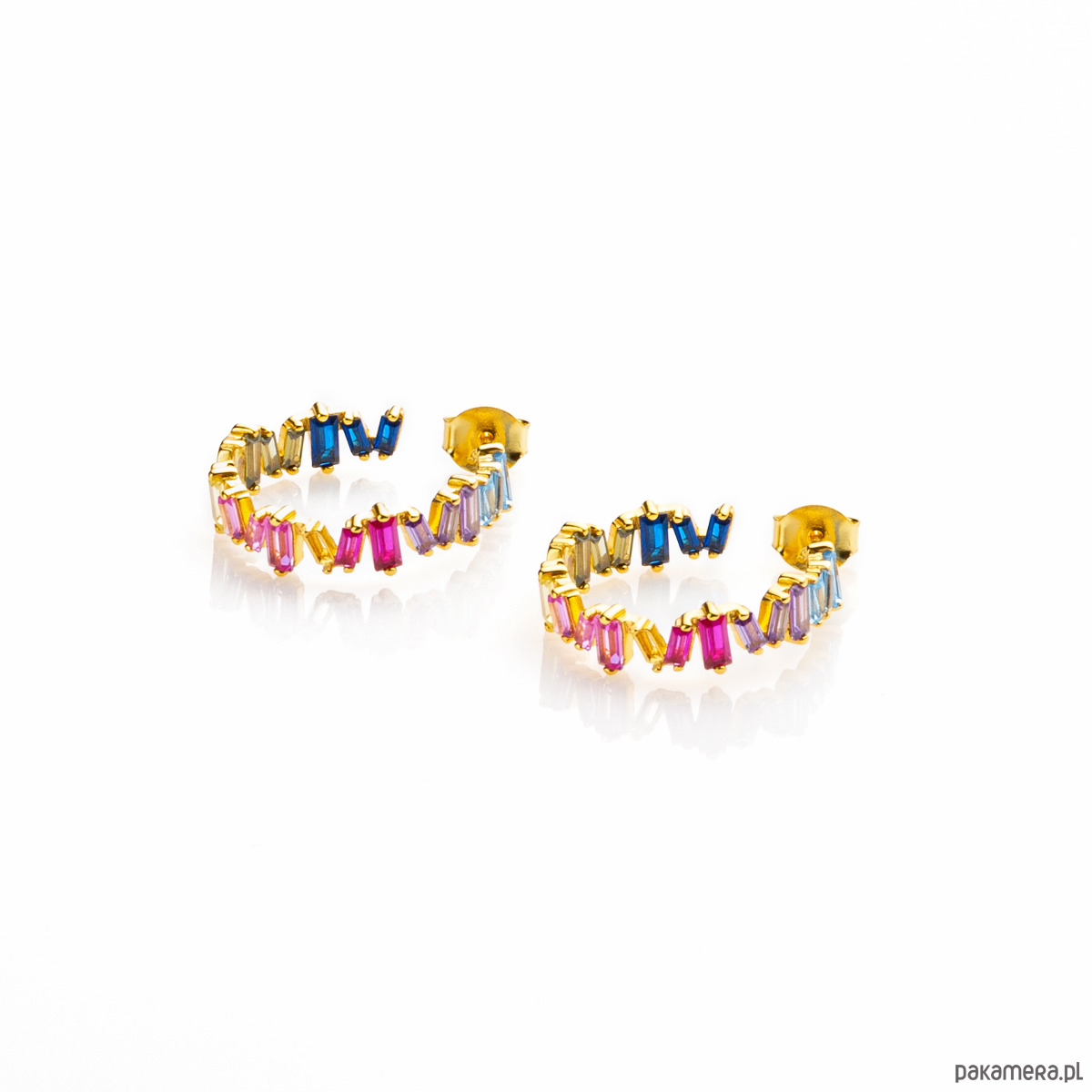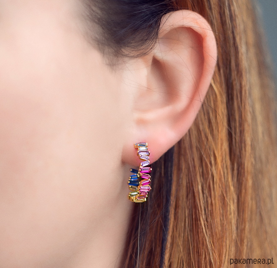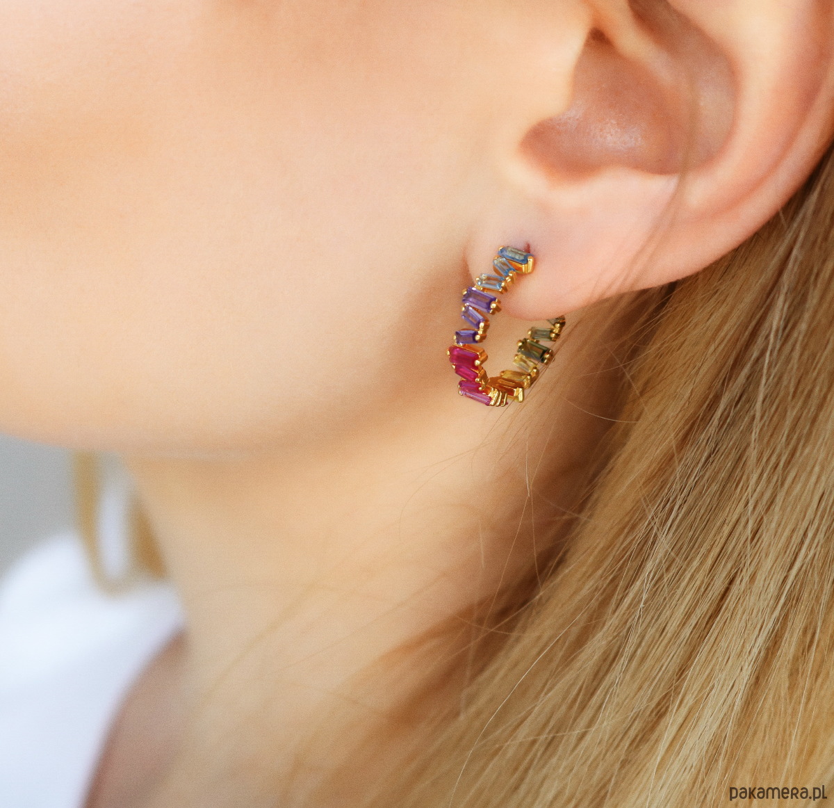 Kolczyki koła ze srebra 925 pozłacanego oraz kolorowymi cyrkoniami bagietami: